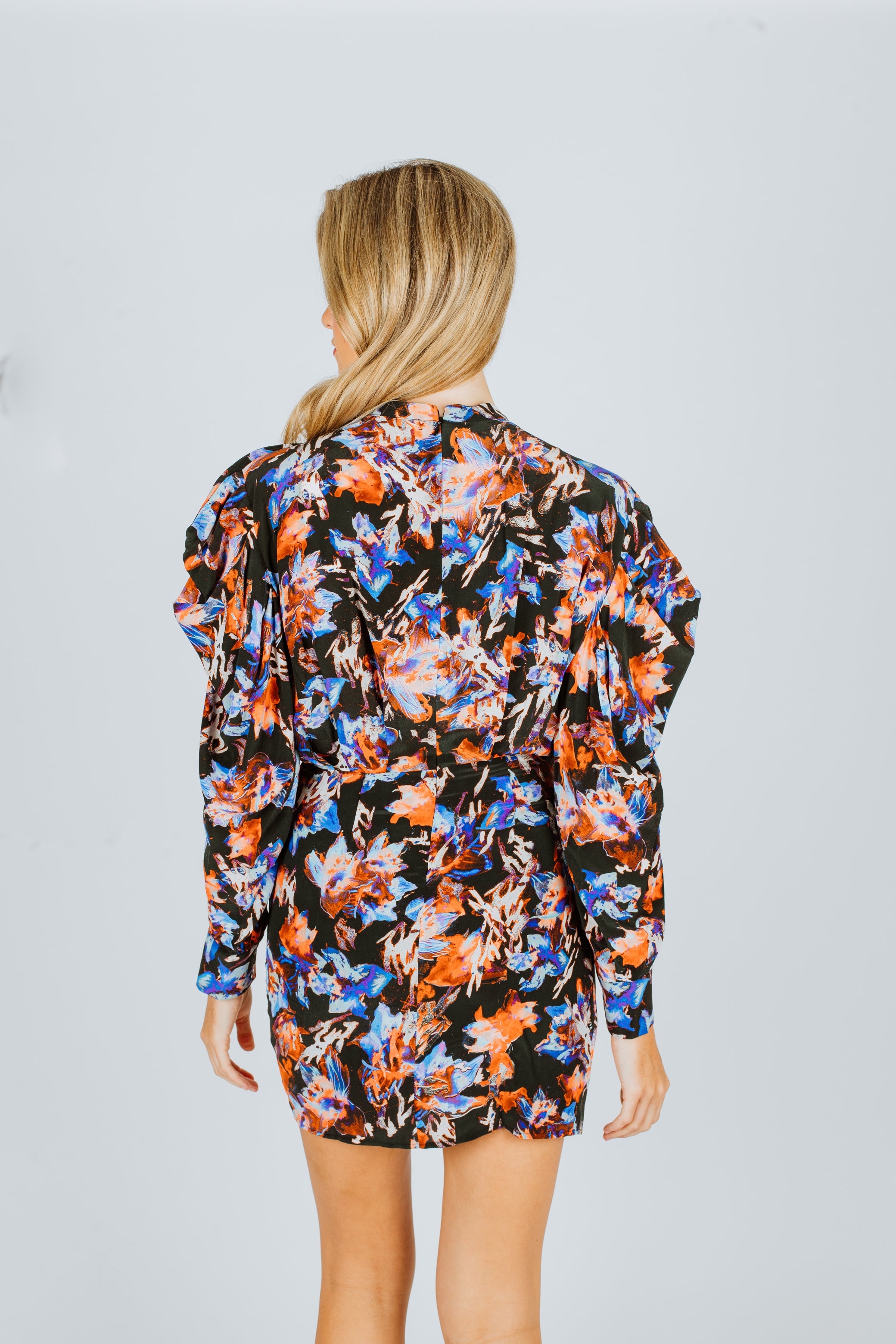 MERERA print mini dress. Round neck and pleating details. Long, wide sleeves.