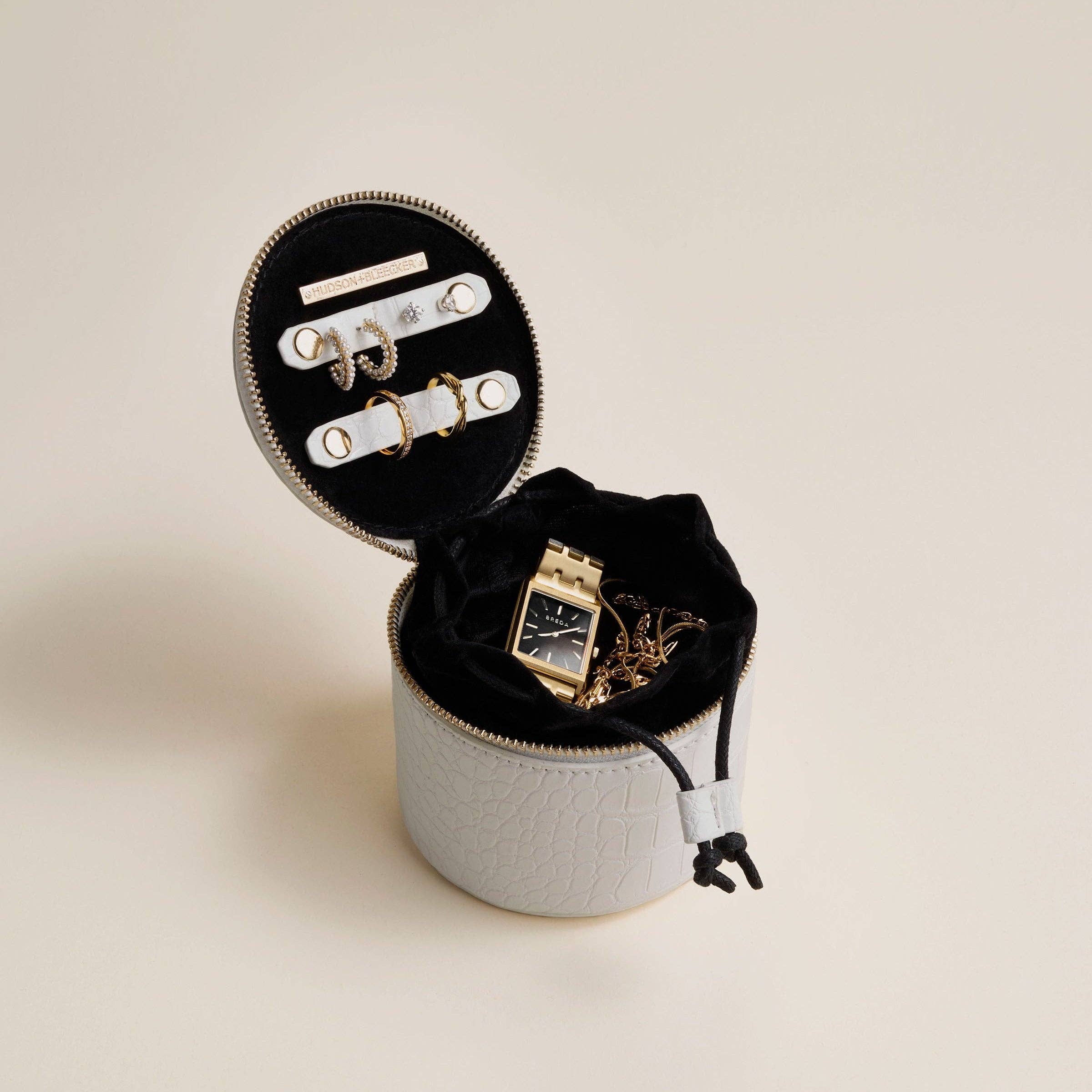 Designed to keep your jewelry organized and secure, this case features a spacious drawstring pocket for watches and statement pieces, along with a designated section for rings and earrings.