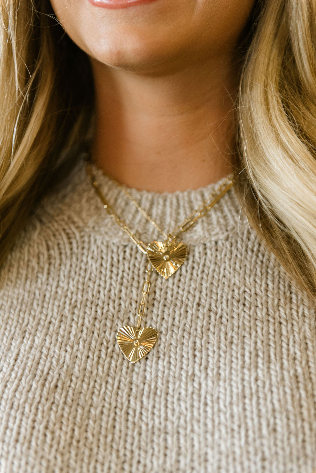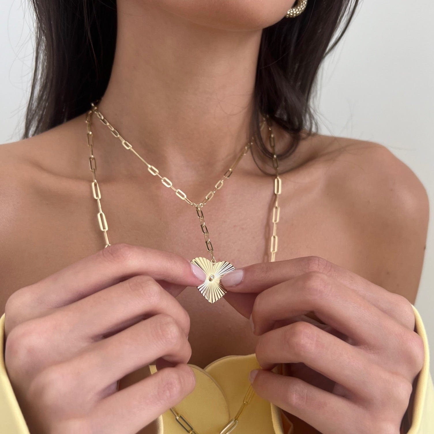 The Jennifer Zuener Sheldon Lariat Necklace captivates with a sparkling diamond accent at the collar and the center of its ridged, heart-shaped pendant. This luminous detail adds a refined touch of elegance, making it the perfect piece to elevate any outfit with subtle sophistication and shine.