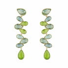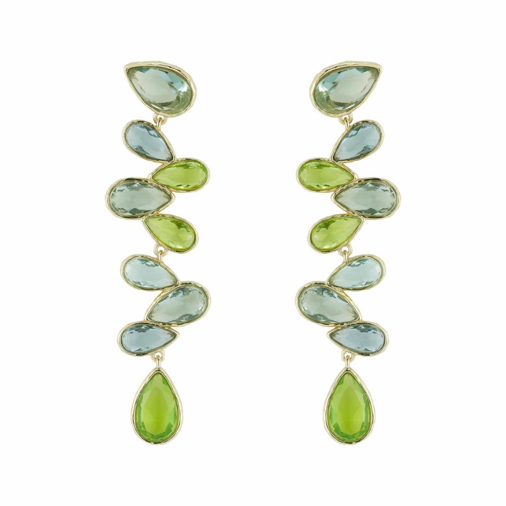 The Mignonne Gavigan Kali Earrings in Green Blue feature faceted crystals in vibrant peridot green and soft blue, arranged in a sleek linear drop. This design captures light beautifully, adding movement and a modern touch of elegance to elevate any outfit with effortless style.