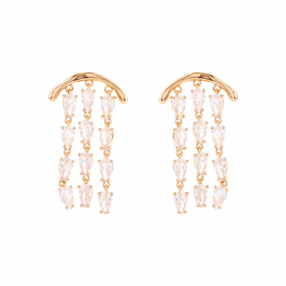Add some sparkle to your outfit with our Rio Earrings! The pear-shaped crystals delicately dangle from a gold bar, creating a mesmerizing effect. Inspired by beach cottages, these earrings exude a carefree and whimsical vibe.