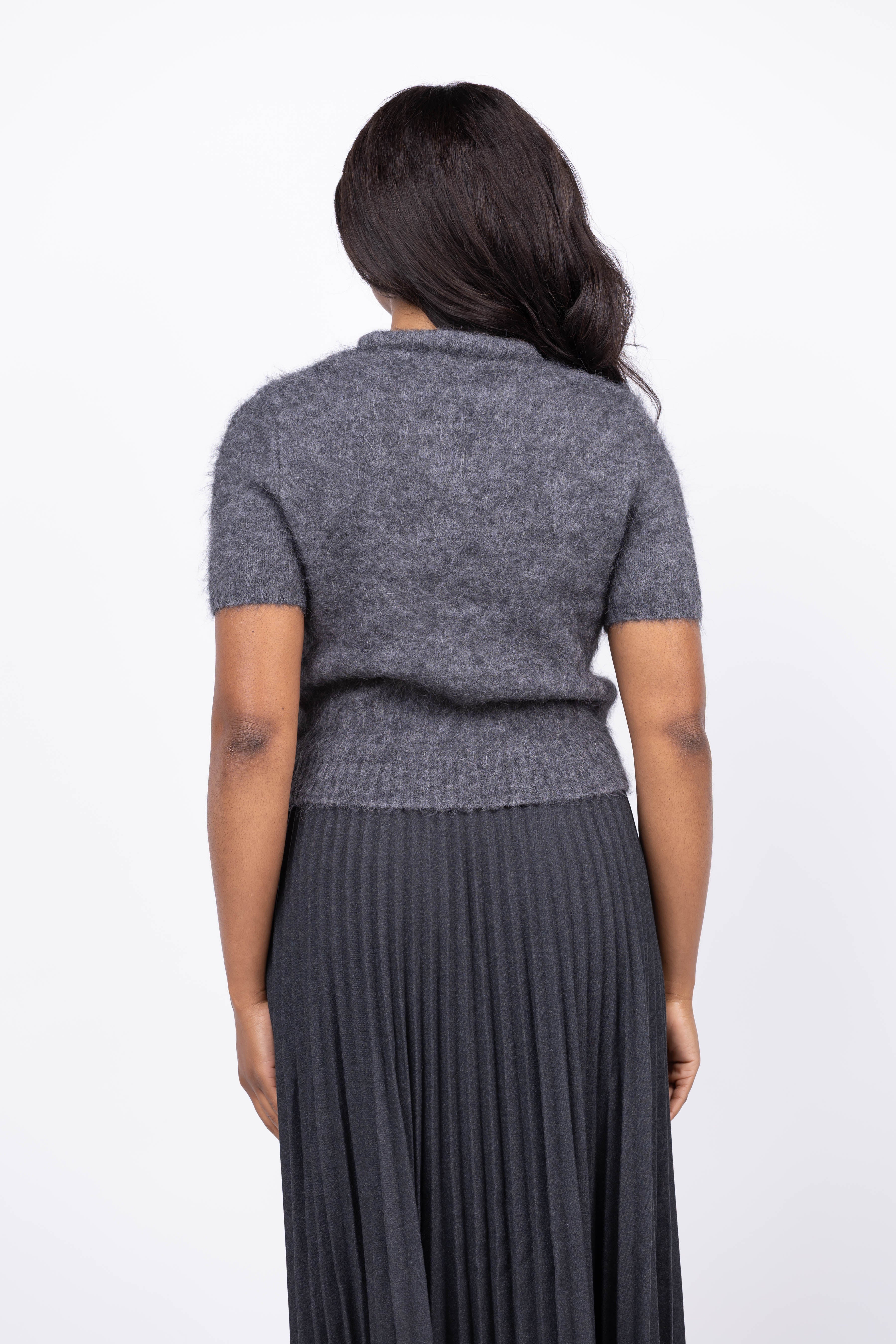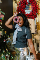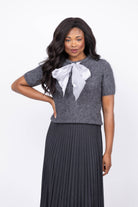 The Milly Bow Fuzzy Sweater in Smoke combines cozy comfort with a standout satin bow at the neckline. Its short sleeves make it perfect for layering or wearing alone. Pair it with sleek trousers to create a refined desk-to-dinner ensemble, or match it with denim for a relaxed yet polished weekend look. This versatile sweater adds a stylish edge to your wardrobe effortlessly.