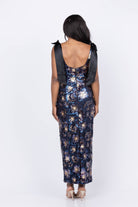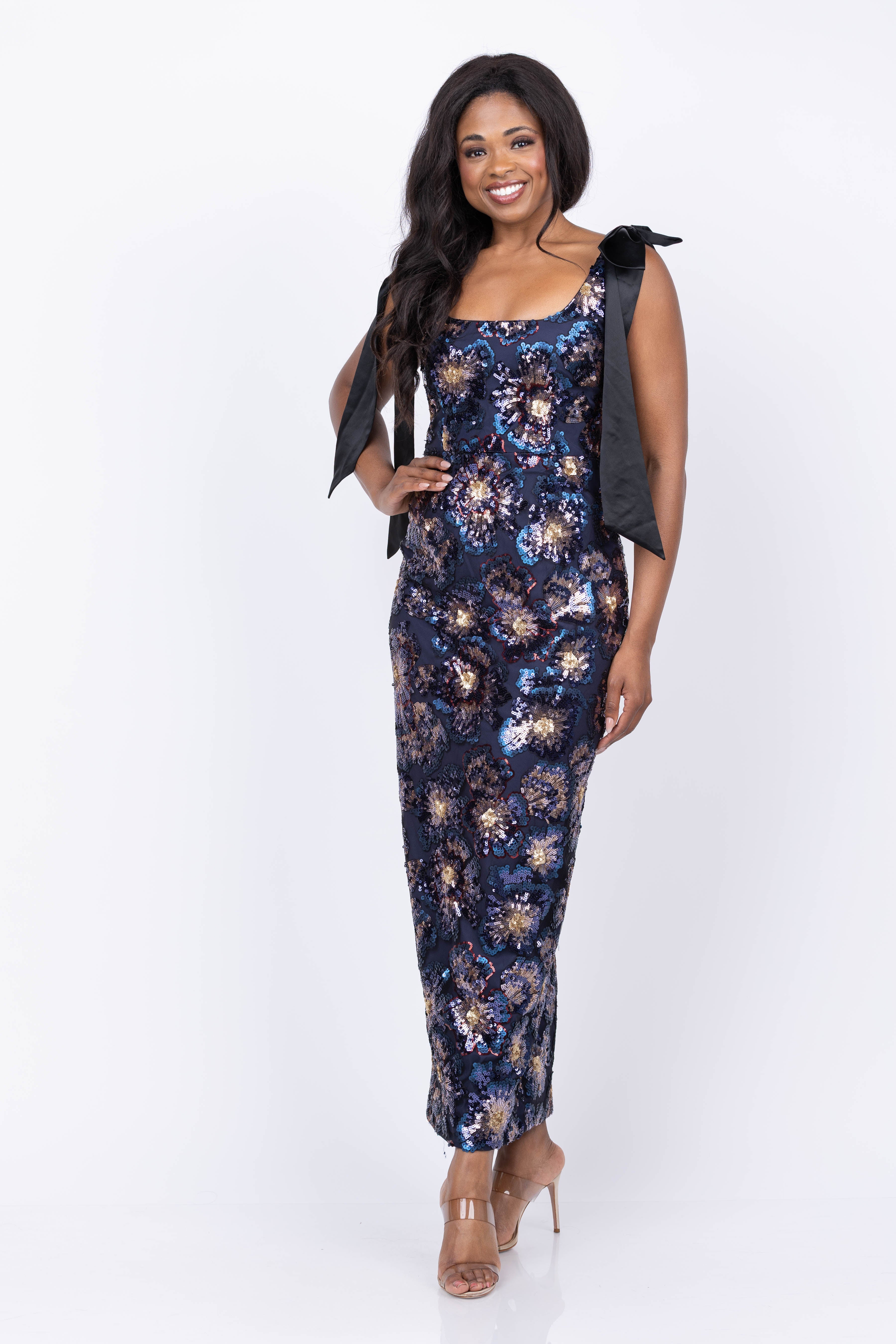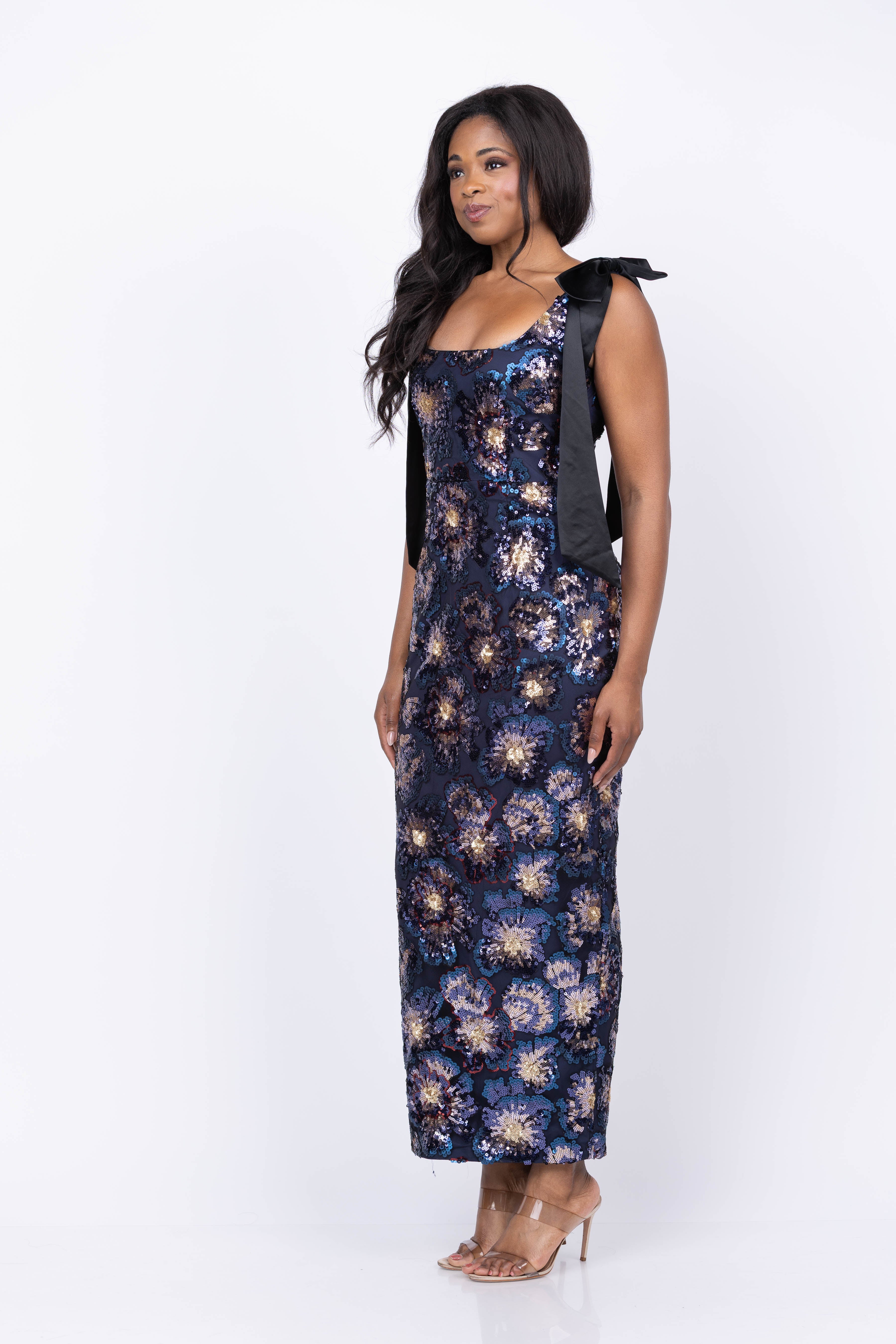 Elevate your evening wardrobe with this stunning sleeveless column dress, where intricate floral sequins create an unforgettable shimmer that commands attention. The elegant satin bow shoulder straps add a touch of refined sophistication, making this the ultimate choice for black-tie galas, holiday celebrations, and formal occasions where you want to make a lasting impression. Timeless elegance meets modern glamour in this show-stopping piece.