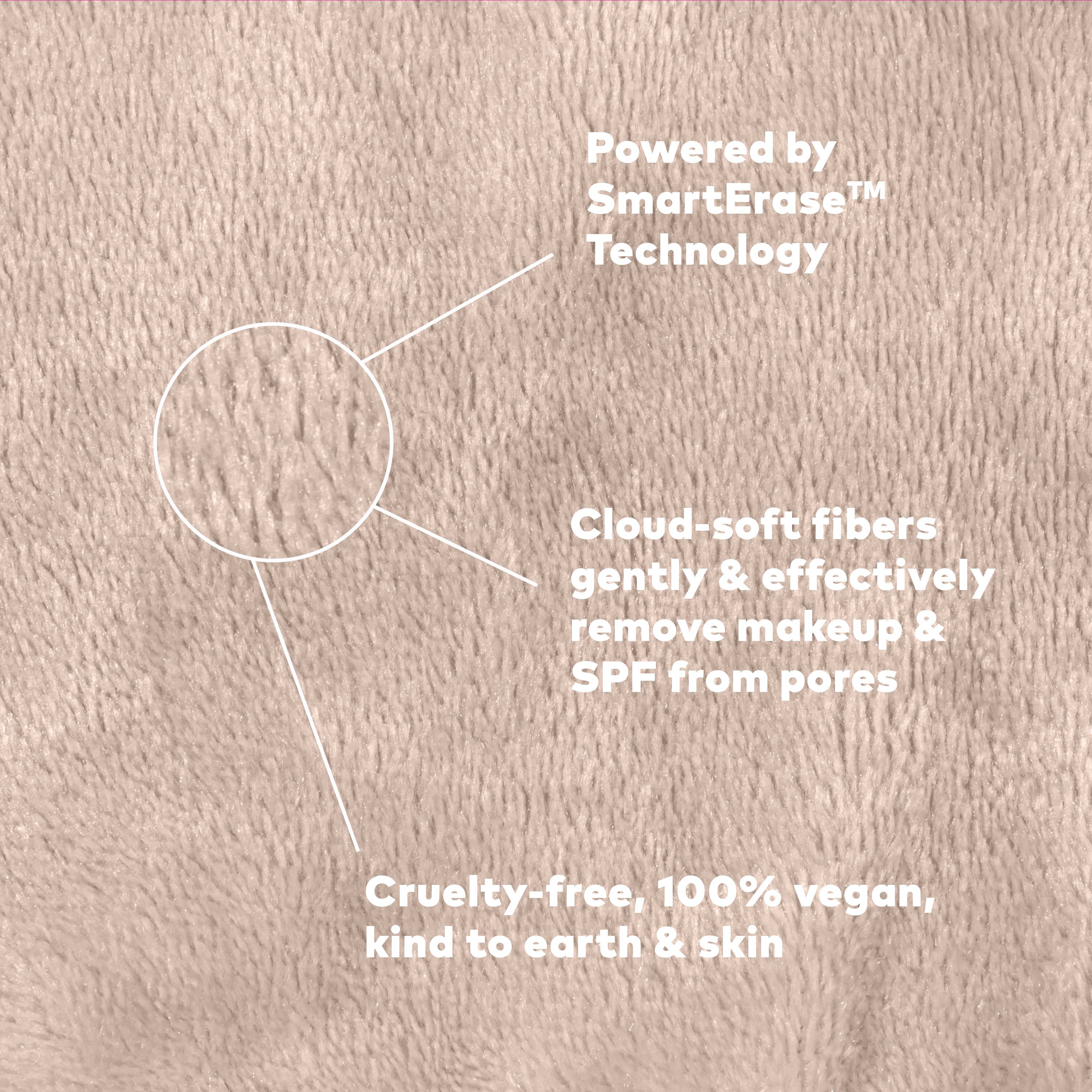Erase all makeup with JUST WATER™ including waterproof. Our patented, water-activated, cloud-soft fibers gently & easily remove all makeup & sunscreen from pores. 2 in 1 benefit: one side erases makeup & one side exfoliates skin.