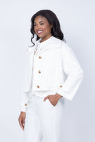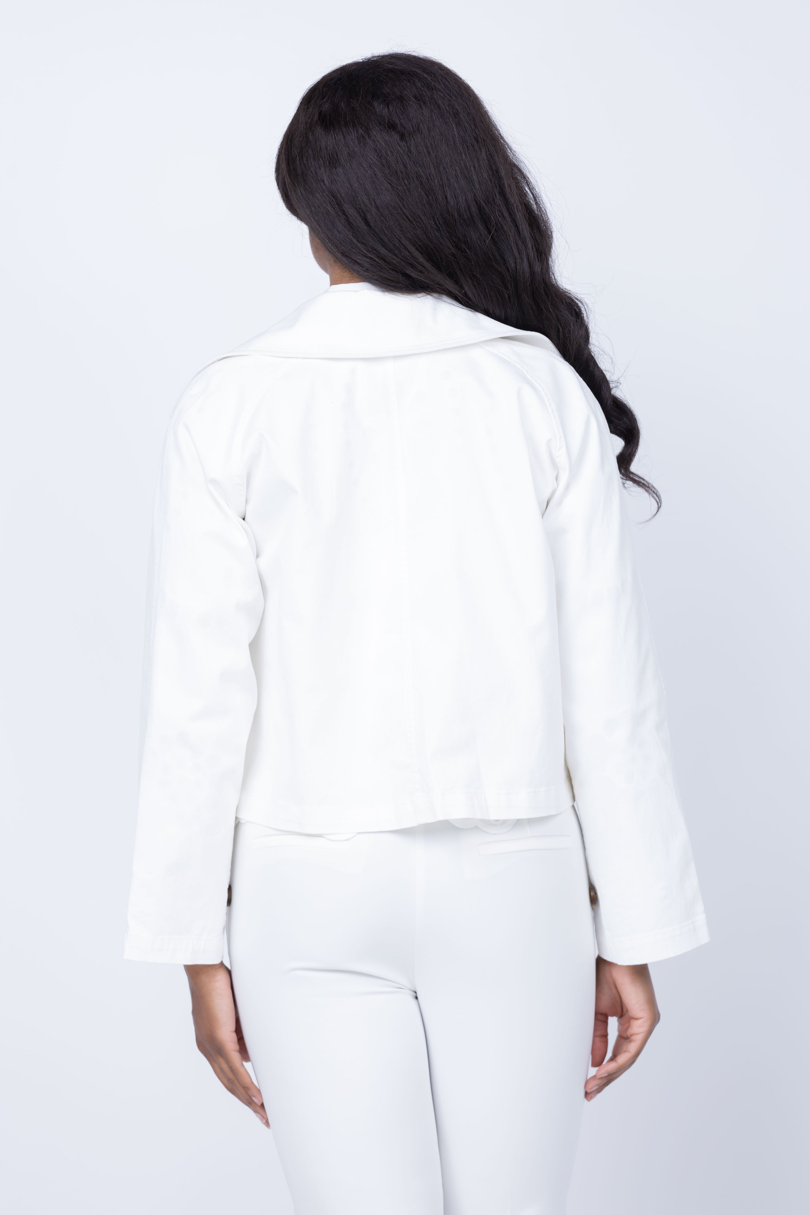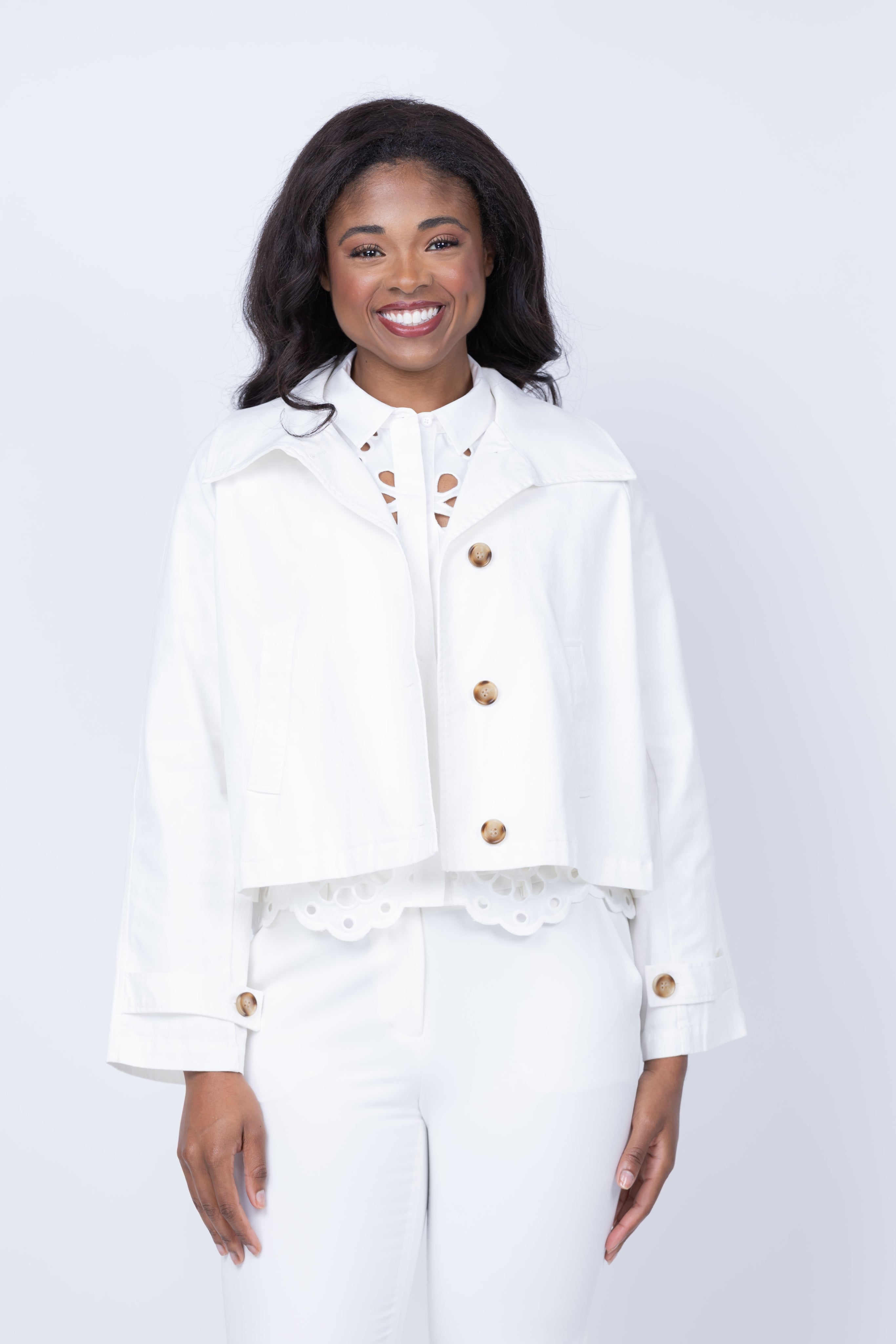 Elevate your spring wardrobe with this crisp white cropped trench jacket. The tailored silhouette offers a modern take on a classic style, making it an ideal layering piece for transitional weather. Versatile enough to pair with dresses, jeans, or skirts, this jacket adds polish and structure to any outfit. Perfect for creating effortless, put-together looks from season to season.