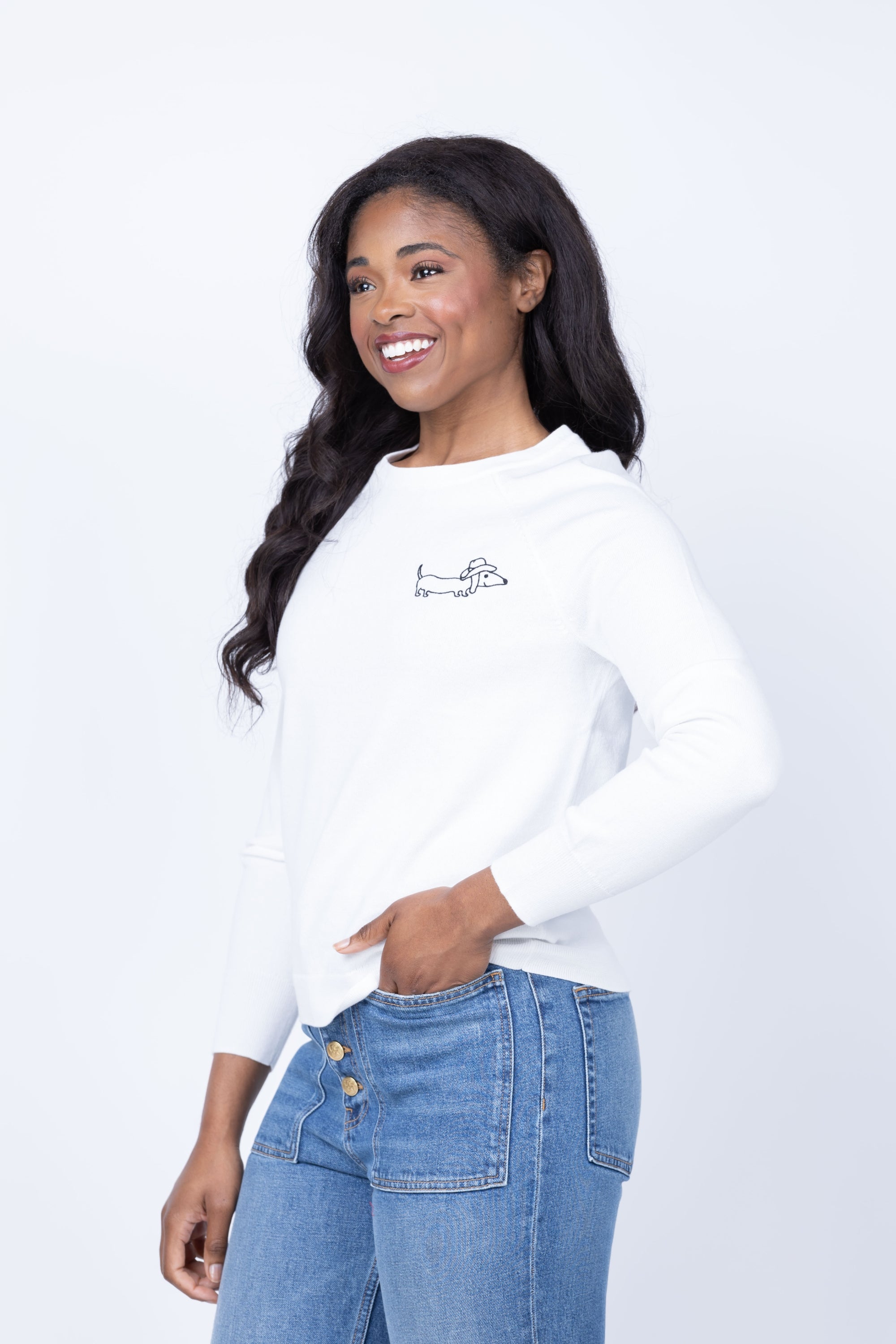 Celebrate your love for dachshunds with this playful white long sleeve crew top from J. Society. Featuring an adorable dachshund design on the right chest, this tee brings a fun, quirky vibe to your everyday wardrobe. Perfect for dog lovers who want to showcase their personality with style and comfort.