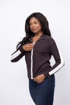 Elevate your casual wardrobe with the J. Society Single Stripe Zip Front Jacket in Chocolate. Featuring a sleek stripe down the front, this jacket combines effortless style with everyday comfort. Its versatile design makes it the perfect layering piece for laid-back outings, adding a subtle yet trendy edge to any outfit. Stay cozy and cute while showcasing a modern look that fits seamlessly into your lifestyle.