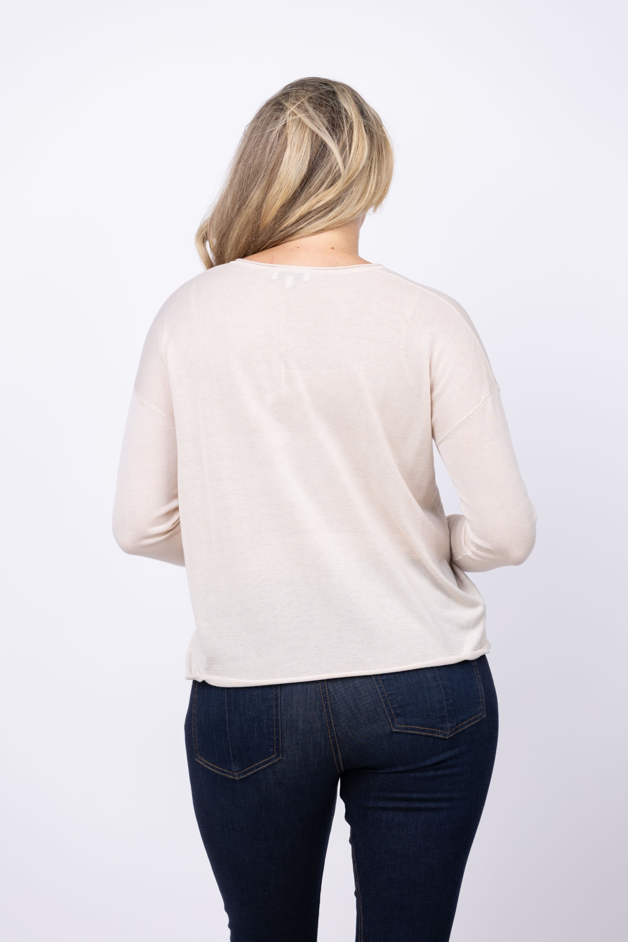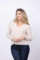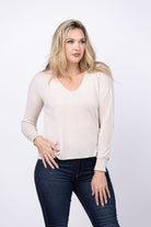 The J. Society V-Neck in Sand offers a sleek, slightly v-neck design that flatters every neckline. Its long sleeves provide comfortable coverage, making it perfect for layering under jackets or wearing on its own for a clean, polished look. Crafted for versatility, this top effortlessly adapts to your style needs, whether you're dressing up or keeping it casual. Elevate your wardrobe with this essential piece that combines simplicity and sophistication.