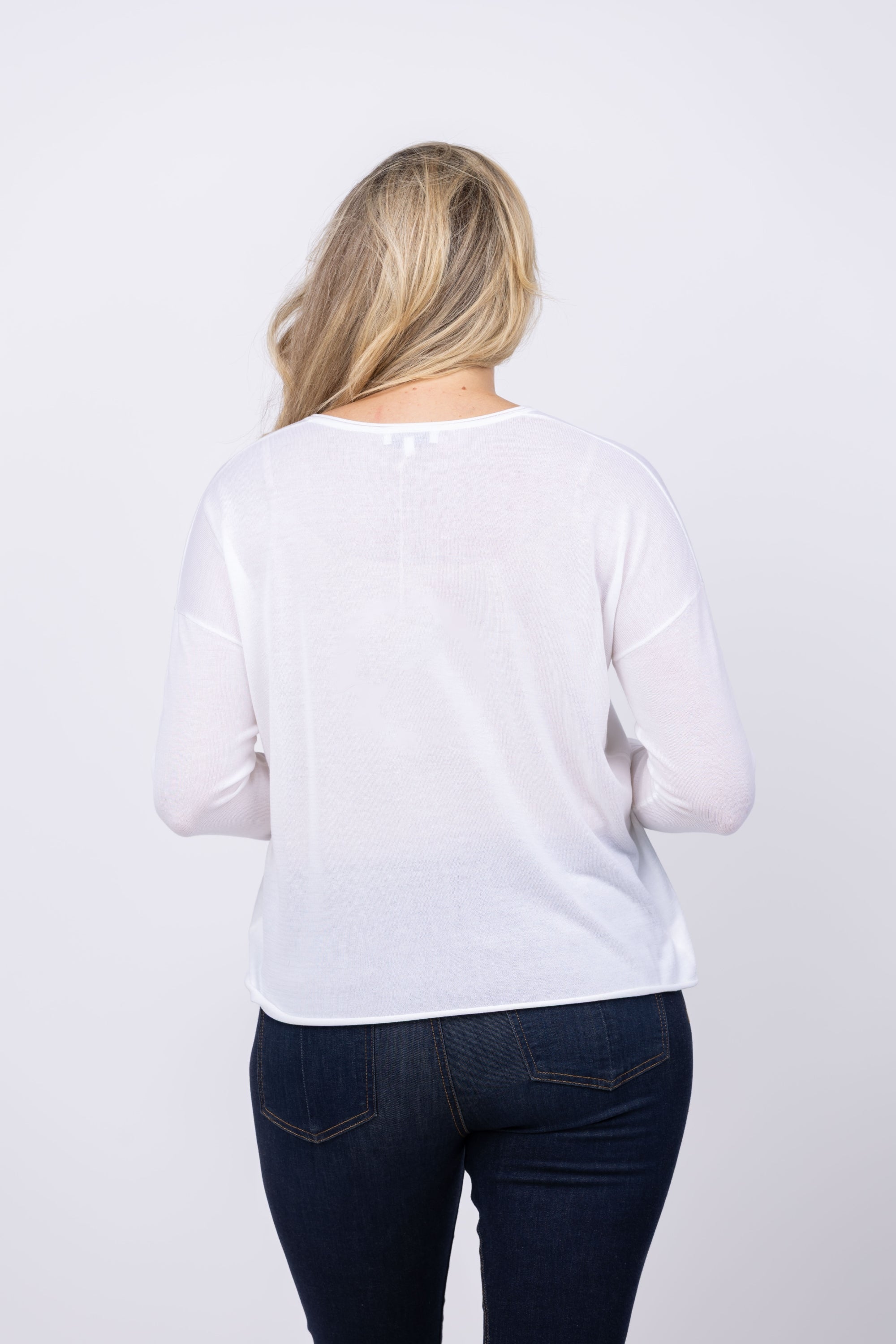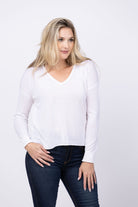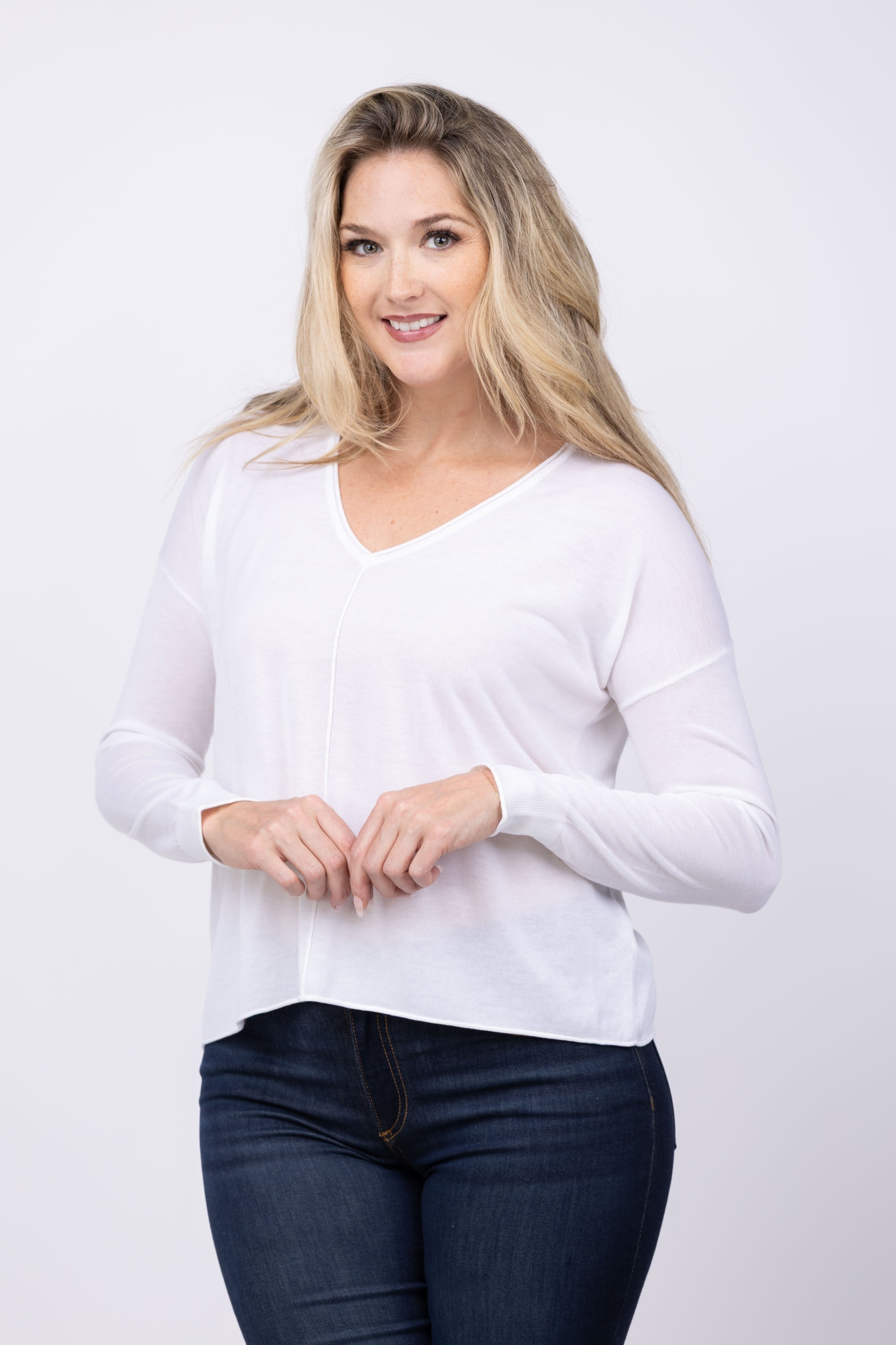 The J. Society V-Neck in White offers a sleek, slightly v-neck design that flatters every neckline. Its long sleeves provide comfortable coverage, making it perfect for layering under jackets or wearing on its own for a clean, polished look. Crafted for versatility, this top effortlessly adapts to your style needs, whether you're dressing up or keeping it casual. Elevate your wardrobe with this essential piece that combines simplicity and sophistication.