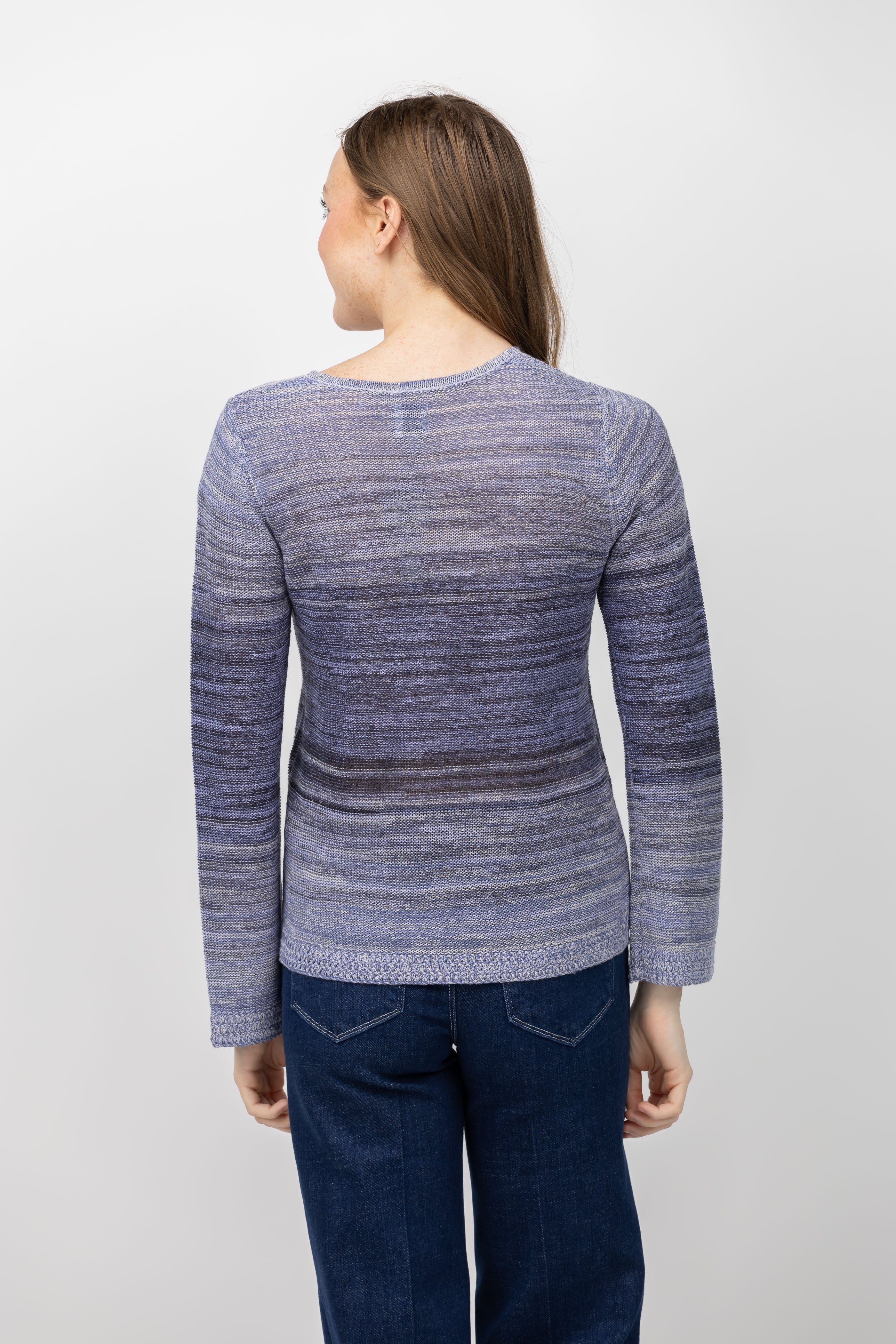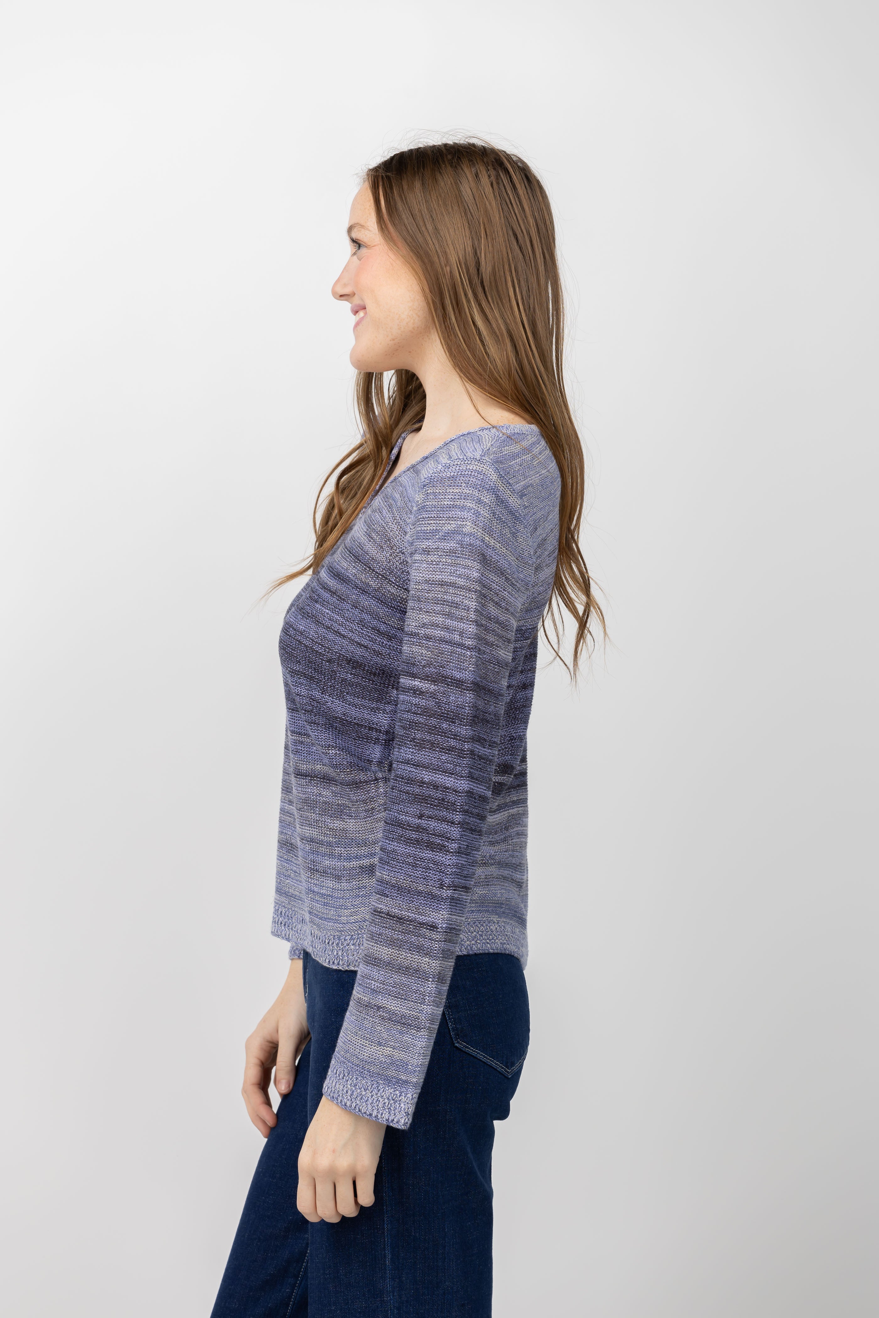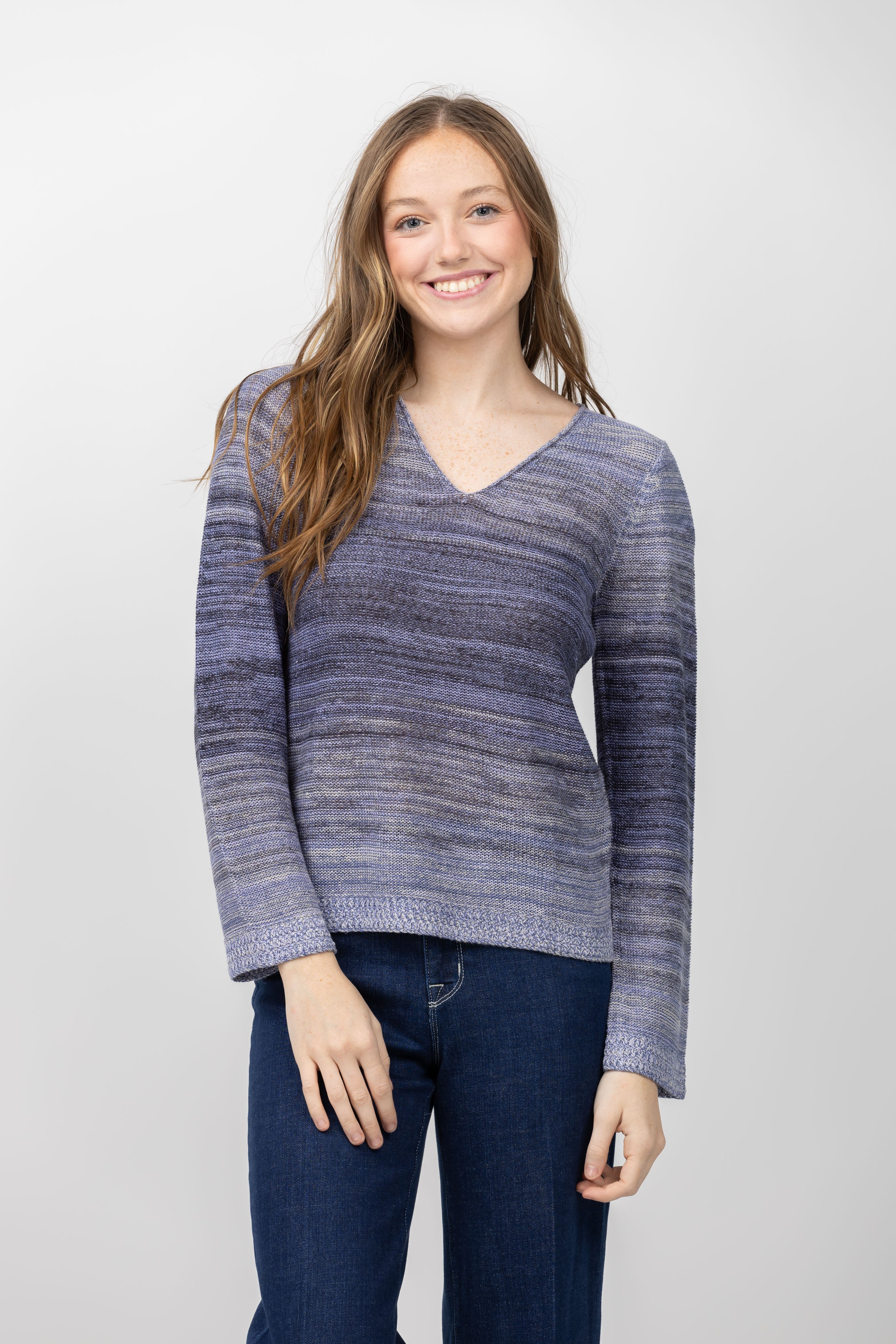 Elevate your style with Nic + Zoe's Hazy Shades sweater. Made of a soft linen blend, this V-neck pullover features an ombre effect and technical stitch details for a modern look. Faux crochet accents on the hem and sleeves add a touch of boho-chic. Mindfully made from no-waste knitwear, it's perfect for year-round wear.