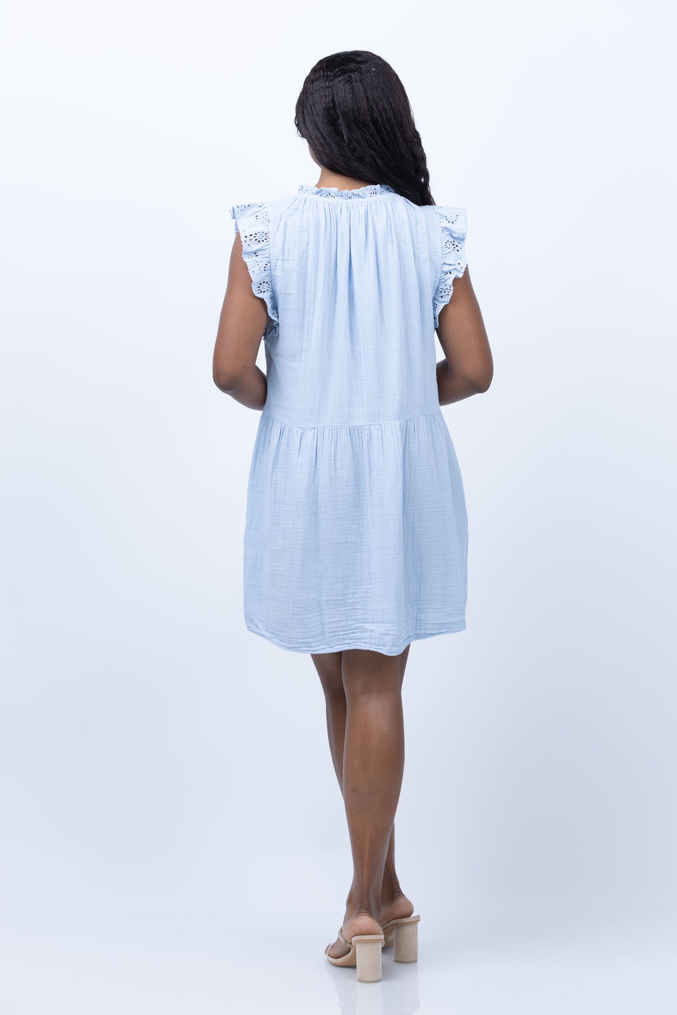 Introducing the Velvet Grace Dress in Island! Made with lightweight, breathable cotton gauze and adorned with charming eyelet flutter sleeves, this dress is perfect for warm weather. The elastic neckline adds a playful touch and the v-neckline with keyhole closure adds elegance. With a single tiered design and functional inseam pockets, this dress combines style and practicality.