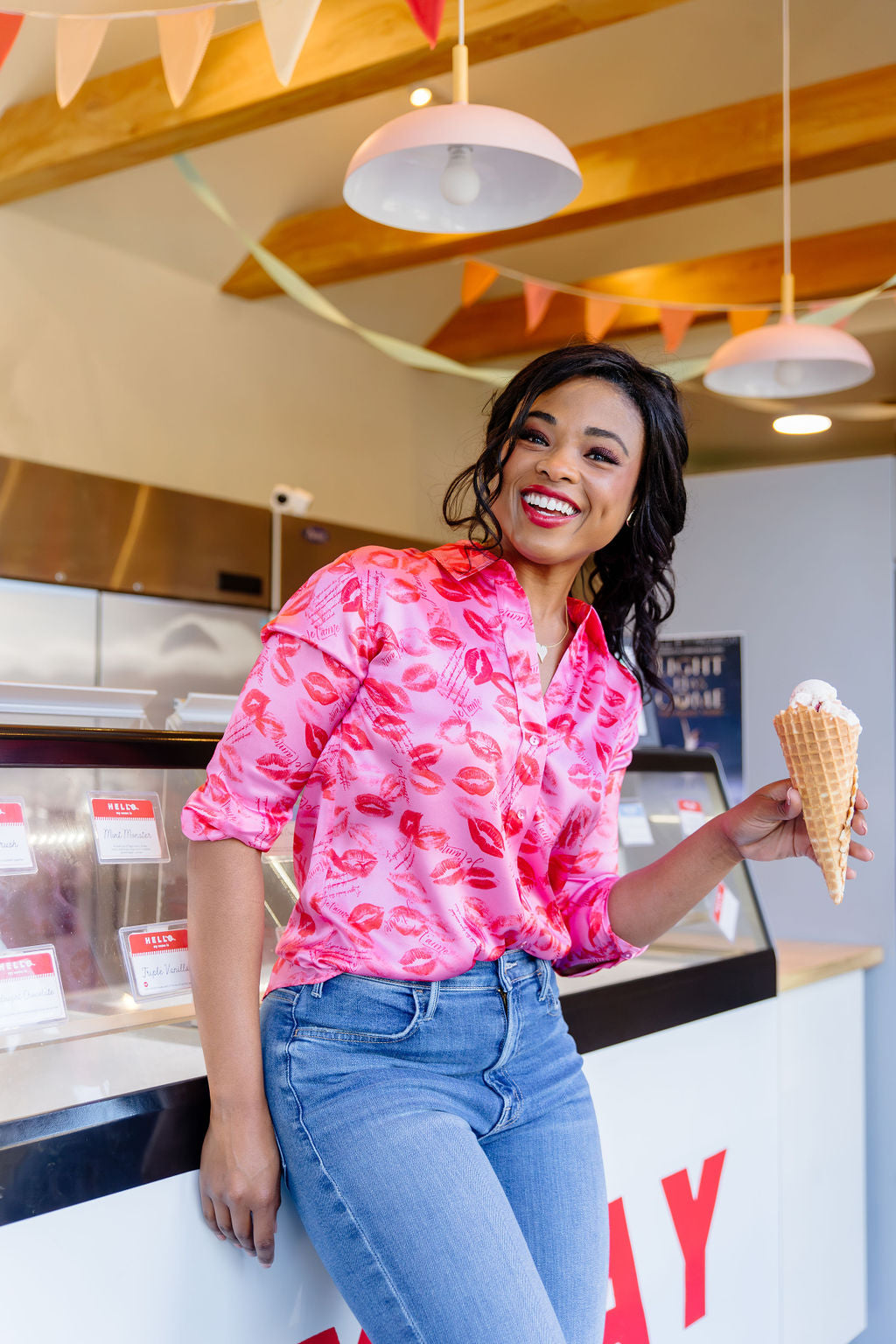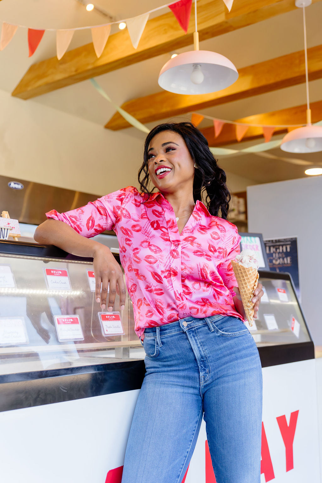 Introducing our iconic silk button-down in a romantic lipstick print, complete with love notes in French. The L'AGENCE Dani Blouse boasts a playful 3/4 sleeve and versatile style, perfect for any wardrobe. Say oui to this charming piece.
