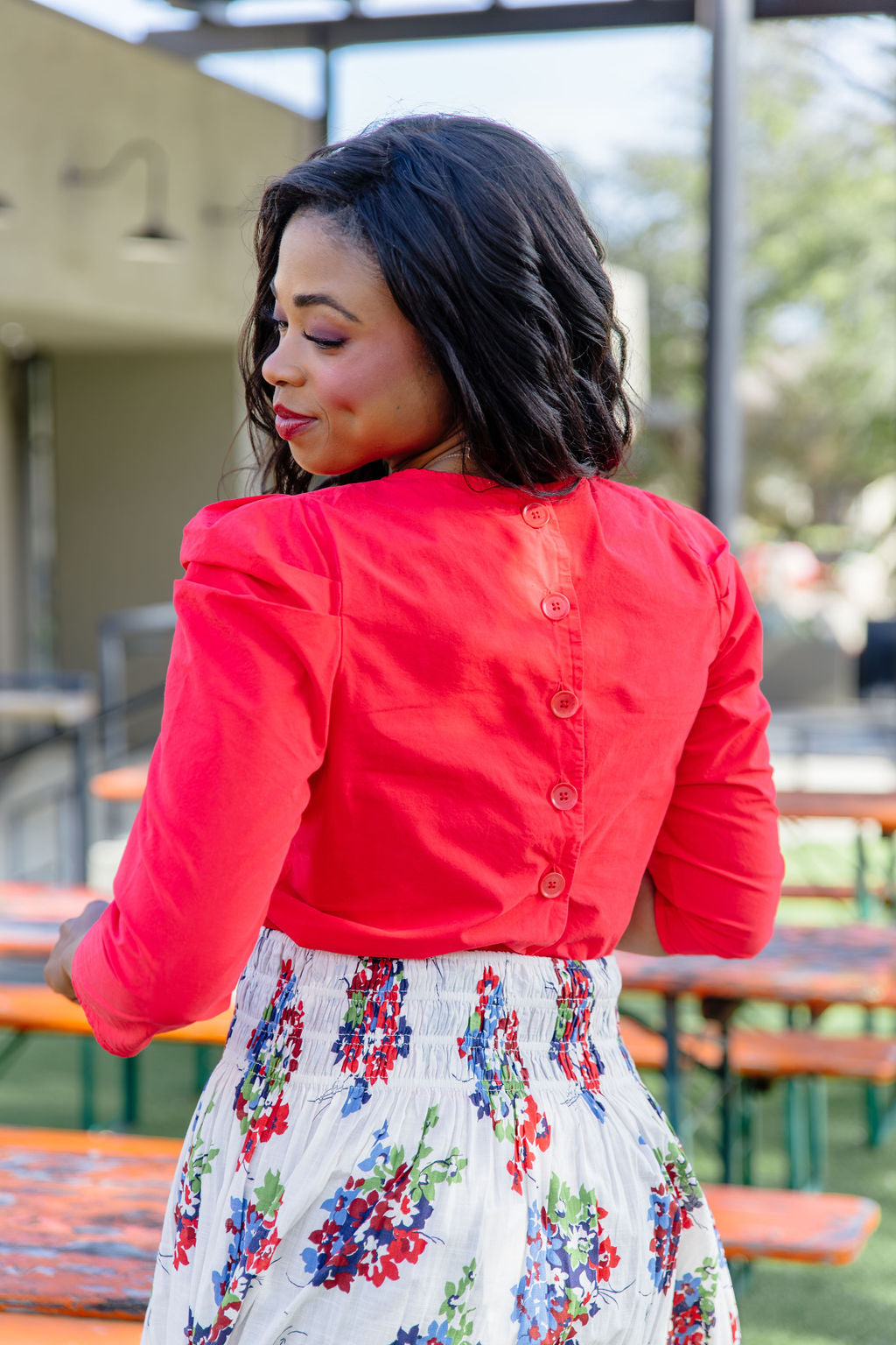 Elevate your style with the Nation Ltd Elouise Top in Red Shoes. This eye-catching blouse boasts bold puff sleeves with knife pleat details, making you the center of attention without even trying. Functional button back closure adds a touch of sophistication. Stand out from the crowd and feel confident in your fashion choices.