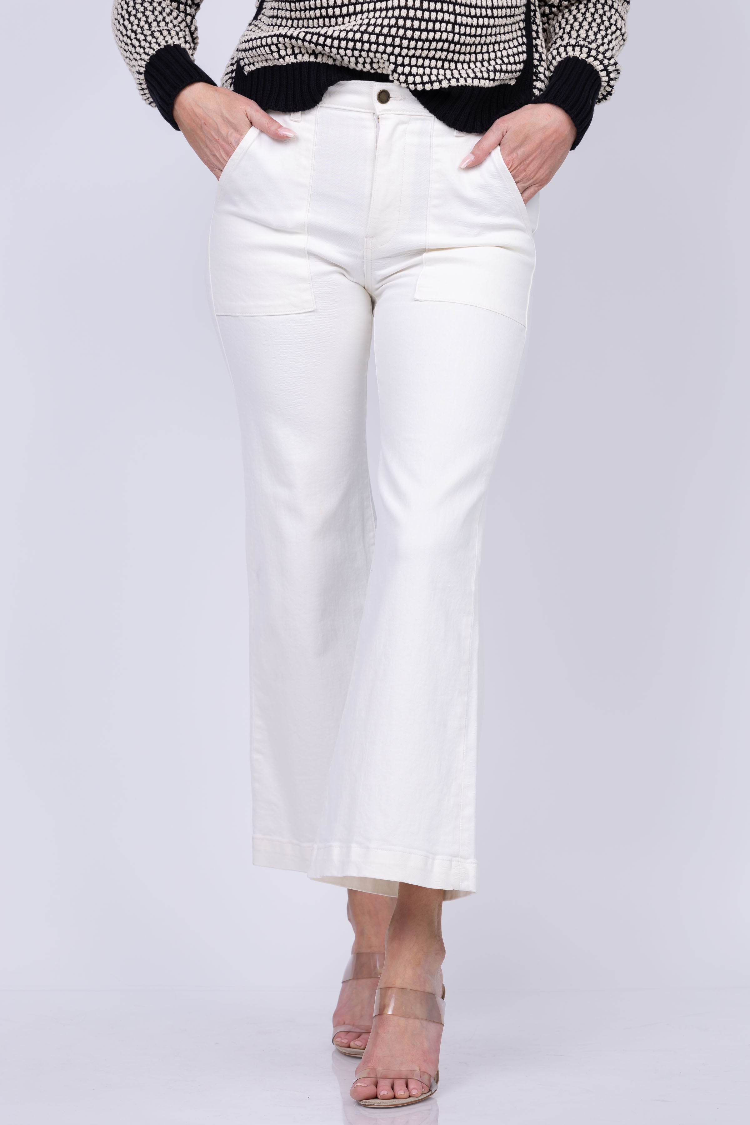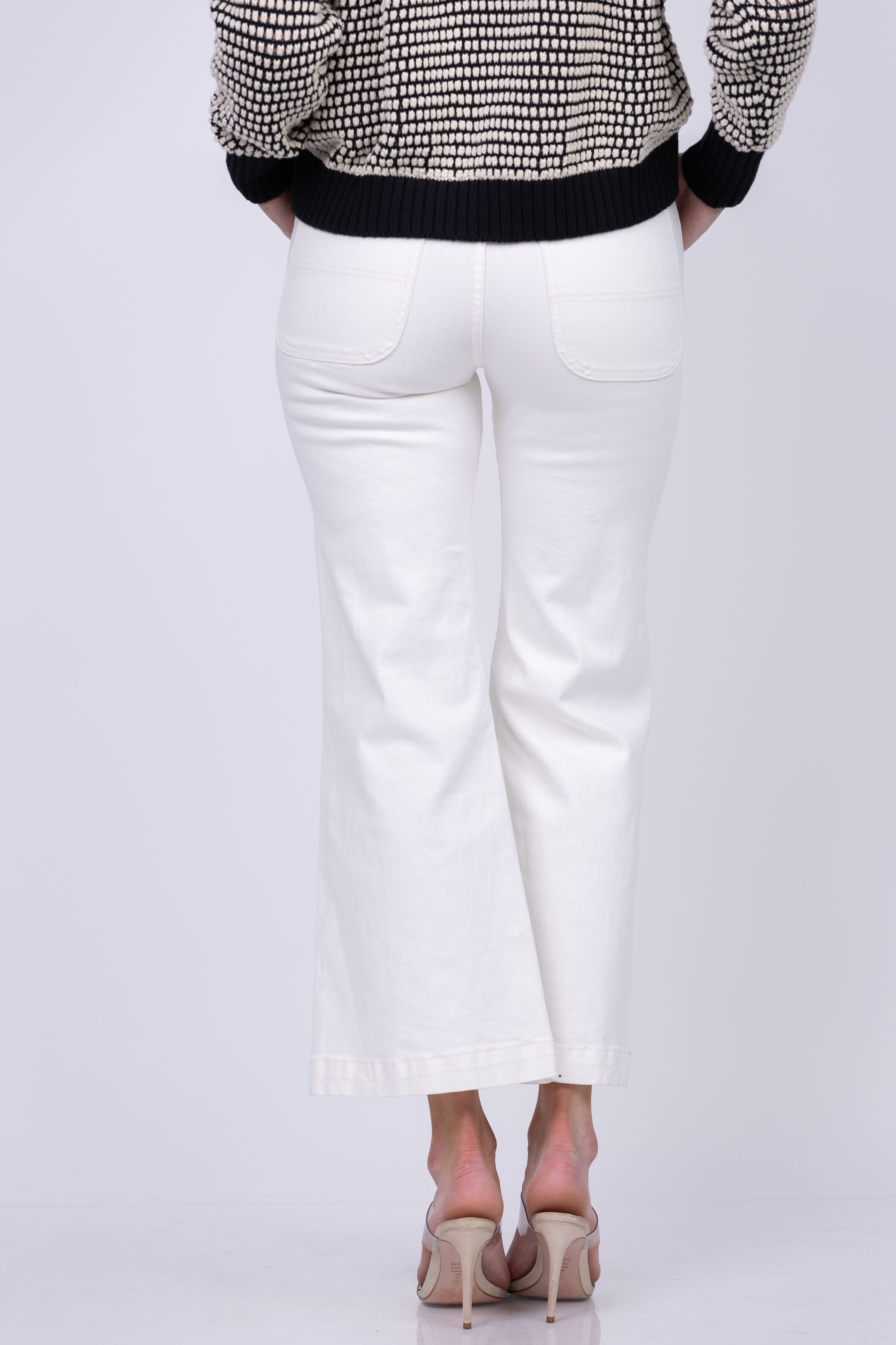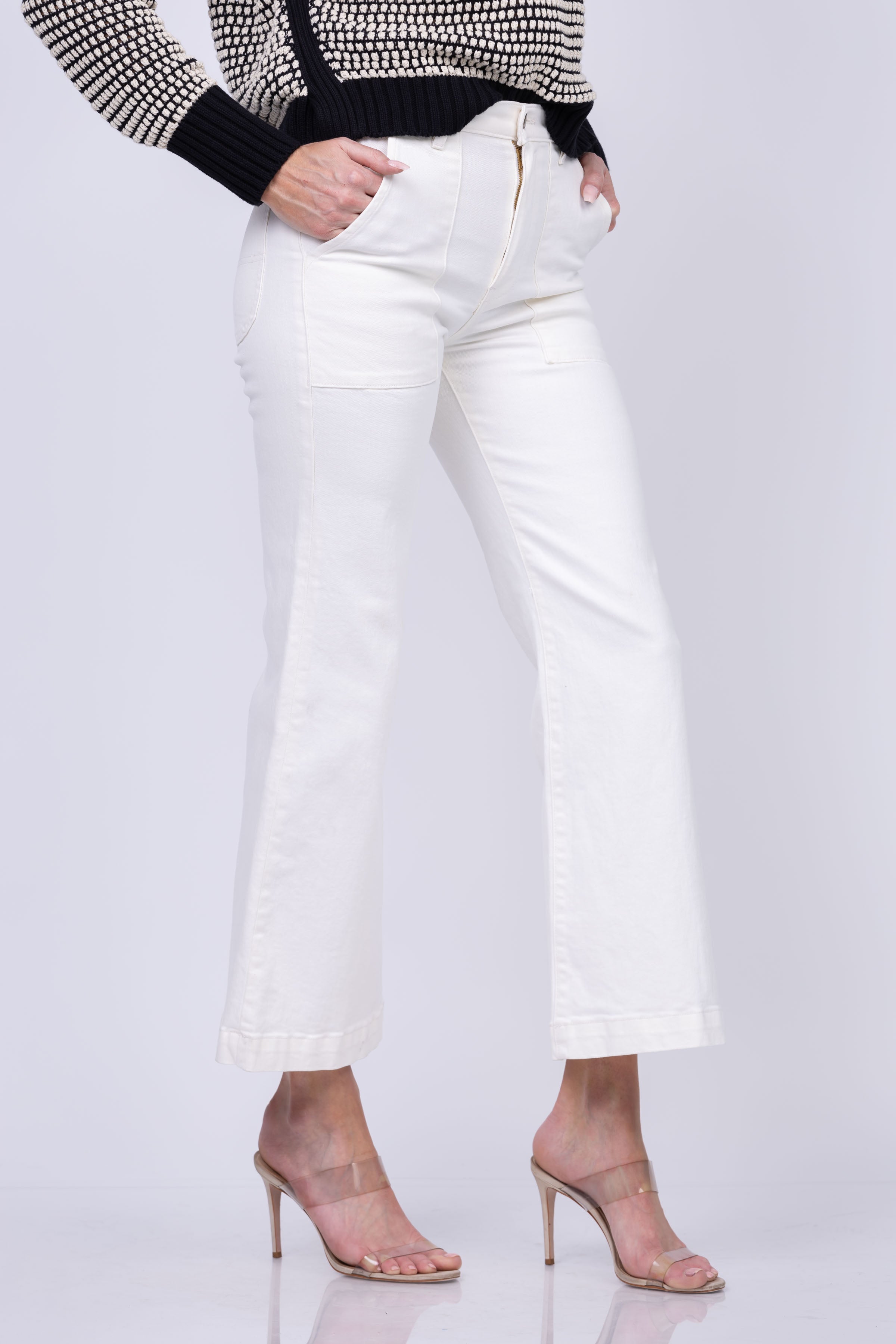 These cropped jeans feature a zip fly with button closure, tonal stitching and gold-tone hardware. The white wash and wide-leg silhouette add a touch of sophistication, making them a versatile addition to any wardrobe. Perfect for a chic and polished look!