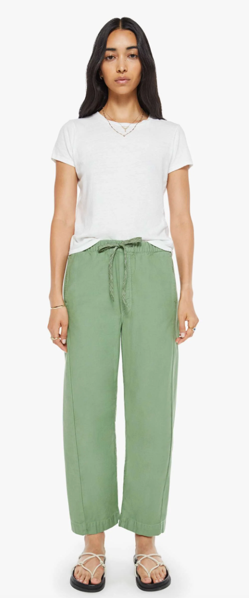 Experience effortless style and comfort with the Mother The Drawn Half-Pipe Ankle Pant in Sir Yes Sir Mineral Green. These super high-waisted pants feature a wide, curved leg and an elastic drawstring waistband for a perfect fit. Crafted from 100% cotton in a faded army-green shade, they offer breathable wear and a relaxed yet polished look. The ankle-length inseam with a clean hem makes them versatile for any occasion, combining casual ease with a modern edge. Elevate your wardrobe with these statement pants designed for both comfort and style.