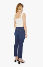 Meet The Lil Insider Crop Step Fray, part of MOTHER's petite-friendly LIL' MOTHER collection. Good things come in small packages: cropped at the ankle with a frayed step-hem, this iconic high-waisted bootcut accentuates all the right places. Made from stretch denim in a dark blue wash, Off Limits also has whiskering and fading at the knees.