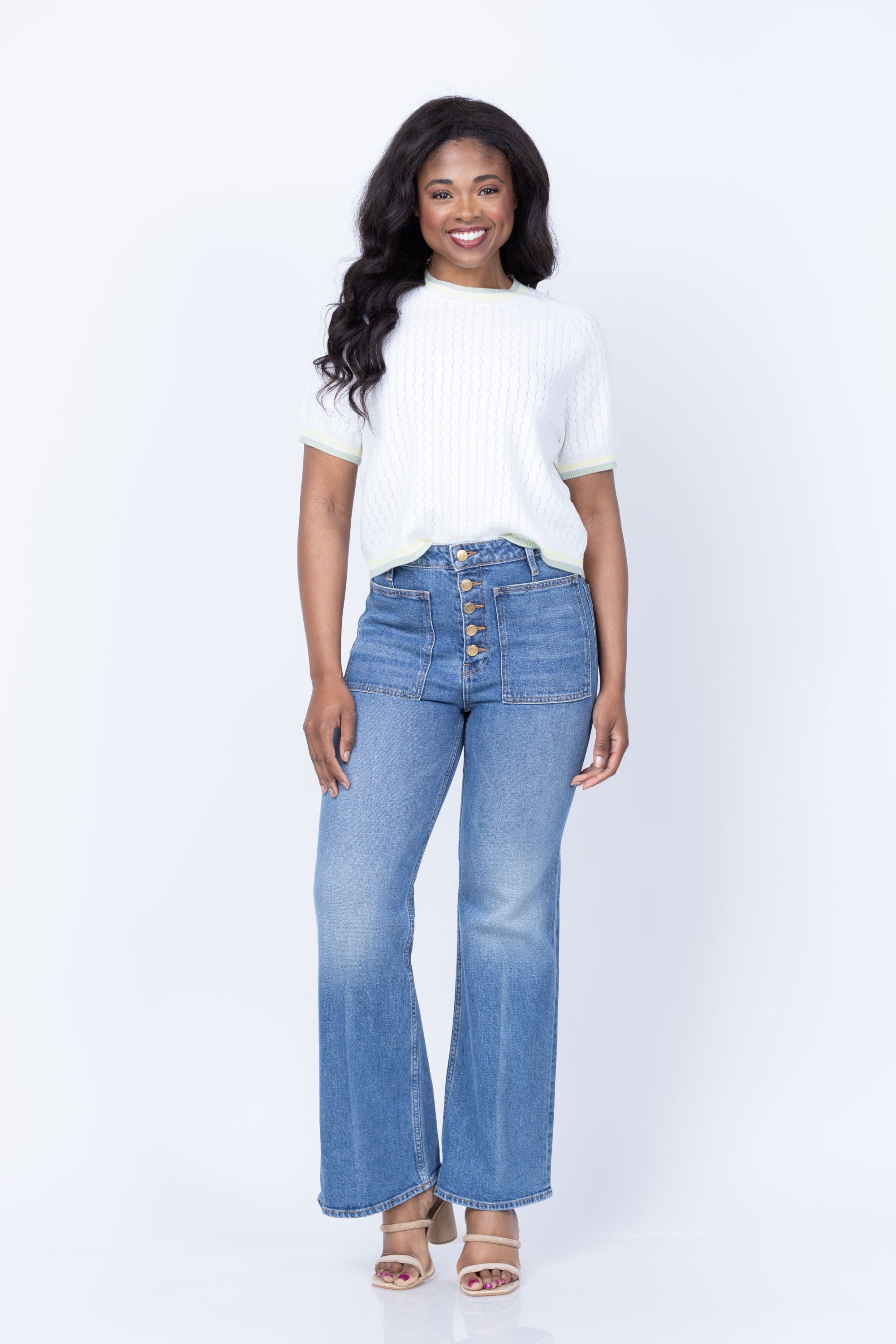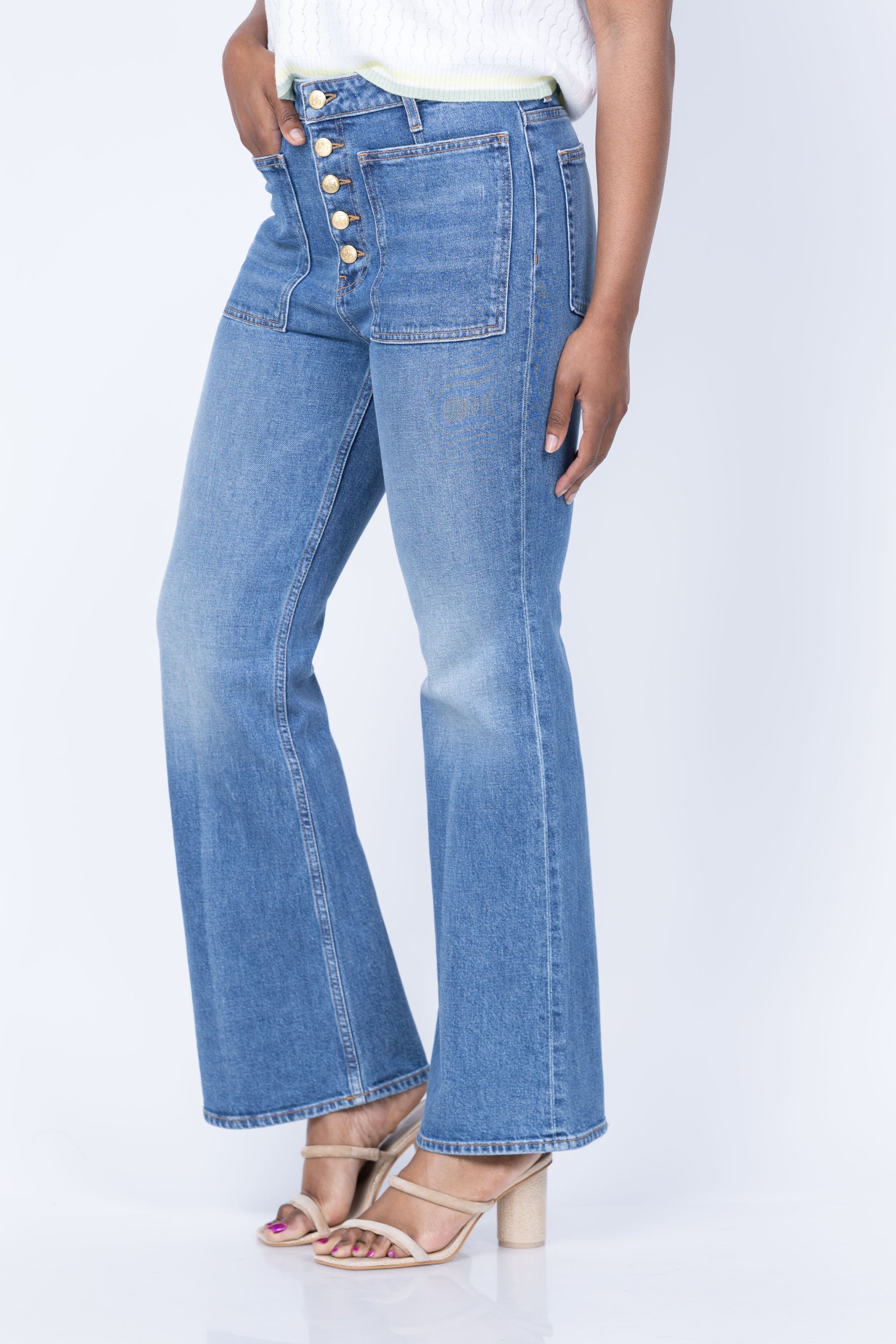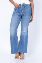 The Ulla Johnson Lou Jean Stretch in Danube captures timeless style with medium indigo denim infused with a touch of elastane for comfortable movement. Featuring signature oversized patch pockets and exposed button details, this elevated essential delivers vintage-inspired flair through its flattering flared hem. A wardrobe staple that effortlessly transitions from day to night.