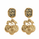 Experience the perfect fusion of springtime renewal and exotic charm with the Mignonne Gavigan Carmen Earrings in Antique Gold. These captivating accessories feature distinctive Dalmatian jasper studs that elegantly support cascading gold coins, creating movement and light with every turn. The vintage-inspired design evokes faraway destinations while remaining effortlessly wearable. Elevate your everyday look or complement special occasions with these statement pieces that blend natural beauty with timeless sophistication.