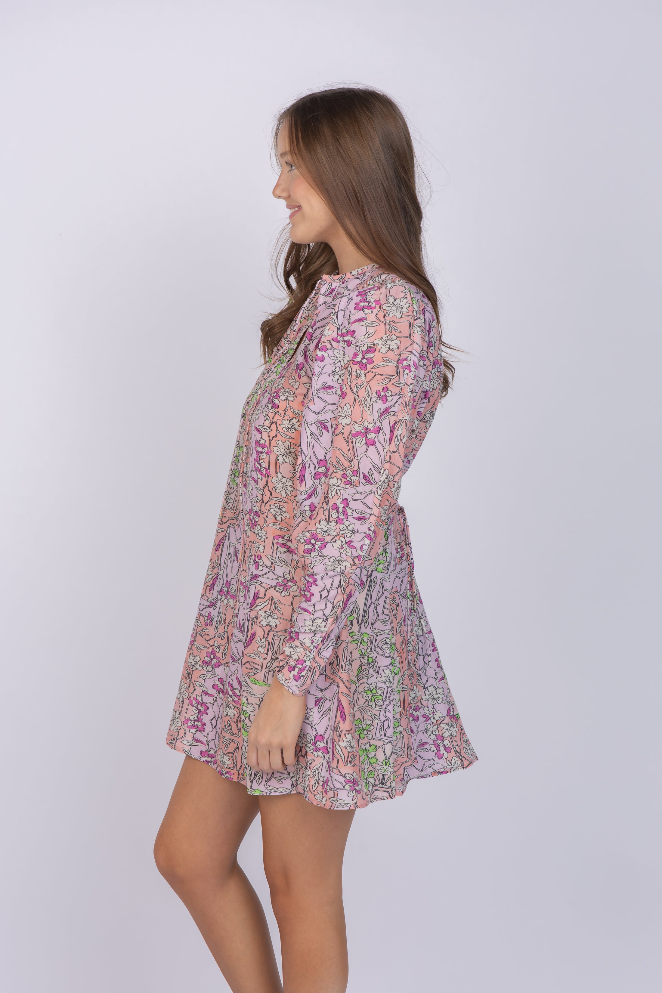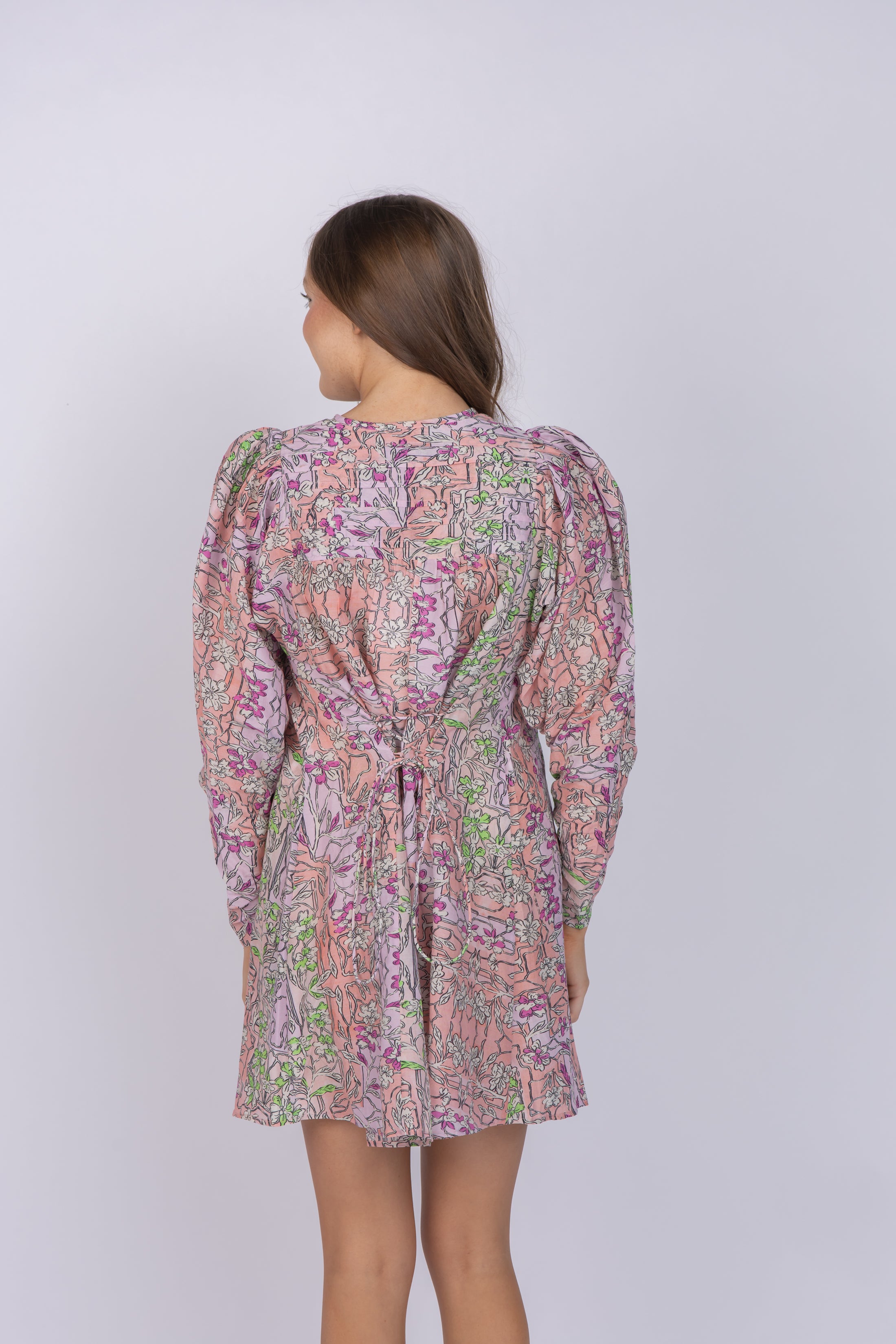 Brighten up your next getaway with the Maria Cher Zapala Lupe Short Dress, featuring a beautiful pink and green pattern perfect for the beach or pool. The tie-back design flatters your figure and defines your waist for an unforgettable look. Step out in style and make a statement!