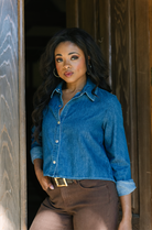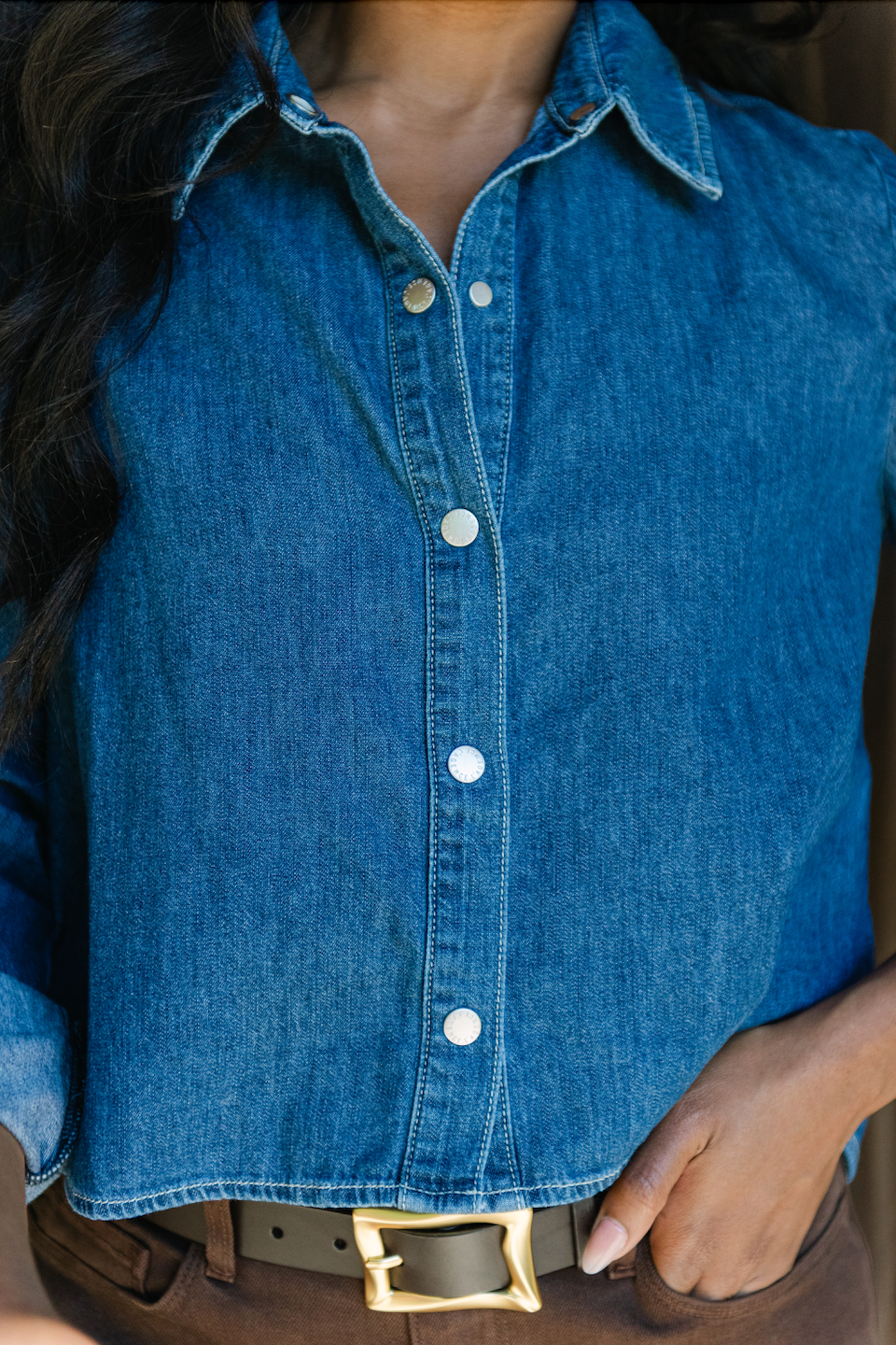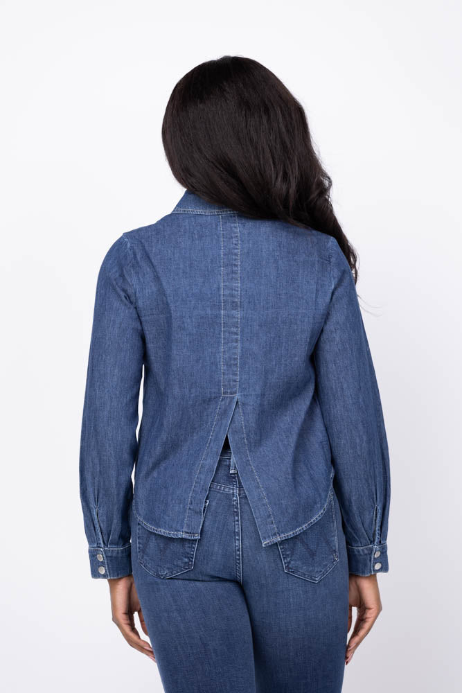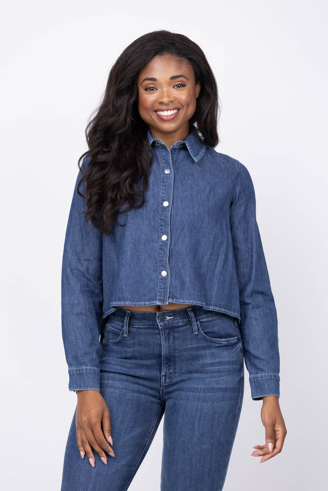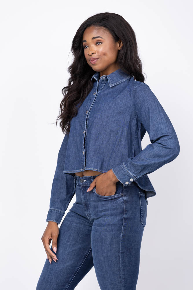 The L'Agence Annette Button Down Shirt in Spokane offers a relaxed fit with a clean silhouette and a high-low shirttail hem for effortless style. Its breathable back vent ensures comfort all day long. Perfect for layering, this versatile chambray shirt is a must-have that effortlessly elevates any outfit.