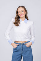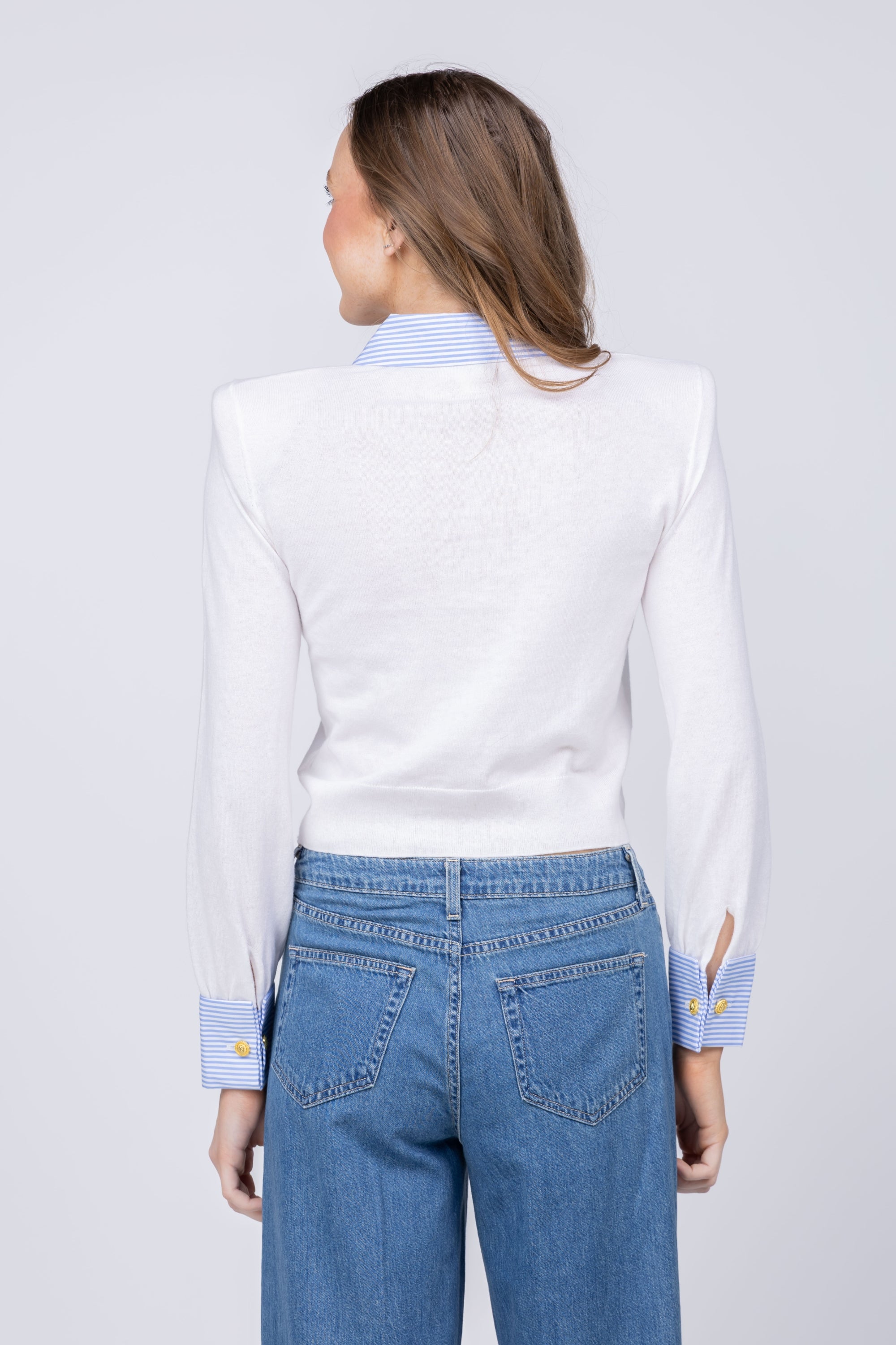 The April pullover elevates everyday style with its clever design that mimics layered sophistication. Featuring a crisp poplin collar and French cuffs, this piece creates the polished look of a coordinated outfit in one seamless garment. Crafted from featherweight knit infused with silk, it delivers luxurious softness without bulk. Structured shoulder pads add dimension and refinement, while removable cufflinks offer versatile styling options. A timeless wardrobe staple that transitions effortlessly from office to weekend, the April pullover in white and blue stripe is the refined essential you'll reach for again and again.