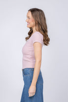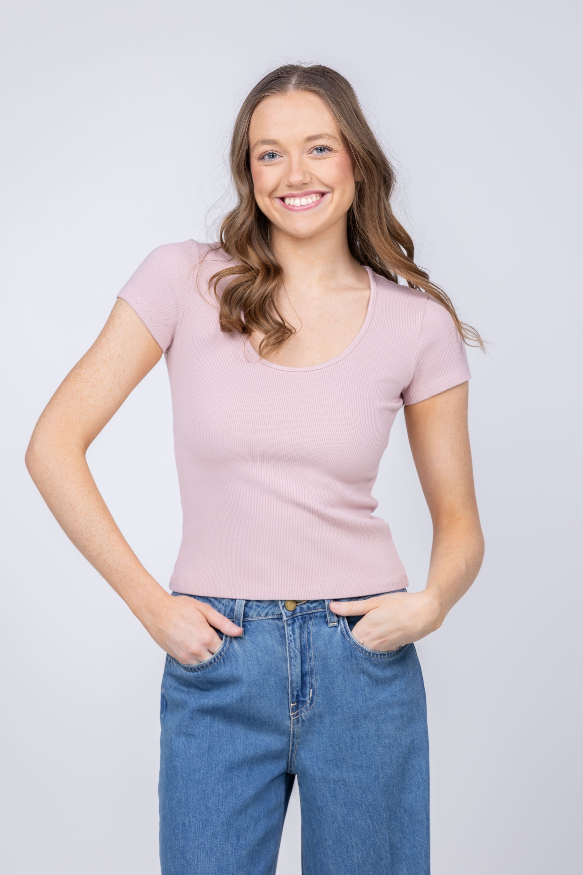 The Brynlee tee is the foundational piece every wardrobe needs. Its elegant scoopneck and streamlined silhouette create a flattering, modern look that works solo or layered beneath your favorite pieces. Constructed from a premium cotton-modal blend with high recovery stretch, this ribbed essential maintains its shape through countless wears and washes, never losing its polished appeal. The close fit skims your frame beautifully while the breathable fabric keeps you comfortable all day long. In soft pale rose, the Brynlee is the versatile base layer that effortlessly elevates any outfit, from casual to refined.