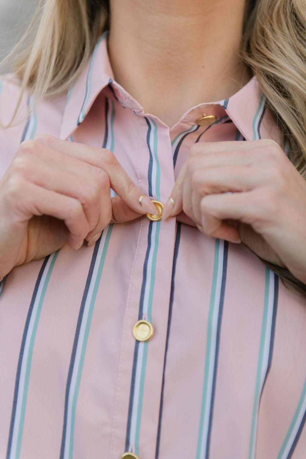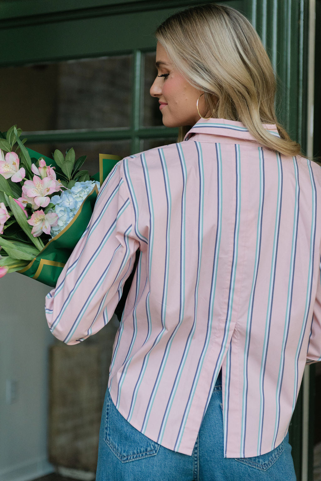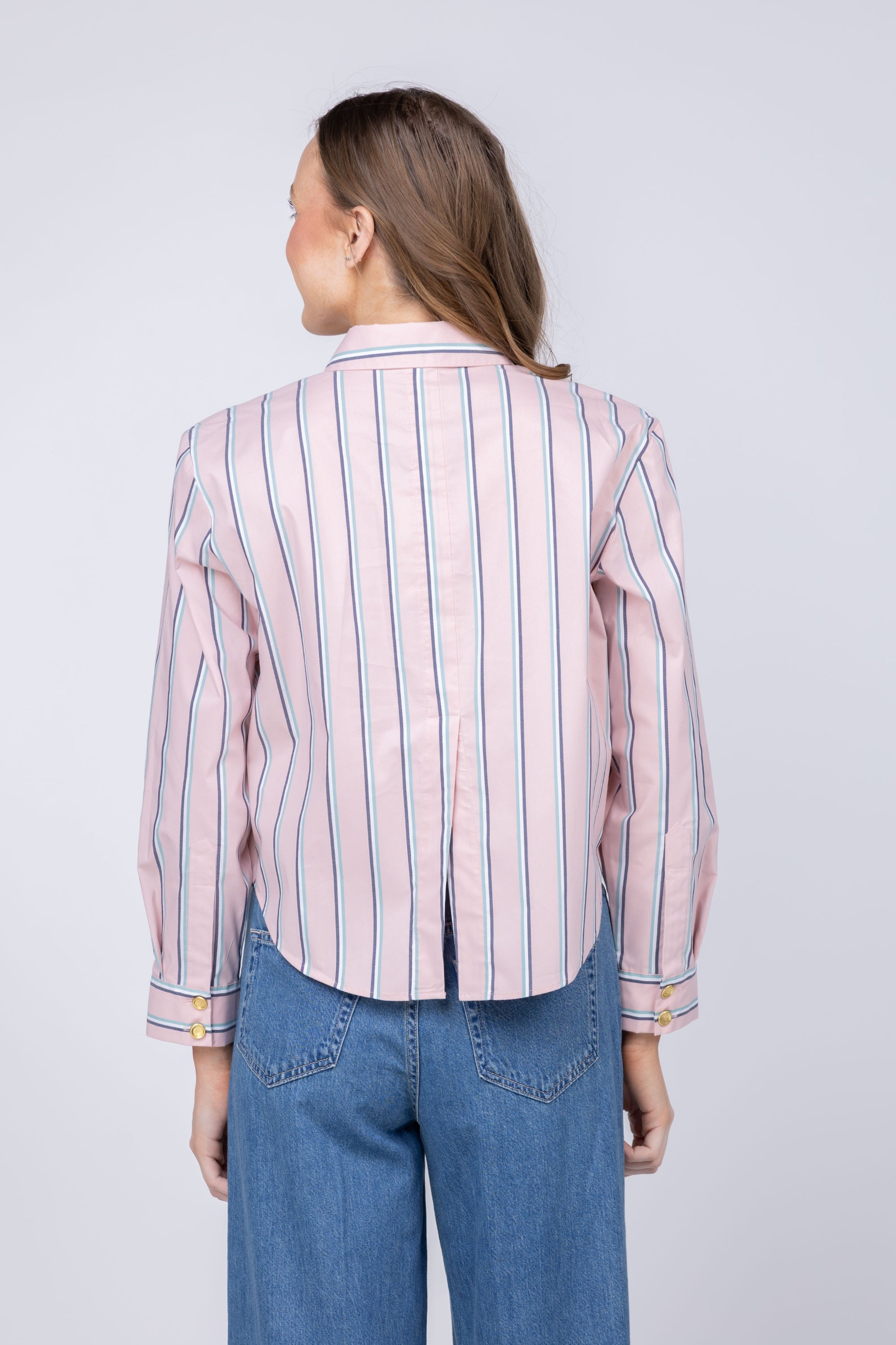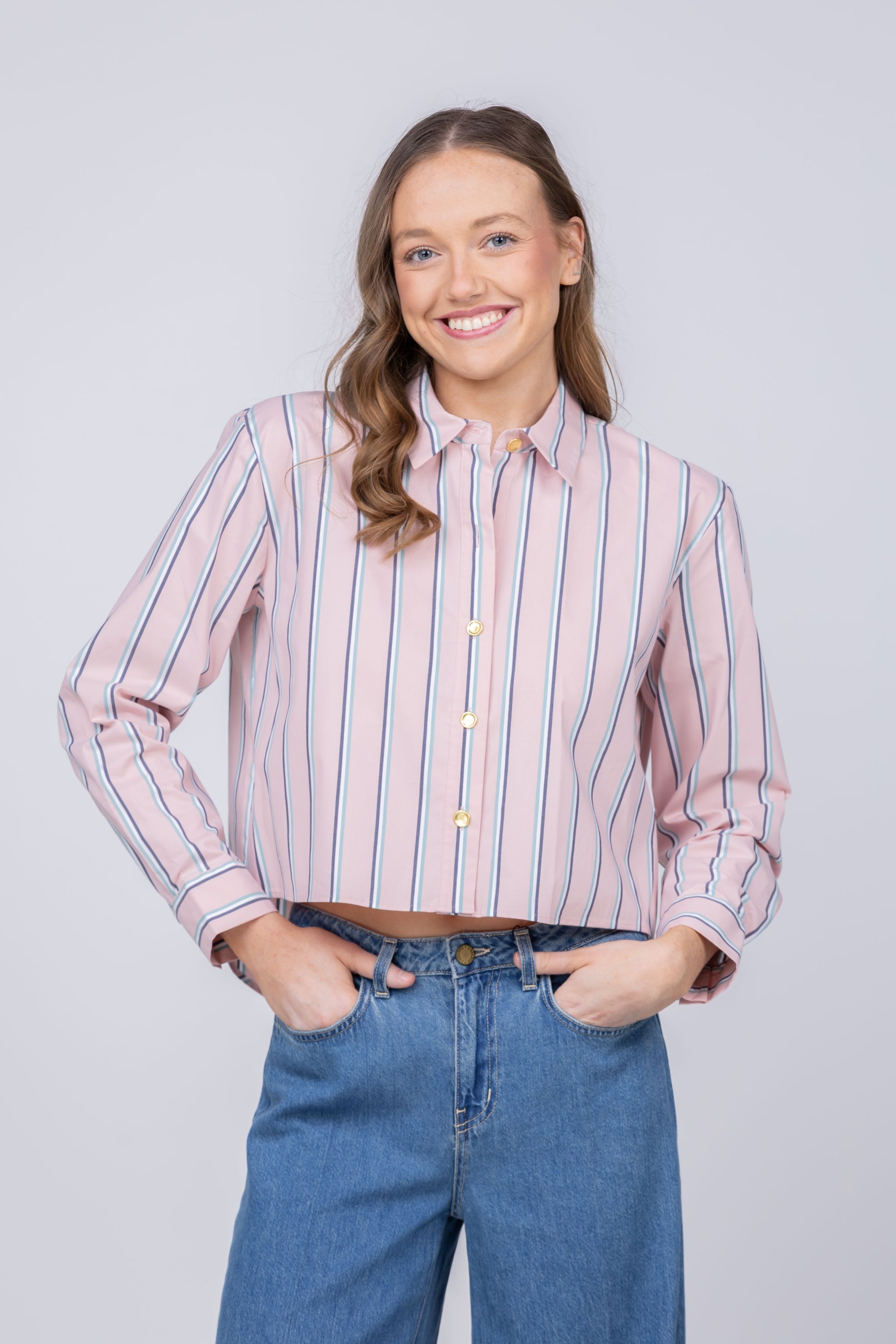 The L'AGENCE Cosette Crop Hi Low Shirt brings effortless sophistication to your everyday rotation. Crafted from a breathable organic cotton-blend poplin, this tailored piece features a coveted borrowed-from-the-boys silhouette with a modern cropped high-low hem that flatters every frame. The pale rose stripe adds a subtle feminine touch to the classic button-front design, making it endlessly versatile—dress it up with tailored trousers or down with your favorite denim. A wardrobe essential that transitions seamlessly from office to weekend.