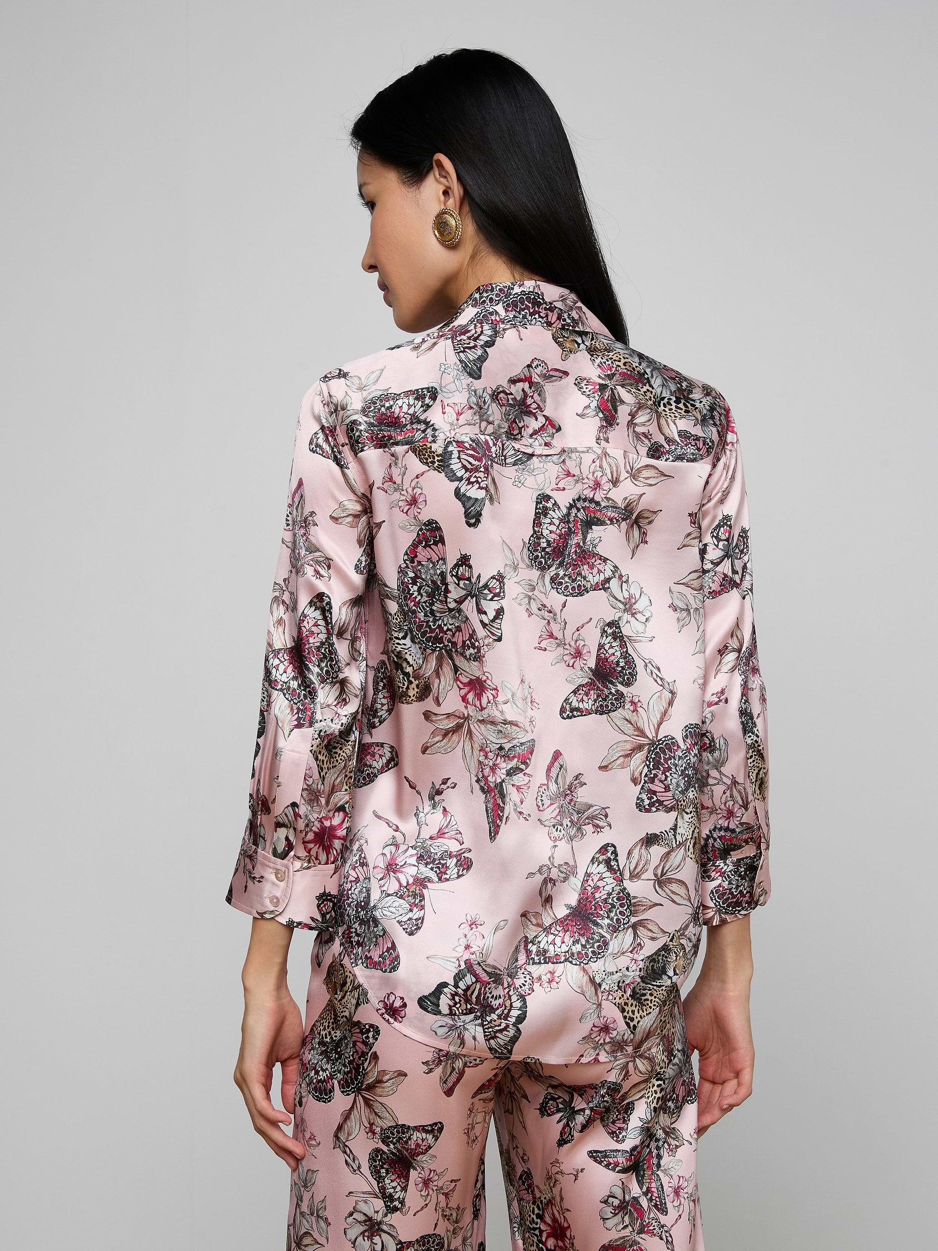 Discover the L'AGENCE Dani Blouse—the wardrobe staple that effortlessly elevates any outfit. Crafted from sumptuous silk charmeuse, this all-time bestseller features thoughtfully designed three-quarter sleeves that showcase your favorite bracelets and watches without any adjusting. The slim fit flatters your silhouette while the high-low shirttail hem adds movement and dimension. Front button closure for easy styling. Now reimagined in a stunning light nectar pink with a delicate butterfly jungle print, this versatile piece transitions seamlessly from boardroom meetings to weekend brunches. A sophisticated investment piece that works as hard as your lifestyle demands.