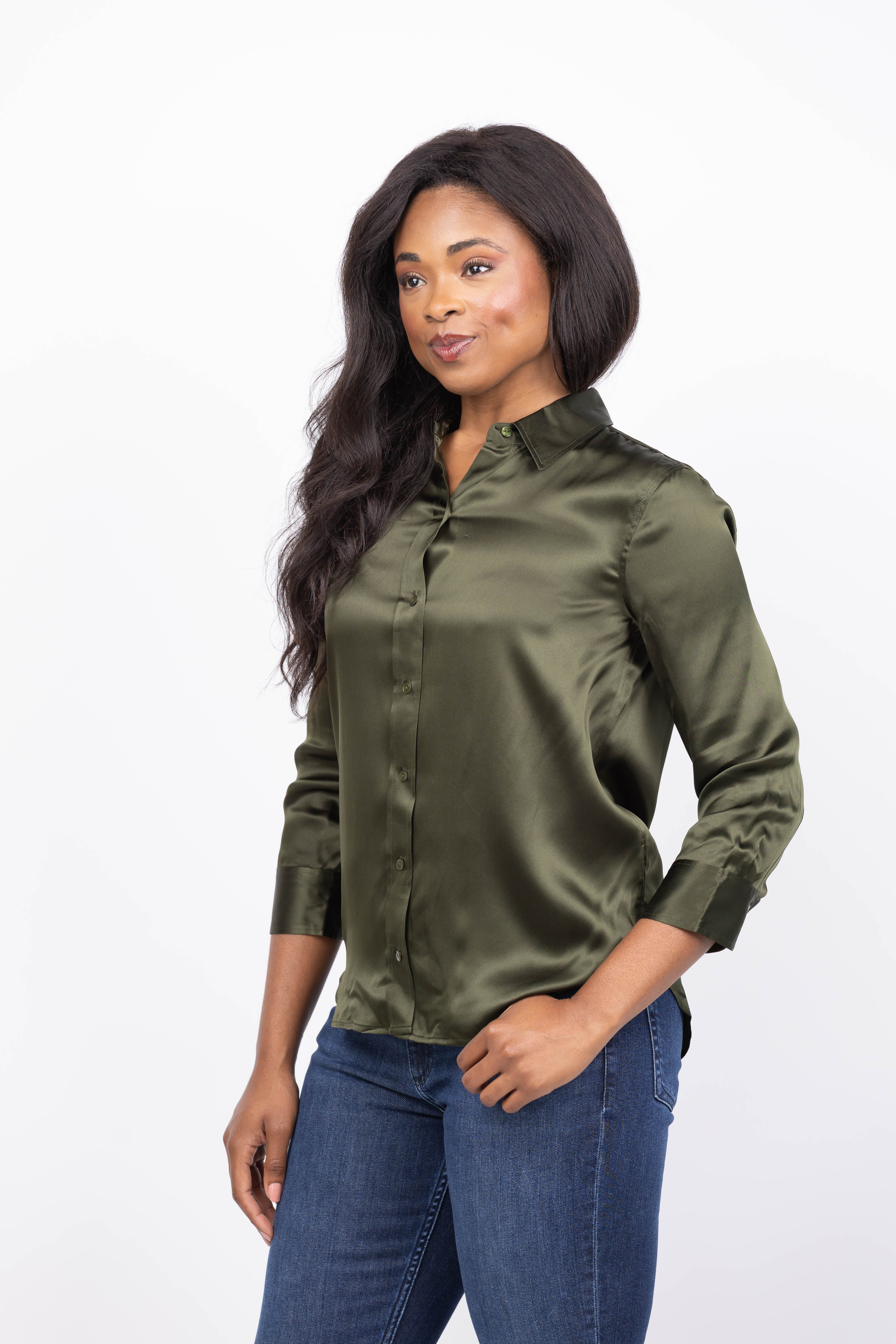 Elevate your wardrobe with the L'Agence Dani 3/4 Sleeve Blouse in Deep Olive, a luxurious silk button-down designed for timeless style. Its flattering three-quarter sleeves offer versatility and comfort, while the rich olive hue adds a sophisticated touch to any outfit. Perfect for effortless elegance, this signature piece transitions seamlessly from day to night, making it an essential addition to your collection.