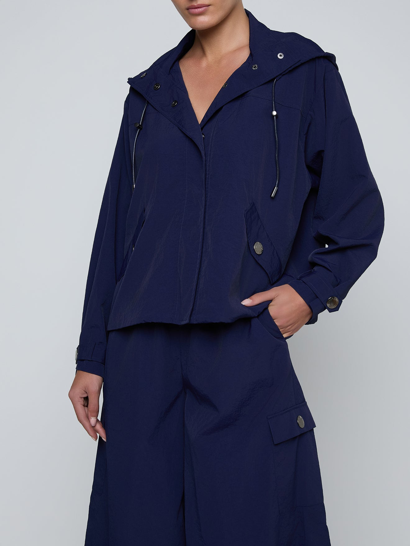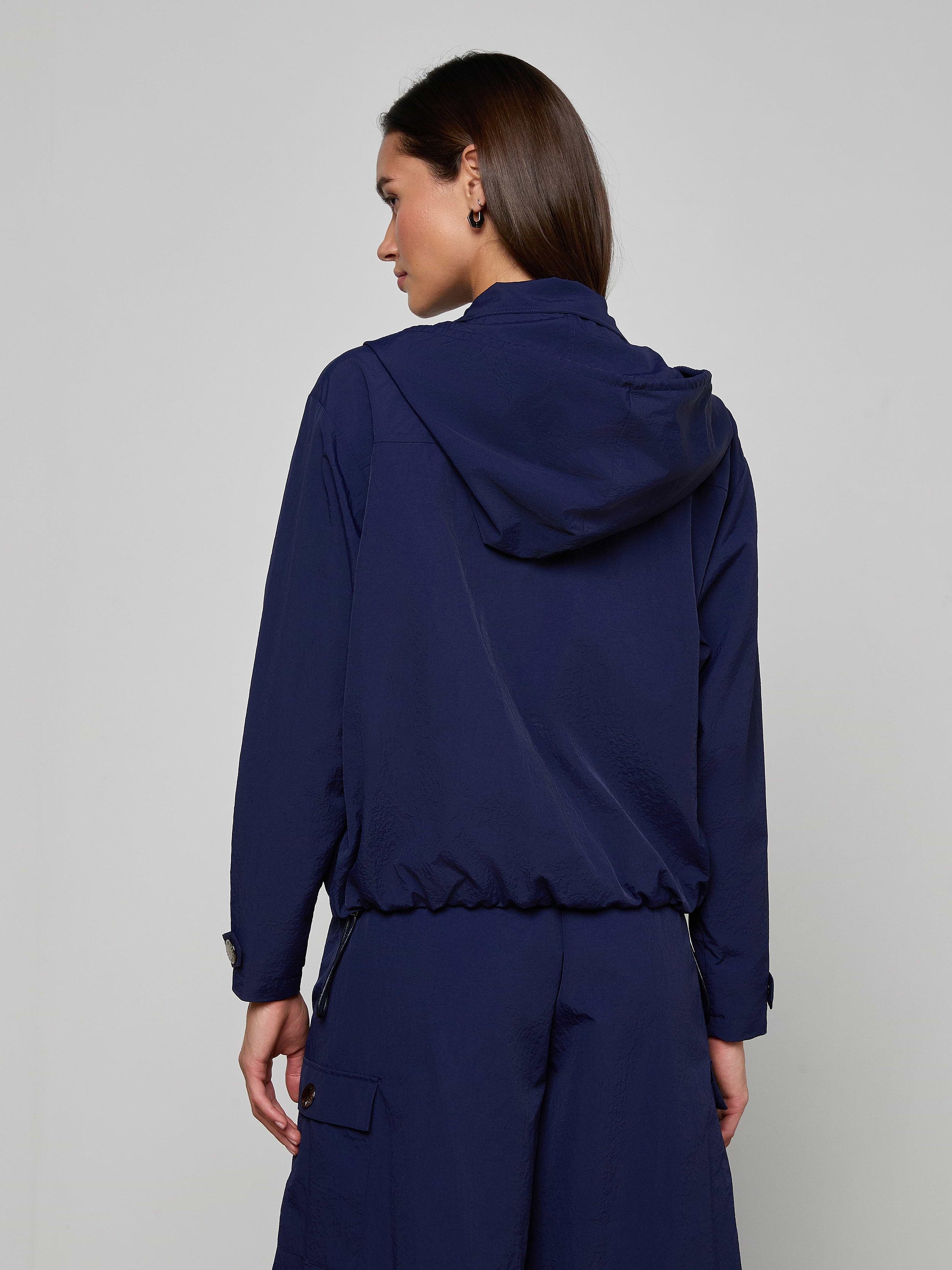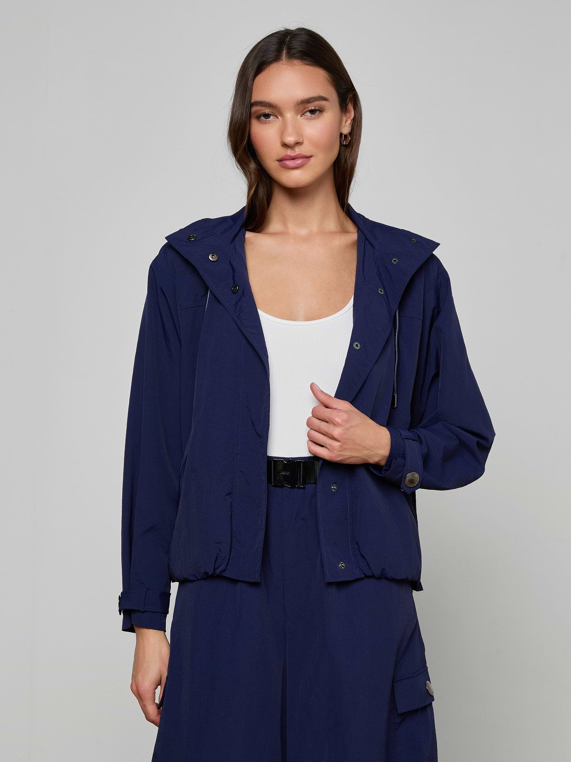 Meet the Geovana windbreaker—the versatile layer that seamlessly transitions from season to season. Engineered with a water-repellant nylon finish, this jacket shields you from unexpected weather while maintaining an effortlessly polished aesthetic. The fully removable hood adapts to your needs, while refined snap button closures and functional flap pockets deliver both style and practicality. Available now in rich midnight blue, the Geovana is the travel companion and everyday essential that elevates any outfit with understated sophistication.