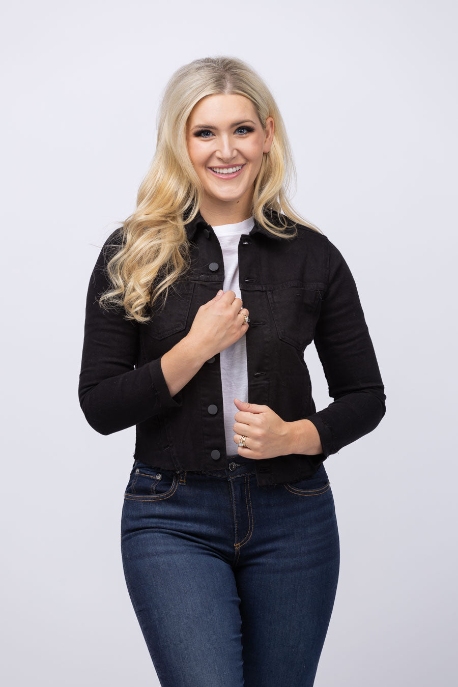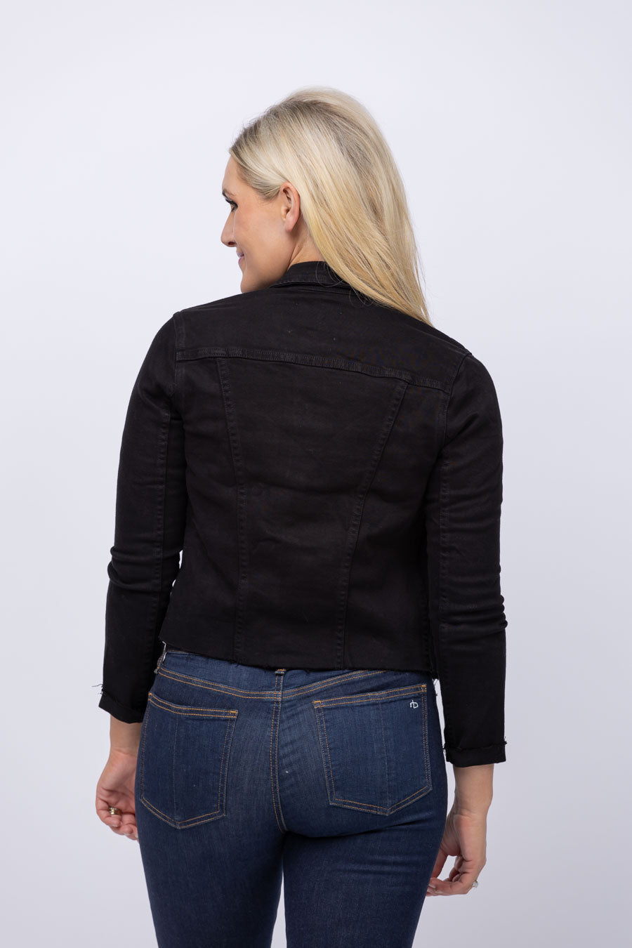 Behold the ultimate denim jacket! The L'AGENCE Janelle Jacket in Saturated Black will make you stand out with its slim shape and raw hems. Flattering front angled seaming and welt pockets add structure, while cuffed three-quarter sleeves and matte-black buttons provide a fashionable finish. Get ready to turn heads!