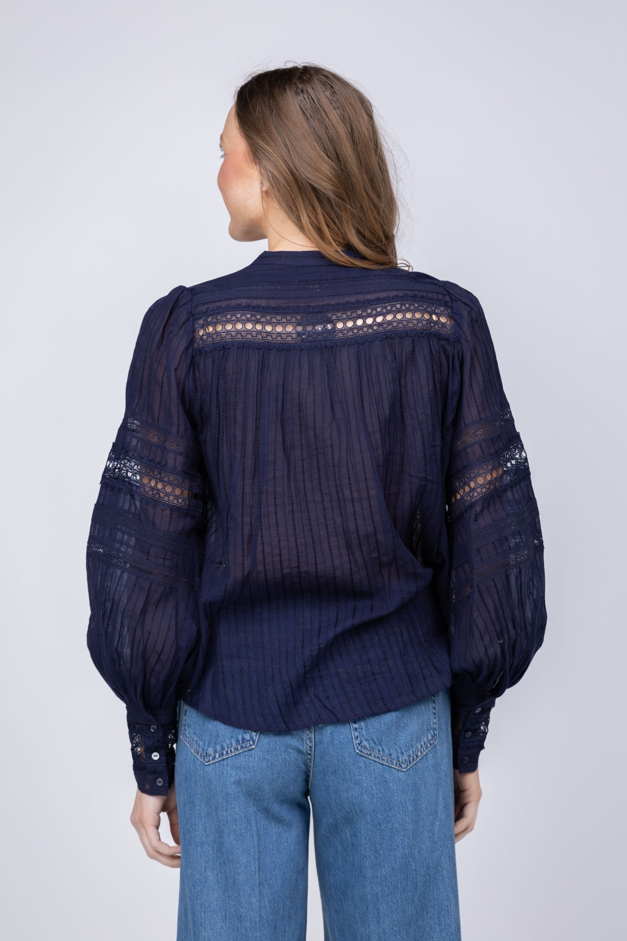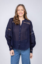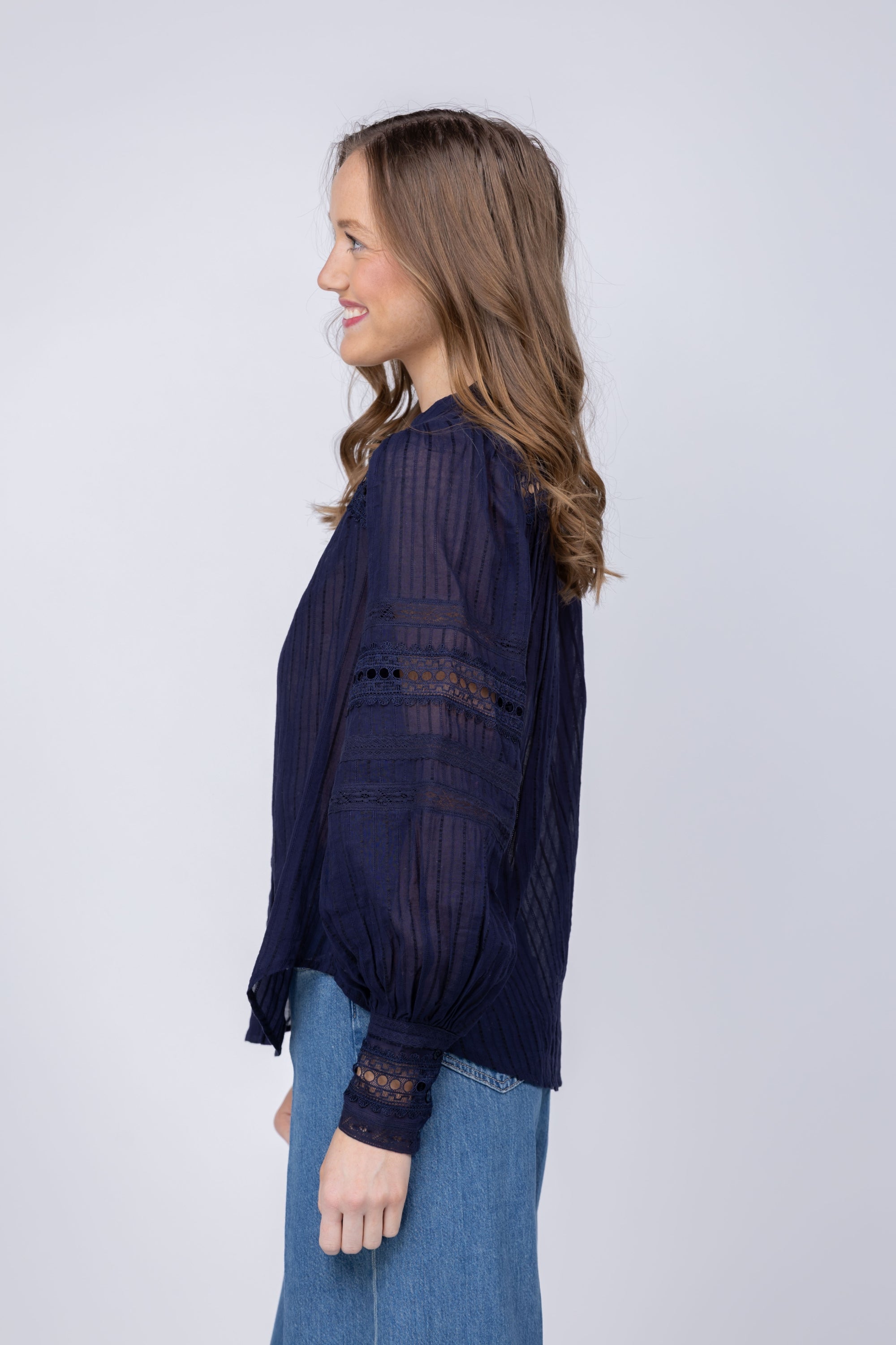 Embrace your romantic side with the L'AGENCE Kiera Trim Blouse, a bestselling style that effortlessly captures bohemian elegance. Crafted from semi-sheer cotton-blend jacquard, this midnight navy beauty features delicate geometric trim and graceful blouson sleeves that create an airy, flattering silhouette. Button closures add timeless sophistication. Perfect for layering or wearing solo, the Kiera transforms any occasion into an opportunity to express your most enchanting self.