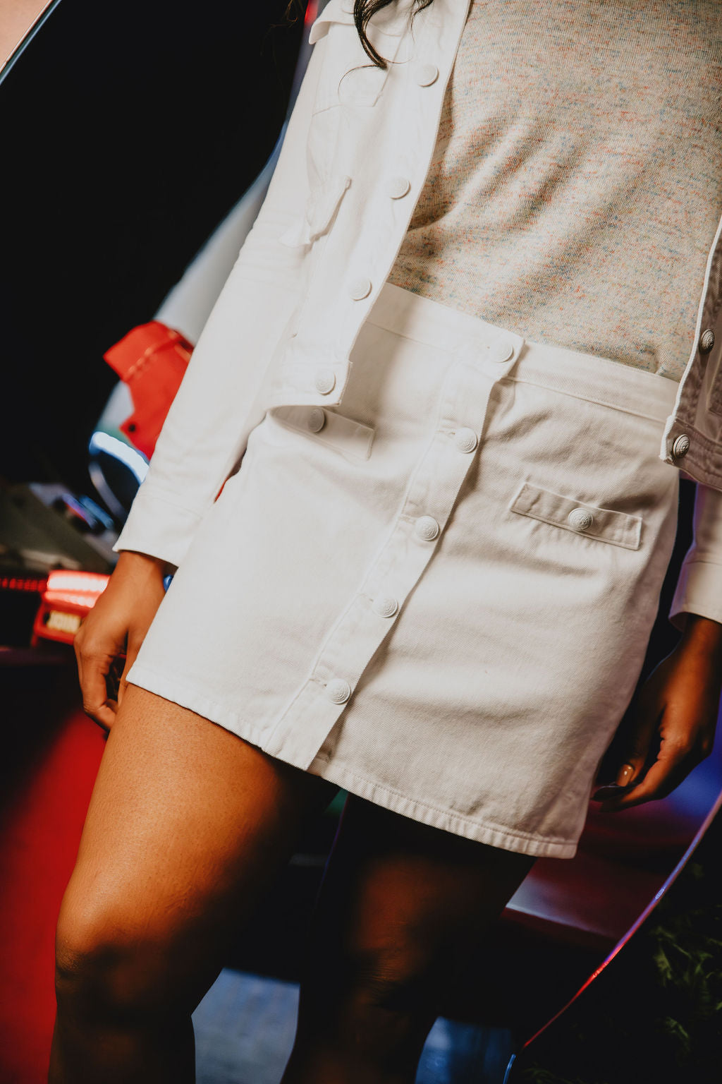 Elevate your style with the L'Agence Kris Button Front Mini Skirt. Made in the USA from 100% cotton, this skirt is both comfortable and stylish. The front button closure adds a unique touch, while the faux pockets provide a sleek look. Machine washable and unlined for effortless care. Perfect for any outfit!