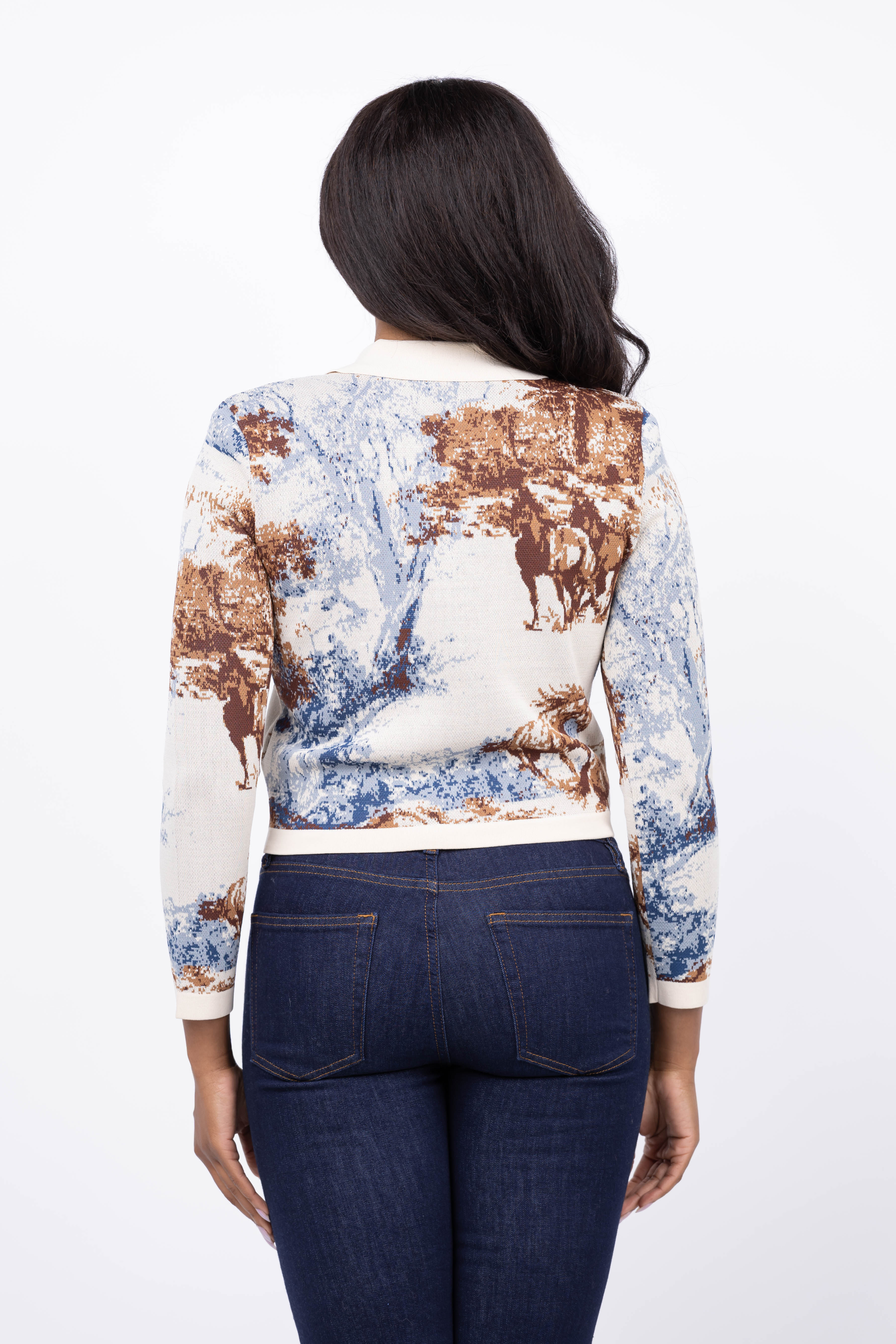 The L'AGENCE Osiris Jacquard Cardigan in Tan Multi Western Toile brings timeless Americana to your wardrobe with its unique jacquard weave featuring a striking Western toile motif. Enhanced by gold-tone buttons, contrast trim, and practical flap pockets, this cardigan perfectly balances nostalgic style with a refined edge. Versatile enough to wear alone or layered, it adds a distinctive sophistication to any outfit.