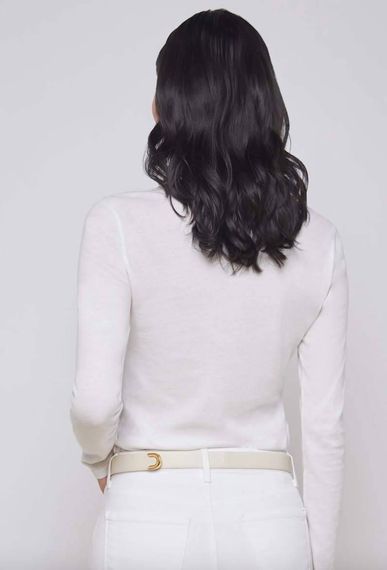Introducing the L'AGENCE Tess—a refined long-sleeve crew neck that embodies contemporary elegance. Constructed from ultra-soft microfiber jersey with a sumptuous silky texture, this slim-fit top gracefully contours your silhouette while maintaining effortless comfort. The crisp white colorway pairs with everything, making it an indispensable wardrobe foundation. Wear it solo for understated sophistication or layer it beneath your favorite pieces for added dimension and warmth. A versatile essential that transitions seamlessly from casual to polished occasions.