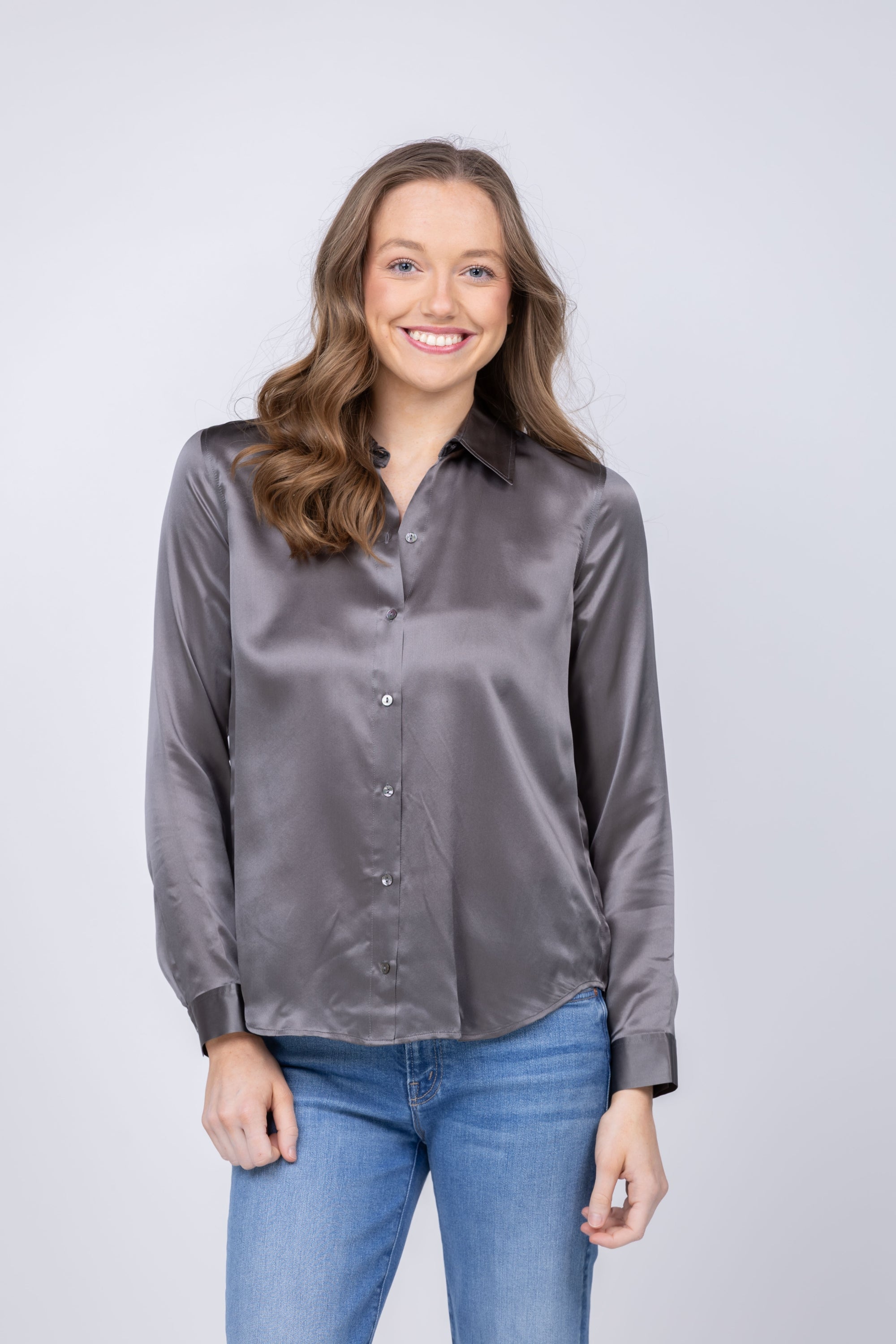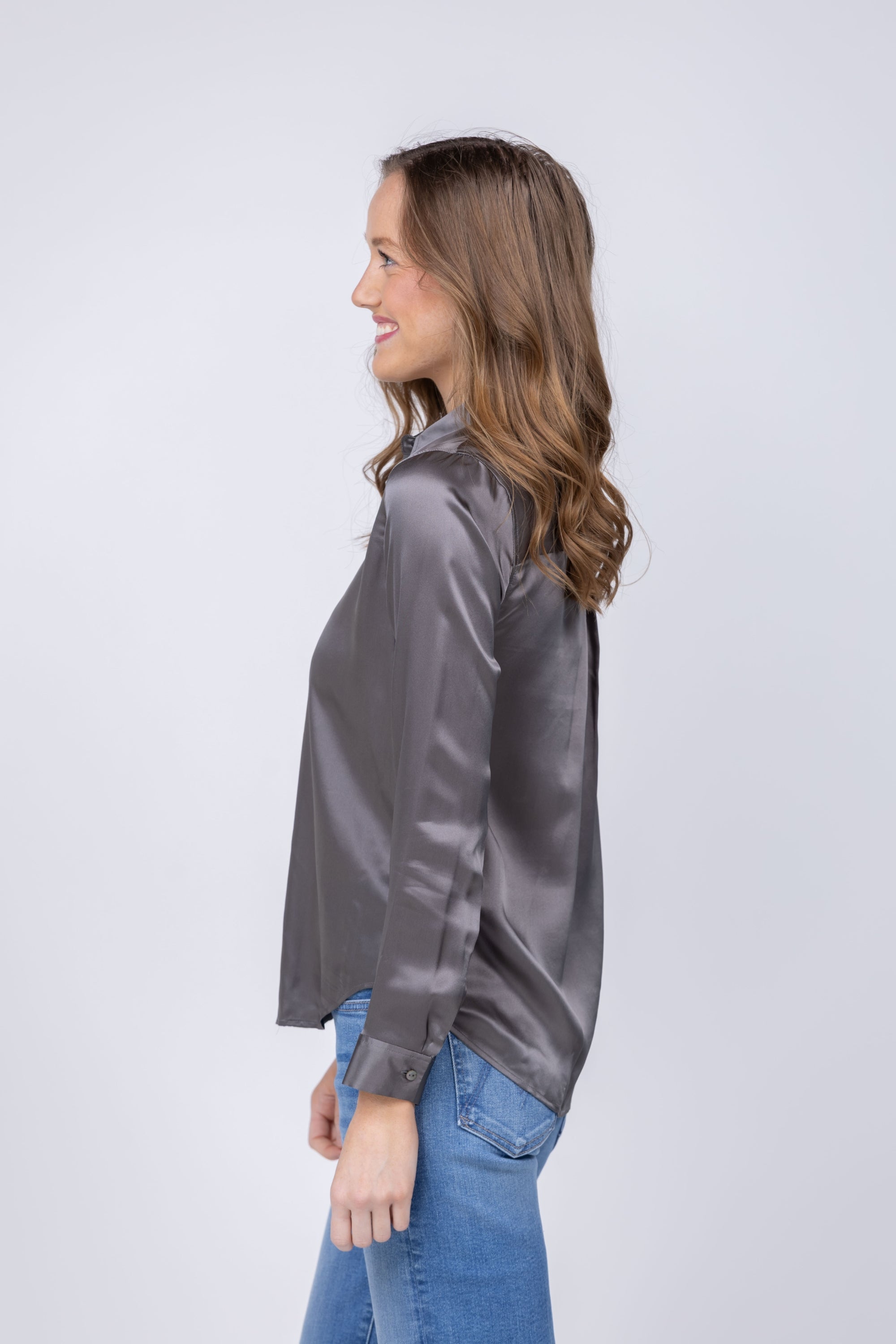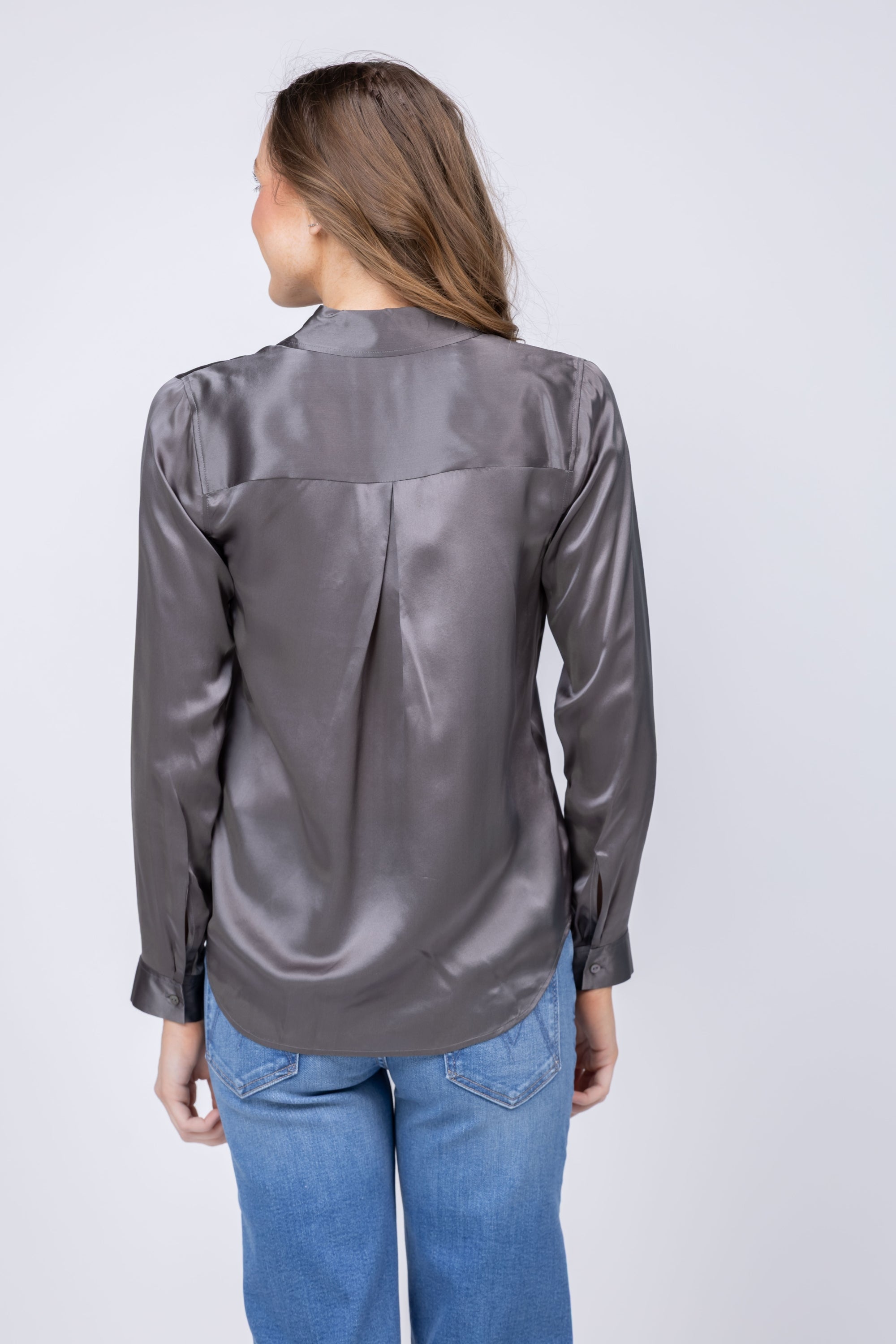 The L'AGENCE Tyler Blouse in Medium Grey is the versatile foundation piece that works harder than any other in your closet. Crafted from sumptuous 100% silk charmeuse, this perennial bestseller features a refined pleated back yoke and slim fit that skims the body beautifully. The understated medium grey hue pairs effortlessly with everything—layer it under tailored blazers, tuck it into high-waisted trousers, or wear it solo for an instantly polished look. With its timeless front button closure and elegant drape, this is the one blouse you'll reach for again and again, season after season.