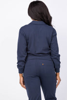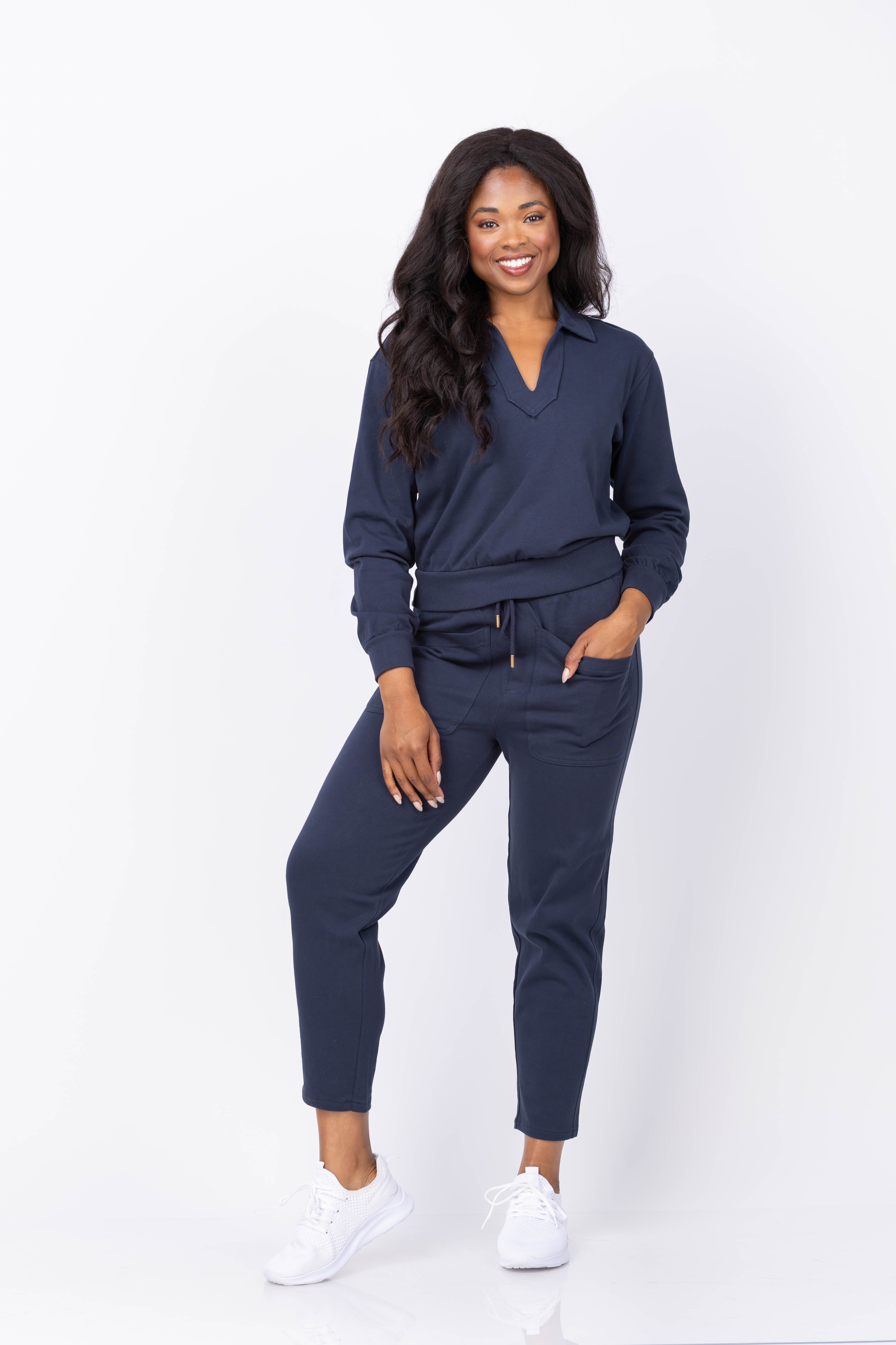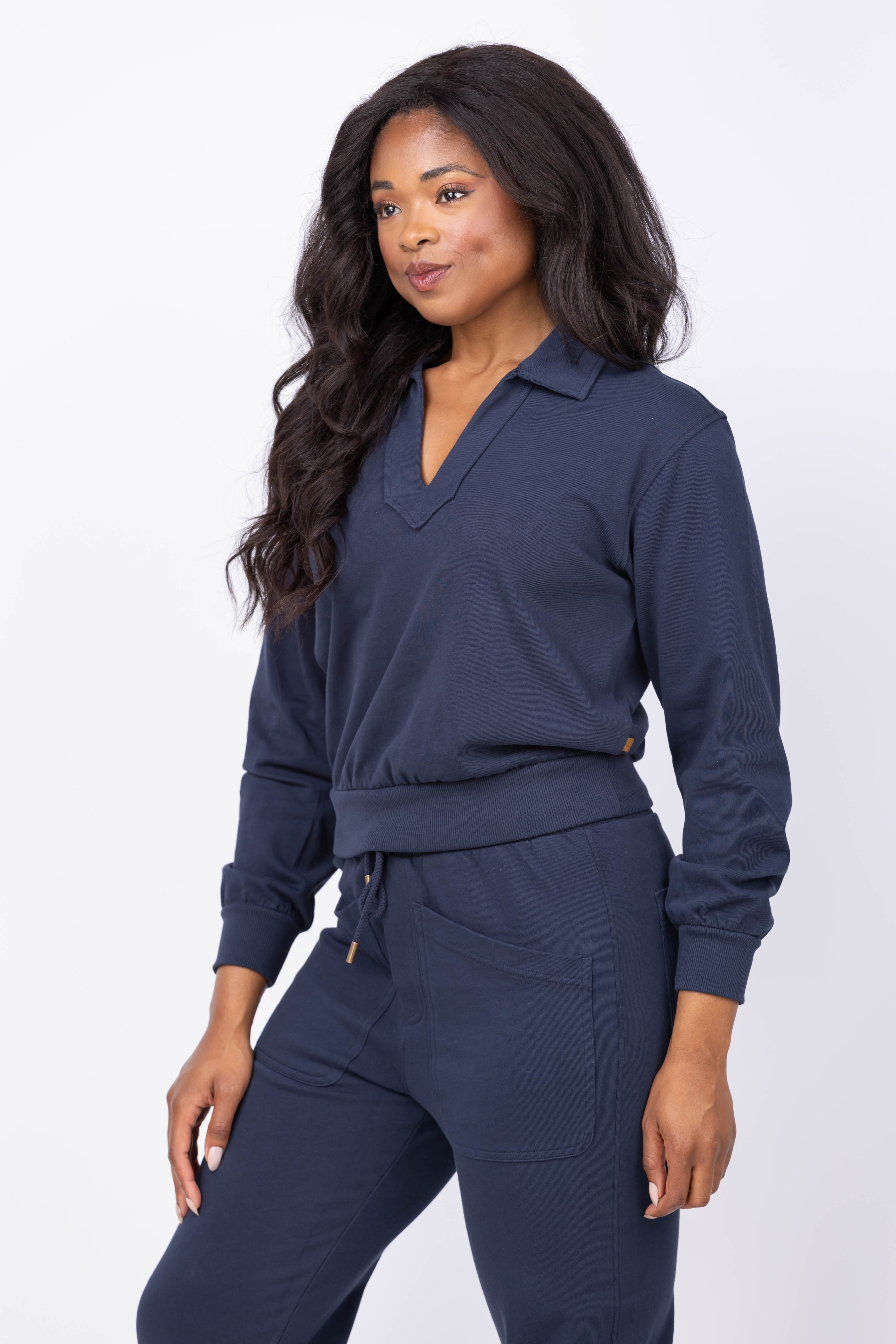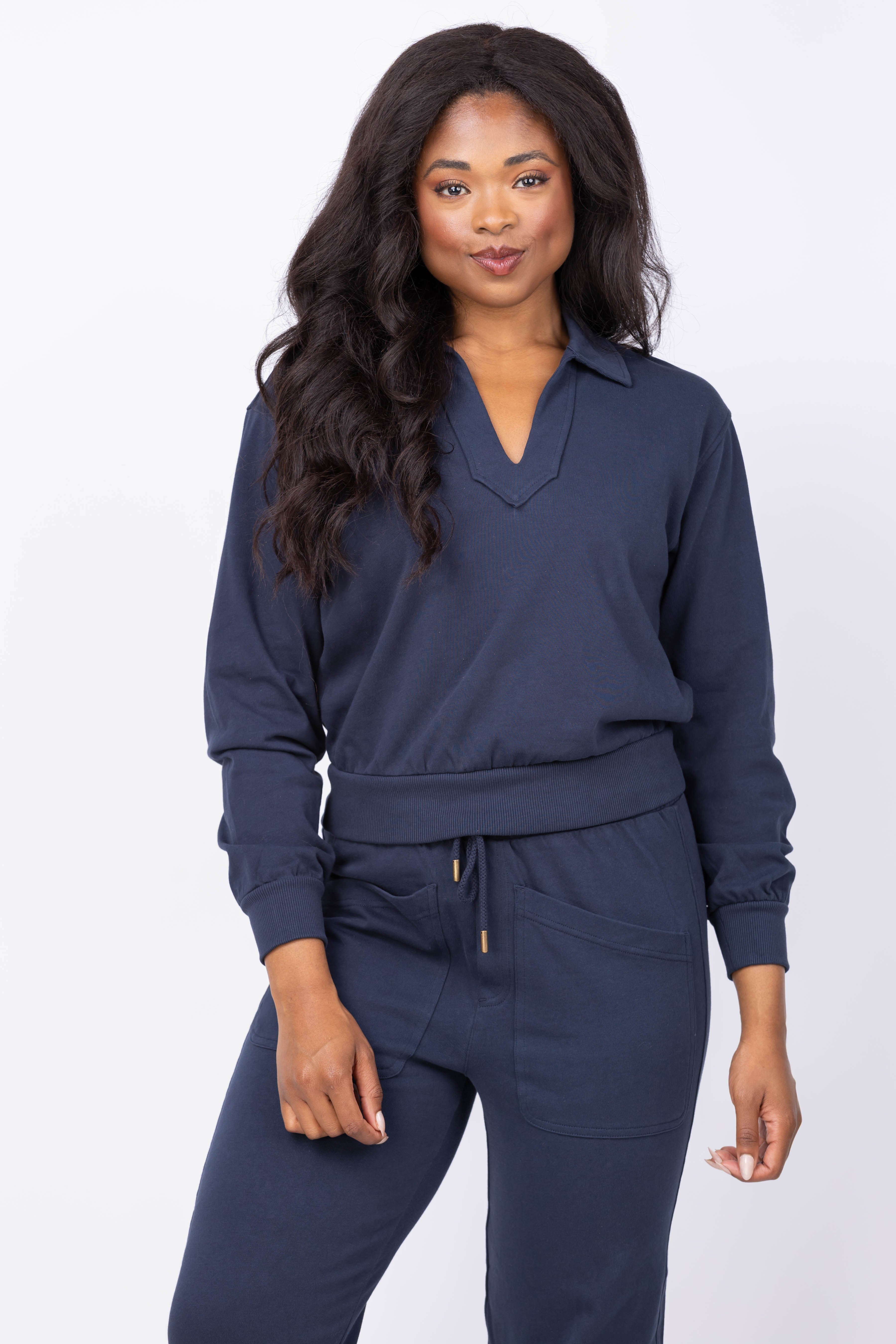 The Lilla P Drop Shoulder Polo in Navy is crafted from structured knit fabric that maintains its shape with a polished yet relaxed feel. Its refined polo neckline and ribbed trim hem create an effortless, sweatshirt-inspired silhouette. The shorter length pairs seamlessly with matching pants for a chic, coordinated look. Perfect for active days or cozy evenings, this polo blends comfort with style to keep you looking put-together wherever you go.