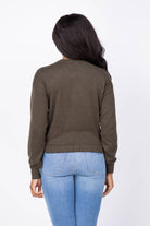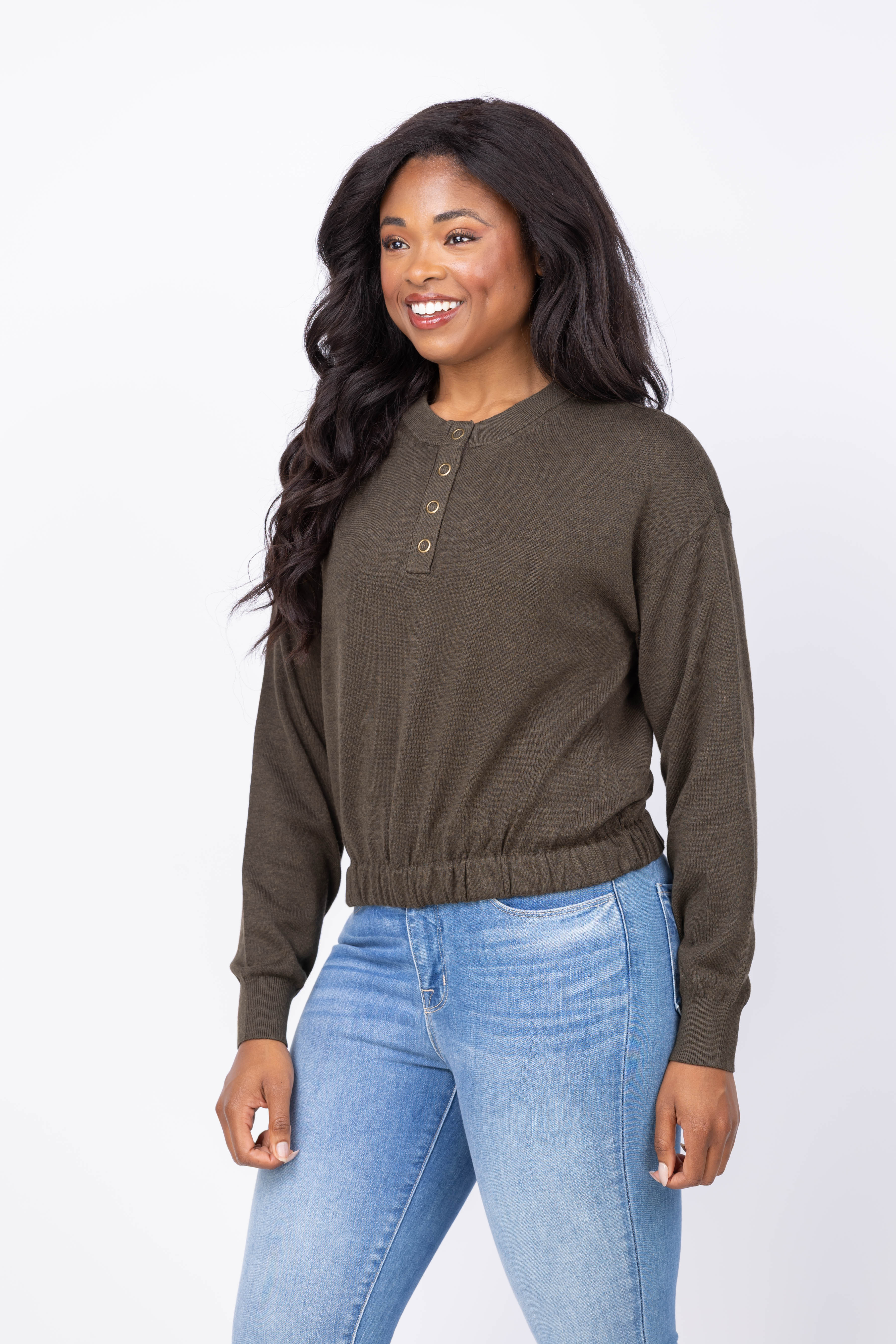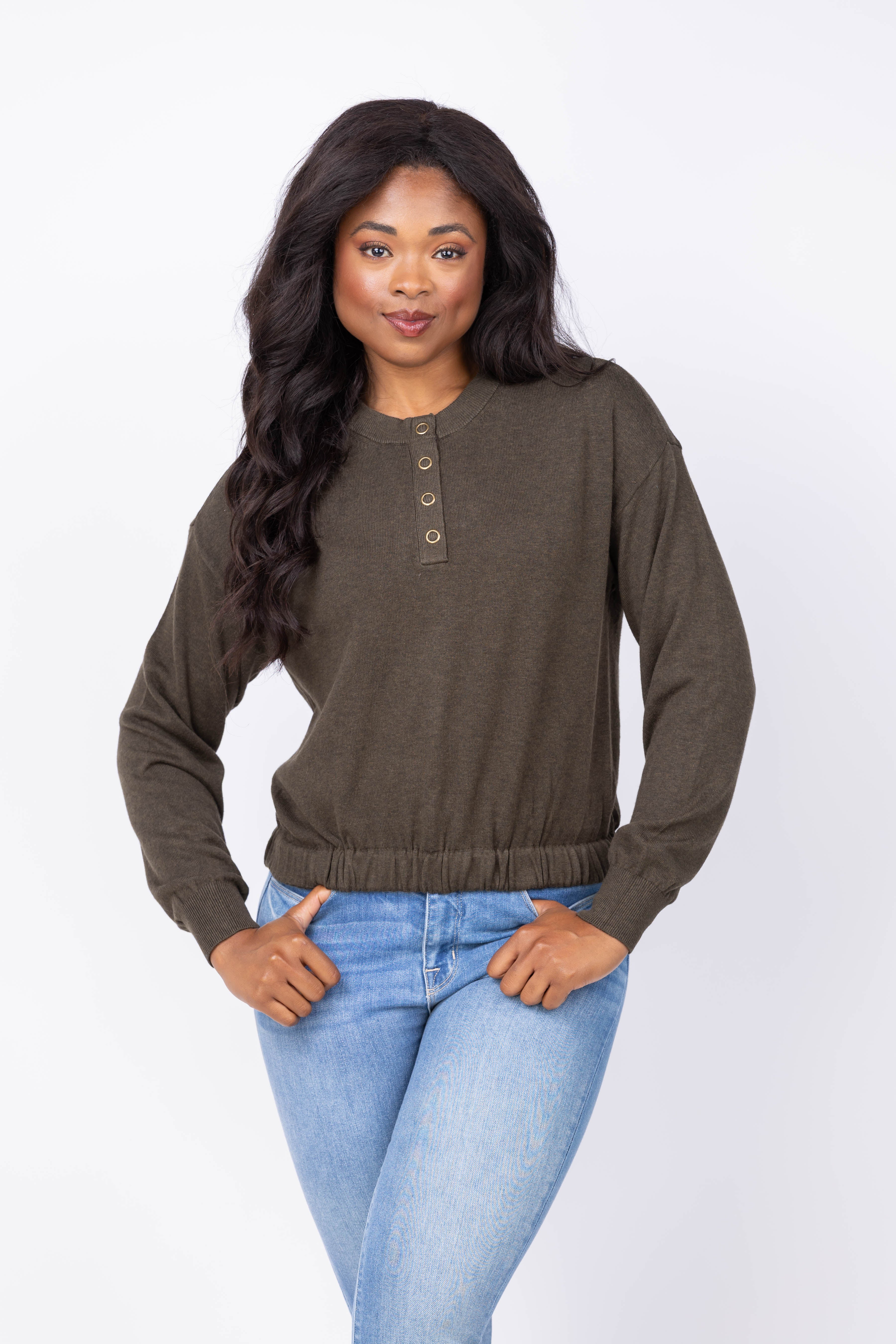 Experience effortless style with the Lilla P Elastic Waist Henley Sweater in Fir. Crafted from a soft Cotton Modal blend, this sweater offers a comfortable drape that moves with you. Its shorter length pairs seamlessly with high-waisted bottoms, creating a flattering silhouette. Relaxed dropped shoulders enhance comfort, while the Henley neckline with snap closure adds a casual, laid-back vibe. Perfect for everyday wear, this versatile piece combines comfort and style with ease.
