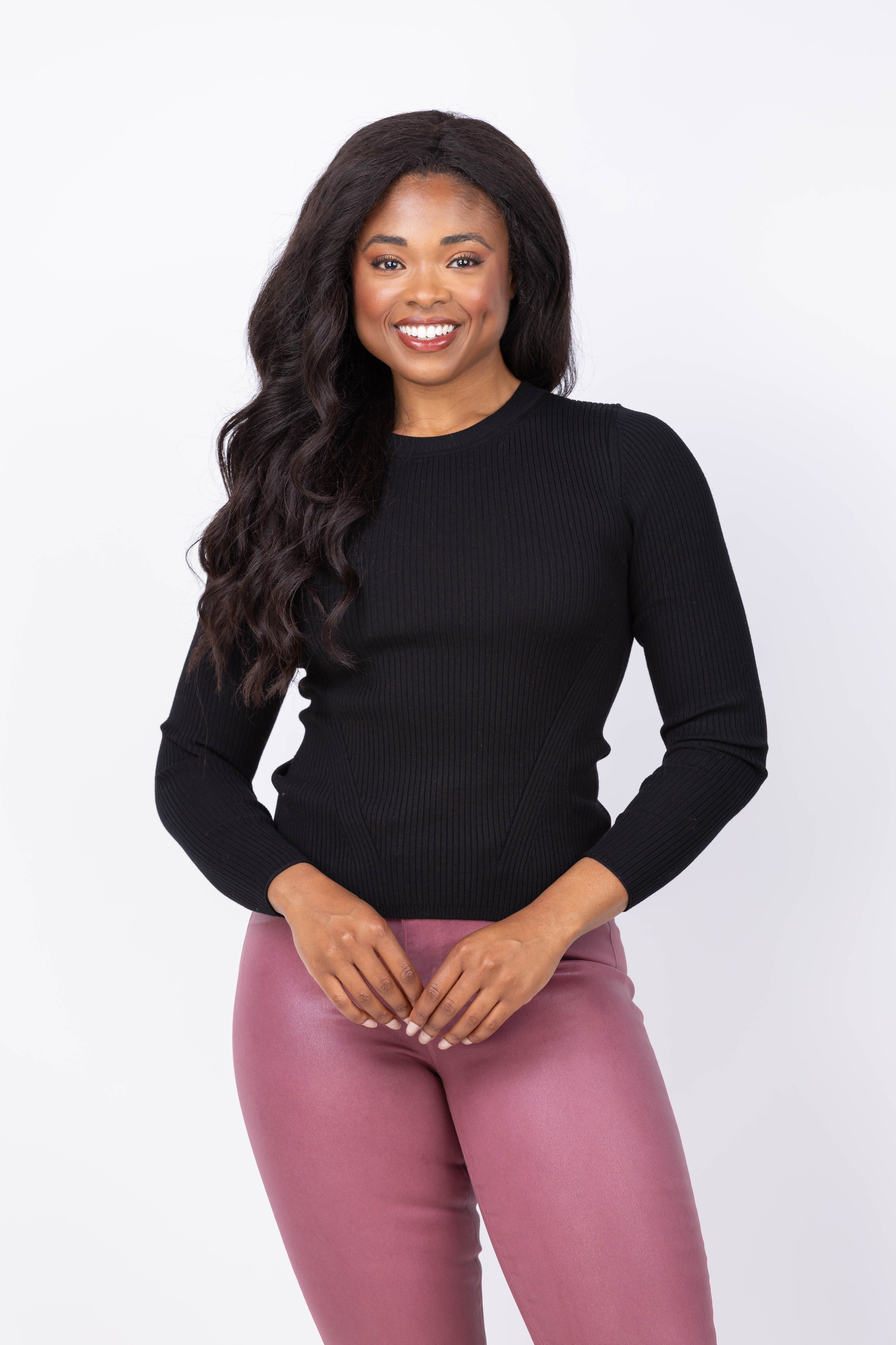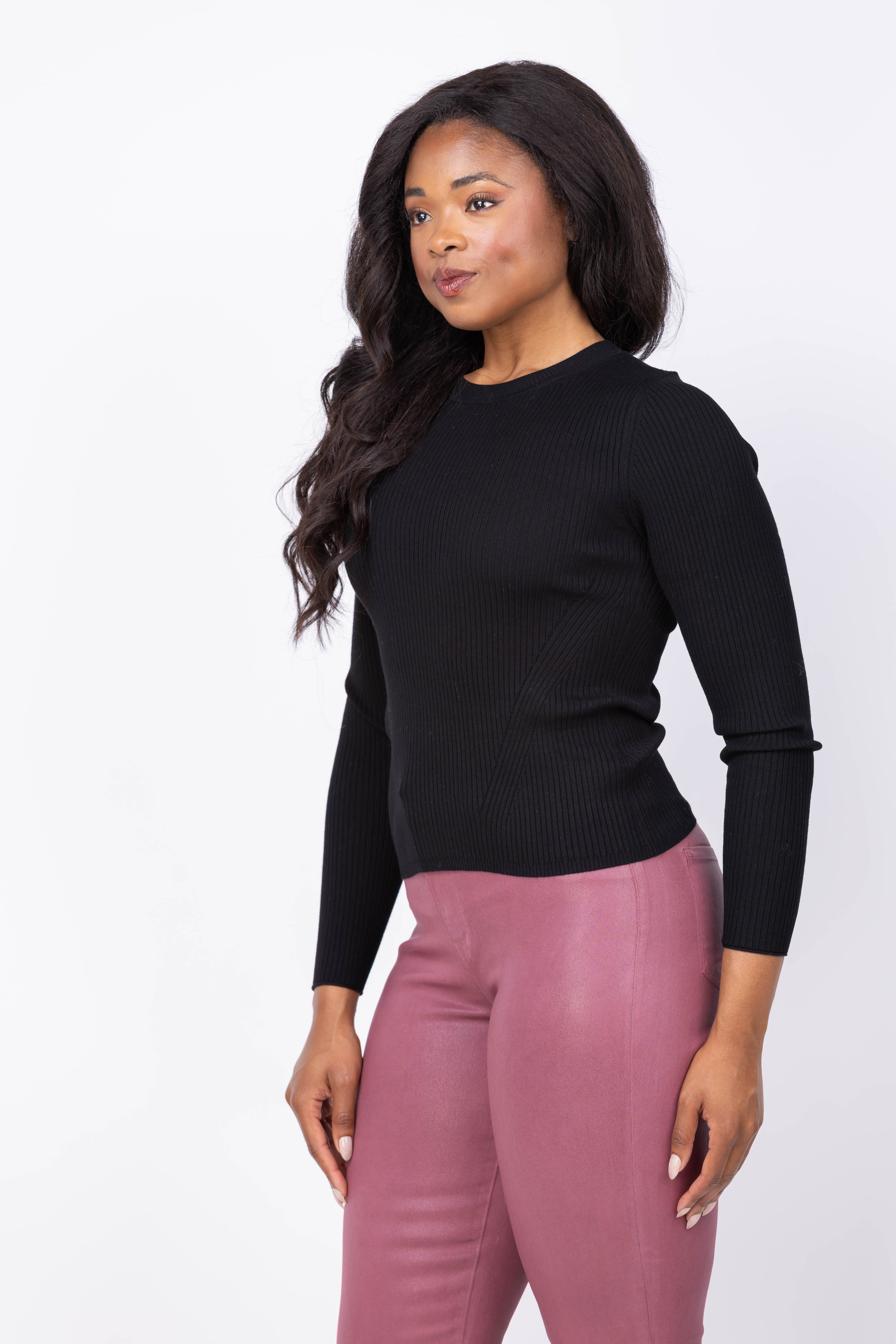Elevate your wardrobe with the Lilla P Fitted Crewneck Sweater in Black. Crafted from fine gauge stretch knit, it offers a sleek, polished fit that complements any outfit. The long sleeves and detailed ribbing add subtle sophistication, making it perfect for both solo wear or layering. Experience comfortable, refined style you’ll rely on through every season.