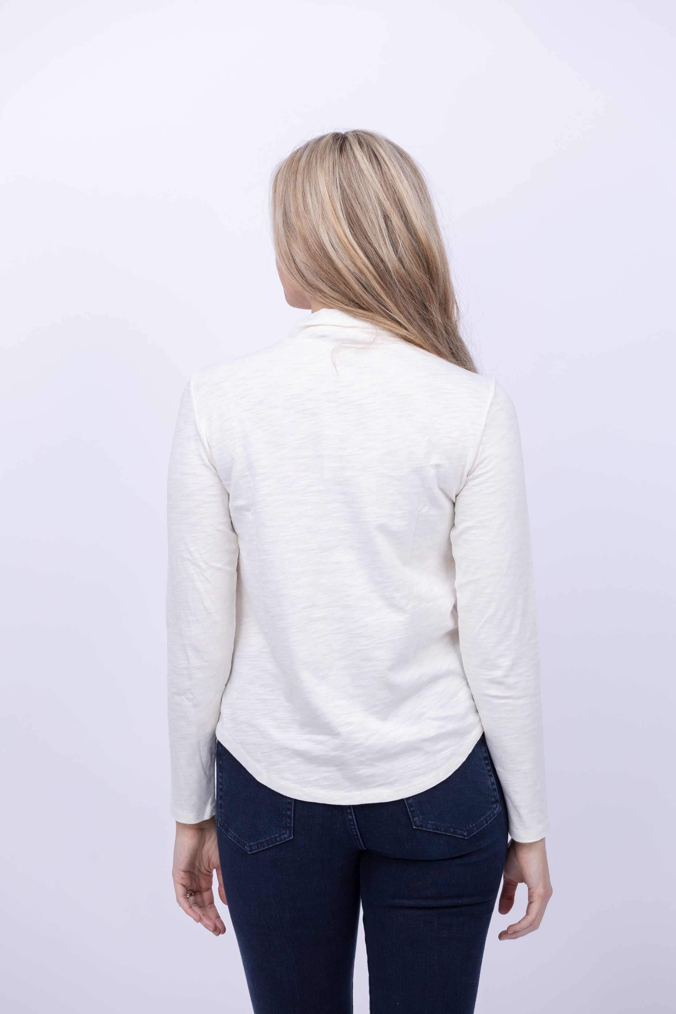 Feel cozy and look stunning in this Lilla P funnelneck t-shirt. It's crafted from 100% cotton Loose Knit Slub fabric, giving you a comfortable fit closer to the body. Its slightly longer length adds extra coverage and sophistication, perfect for pairing with a blazer or wearing on its own. Make a statement in this timeless classic.