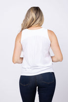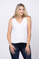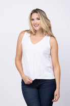 Experience the perfect blend of style and comfort with the Lilla P Shirred Back V-Neck Tank in White. Designed for versatility, it's the ideal choice for layering or wearing alone. Stay cool and comfortable this summer with its lightweight fabric. Add it to your wardrobe today!