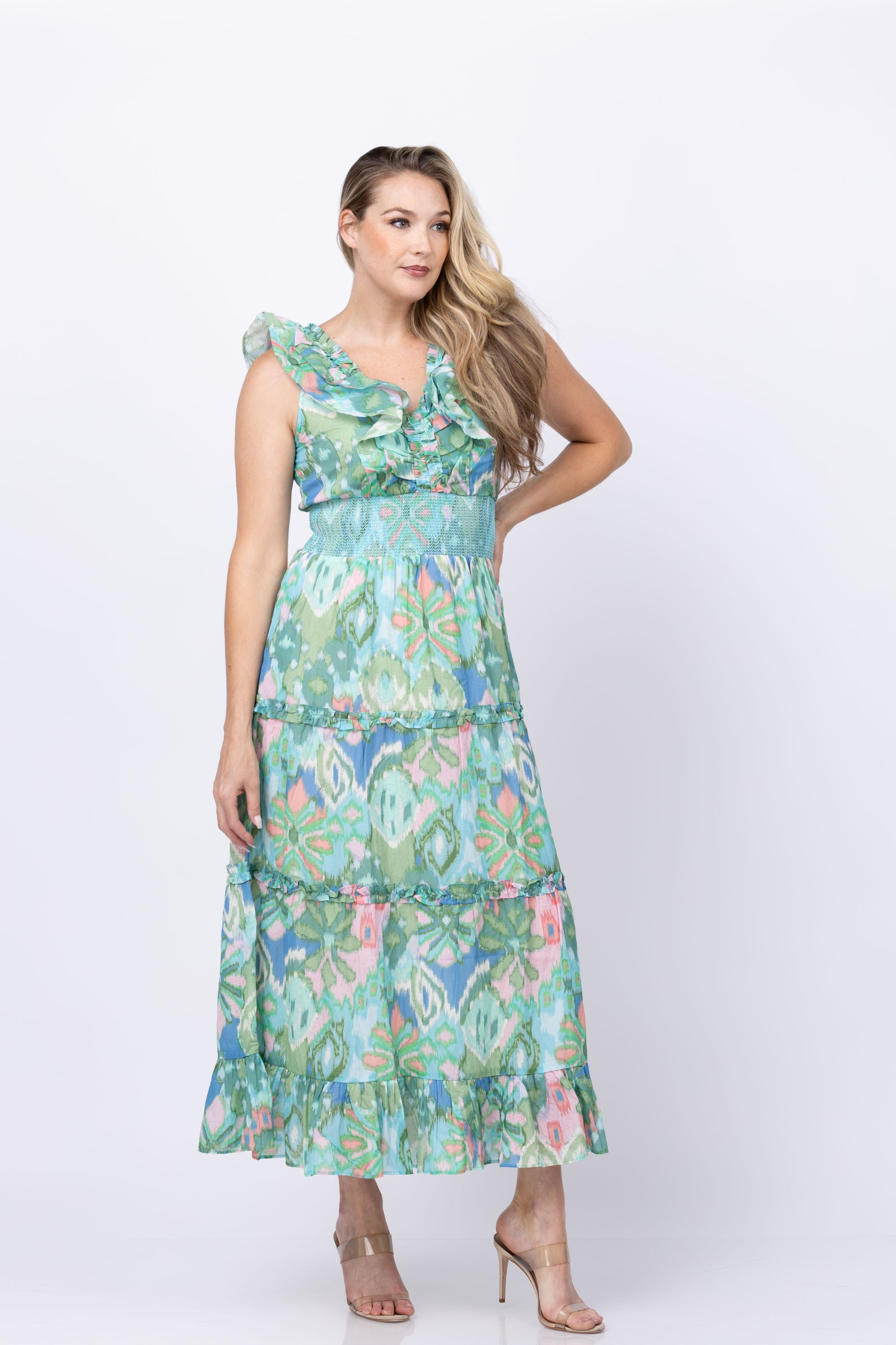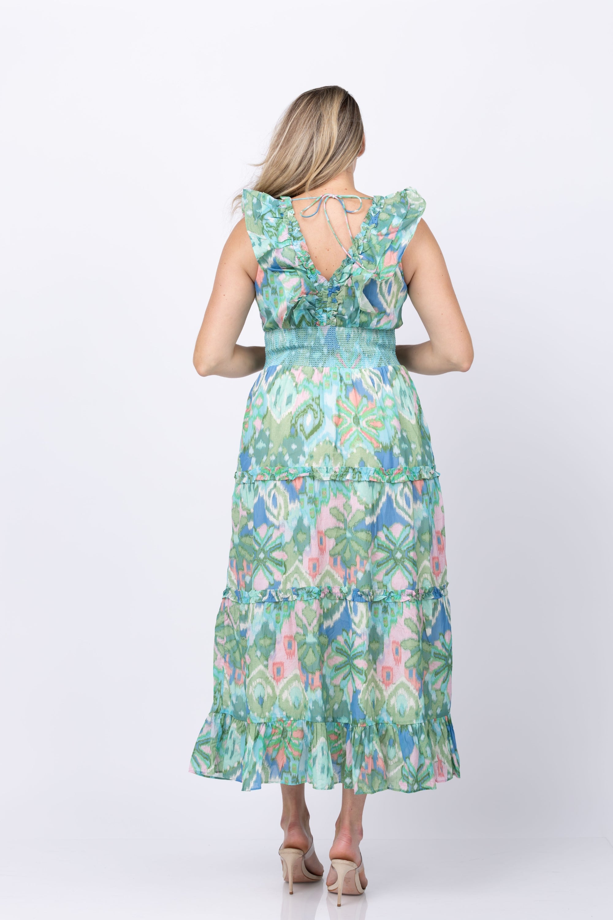 The Azalea Dress in Symphonic Ikat Bermuda combines a romantic empire silhouette with delicate ruffle straps and a flattering smocked waist for a perfect fit. Crafted from our signature sushi voile fabric, its feminine mini ruffle details add a touch of elegance. This versatile dress effortlessly elevates your wardrobe, making it a must-have for any occasion.