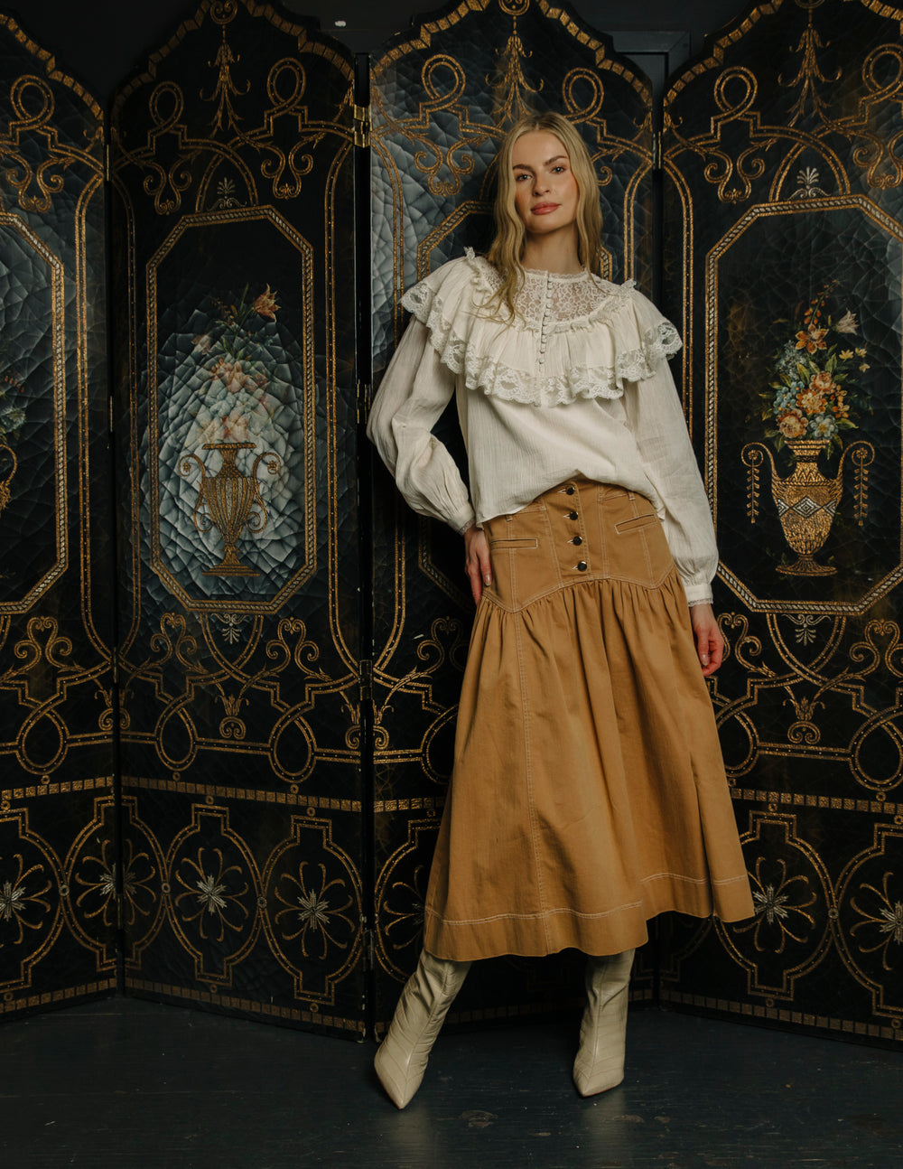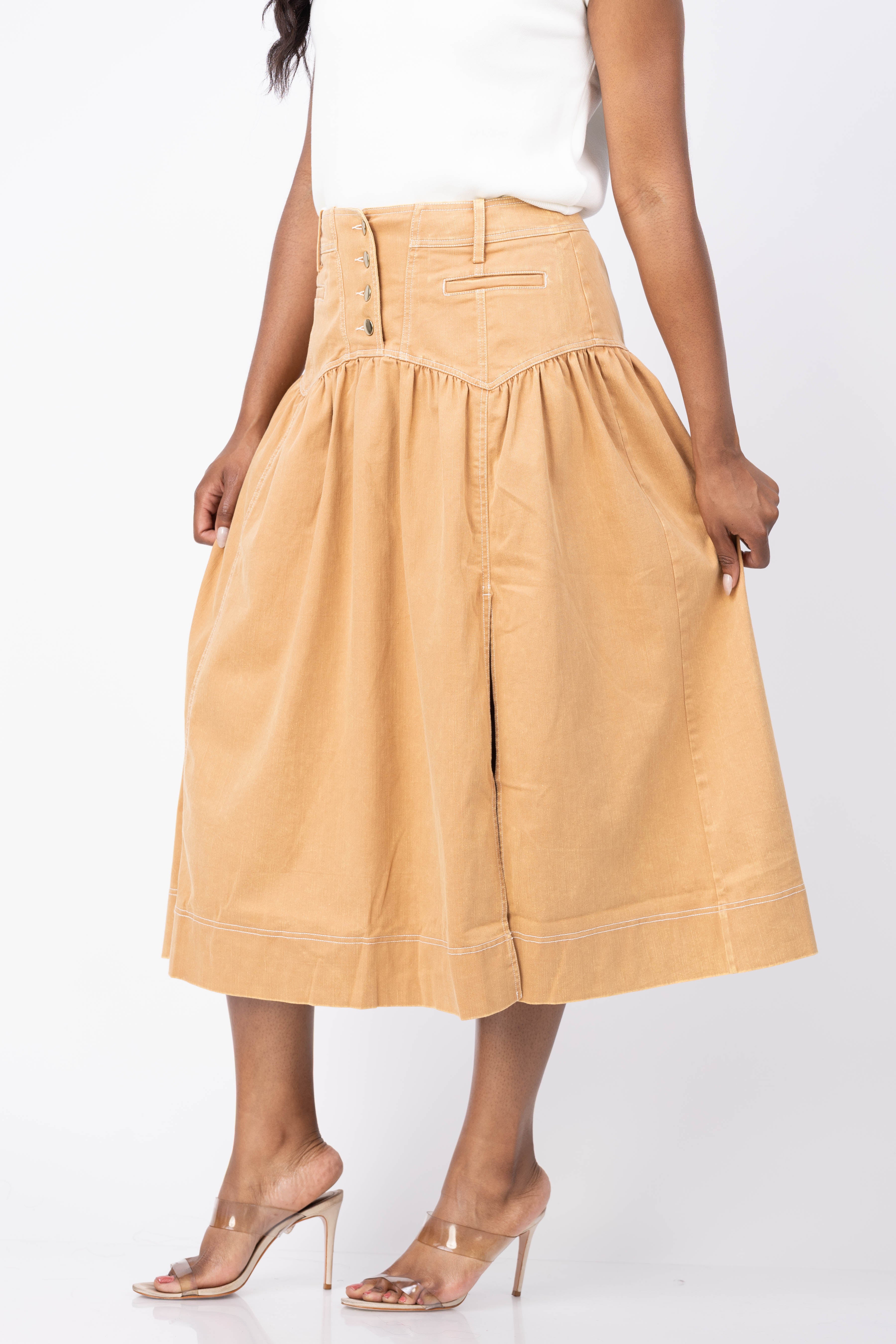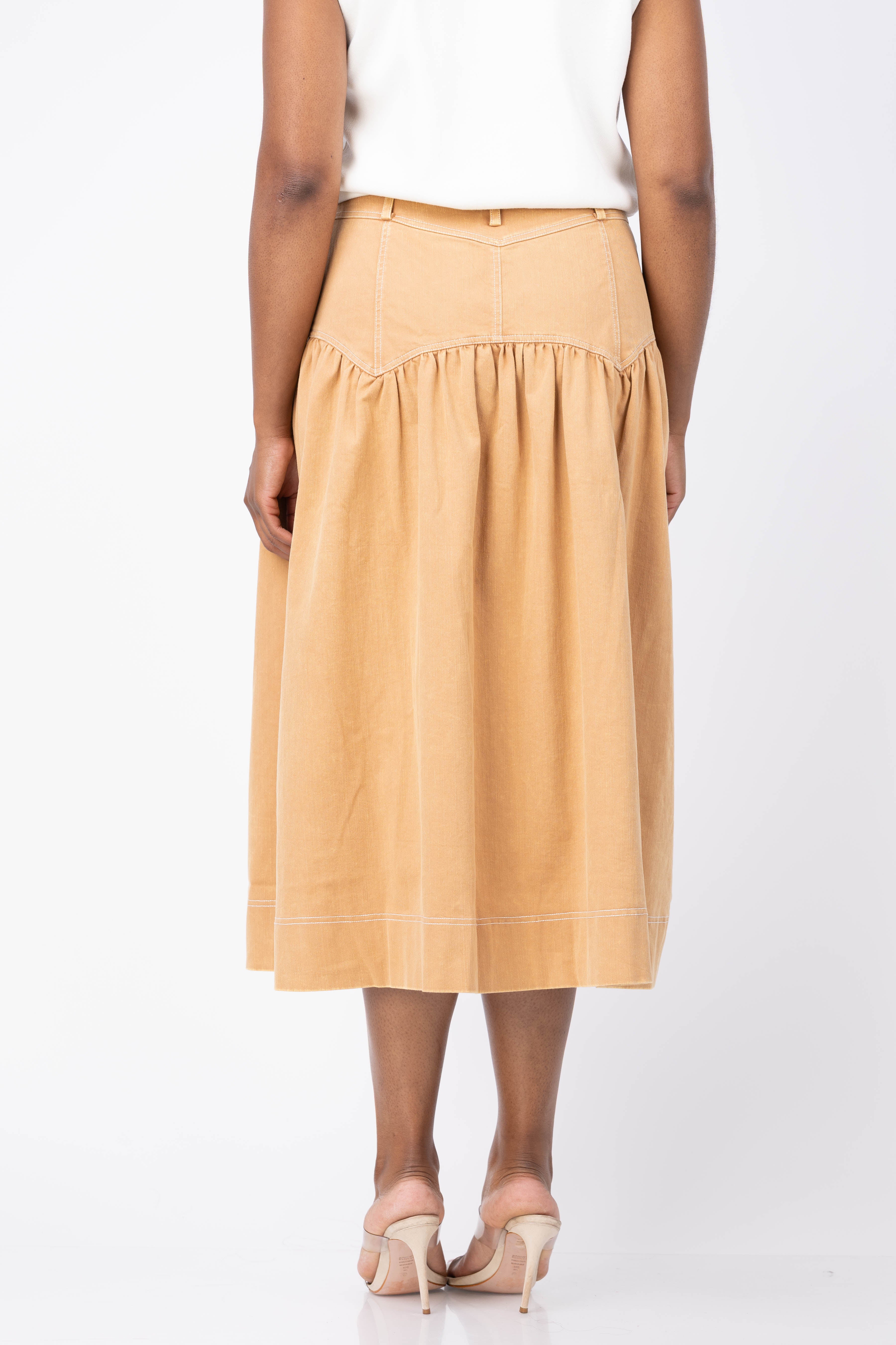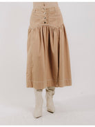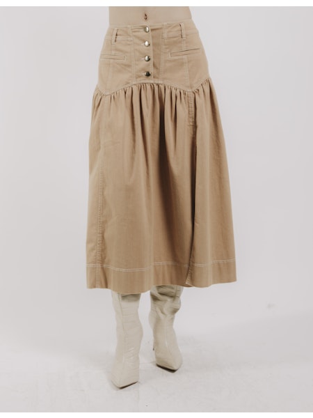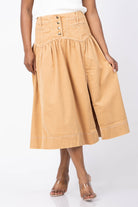 Discover the Love The Label Christine Skirt in Biscuit, crafted from our signature stretch denim for all-day comfort and style. Its soft gathers and modern yoke shape create a flattering silhouette that effortlessly blends practical wearability with feminine charm. Perfect for dressing up or down, this skirt offers versatility without sacrificing elegance. Elevate your wardrobe with a piece that moves with you and highlights your natural grace.