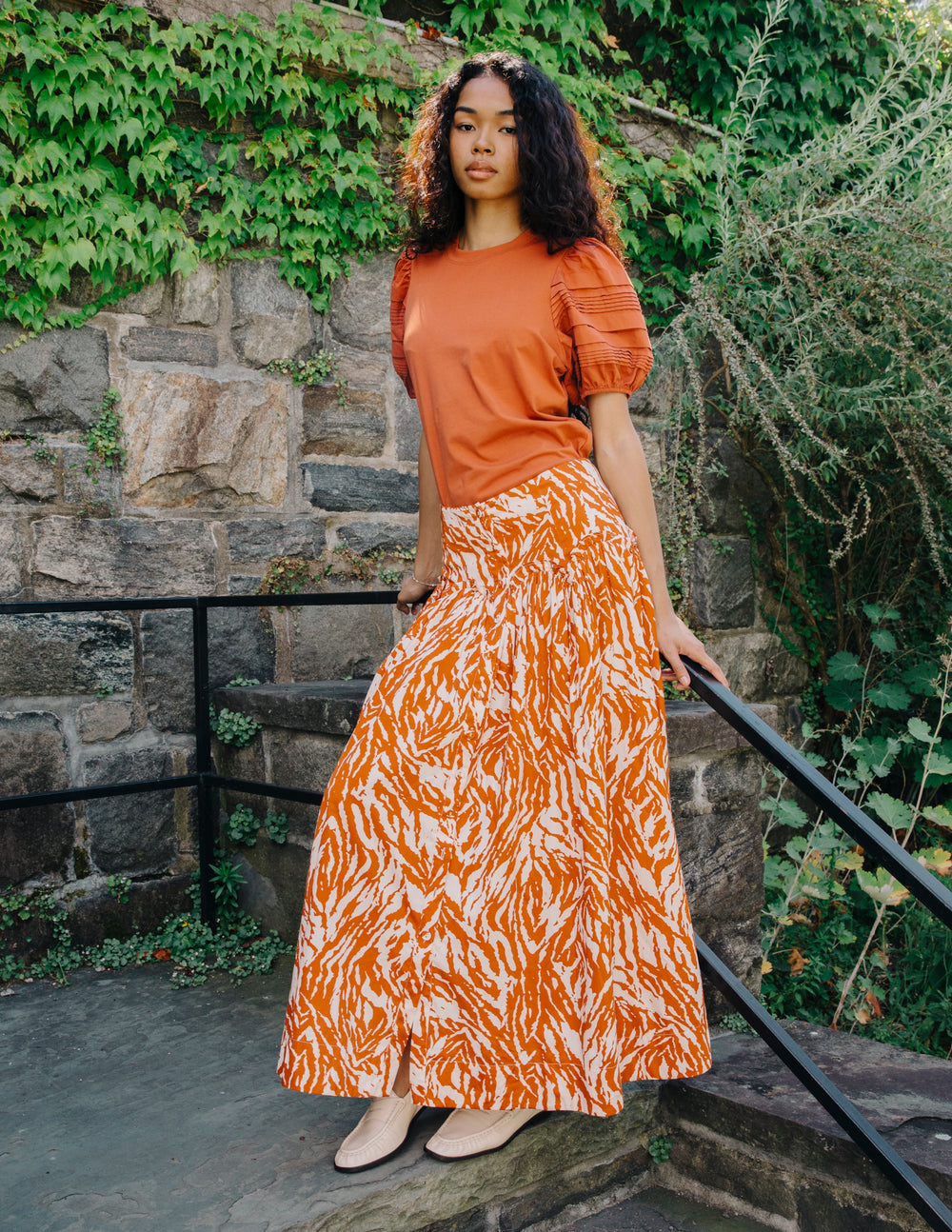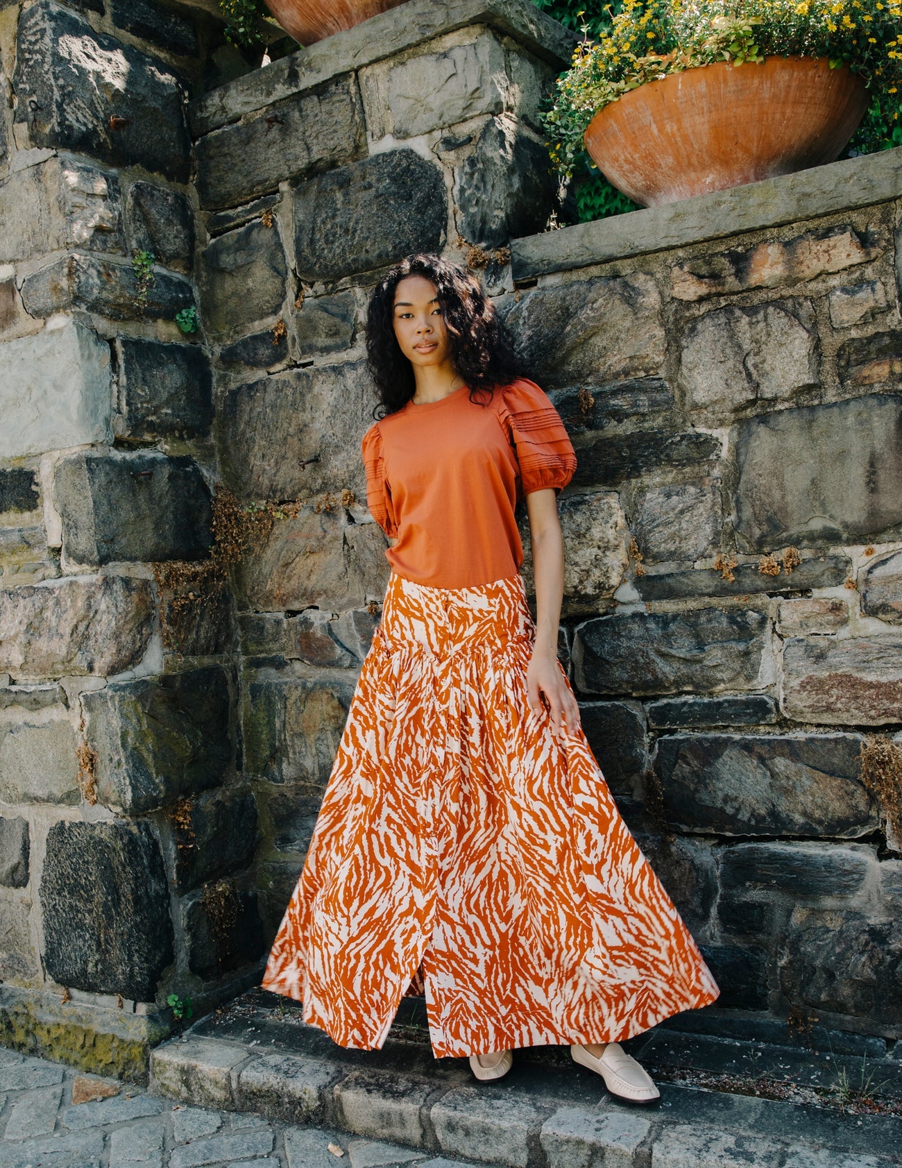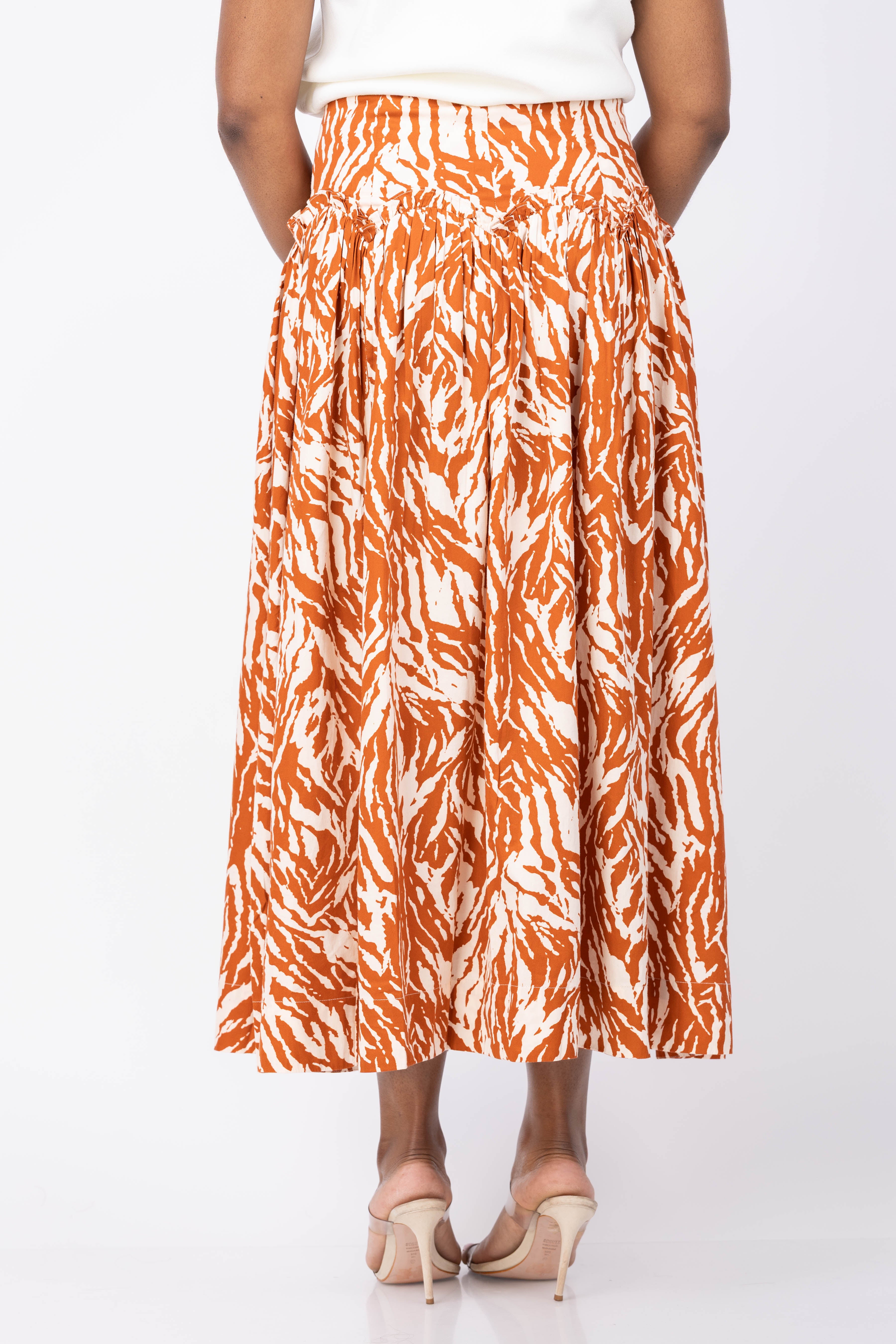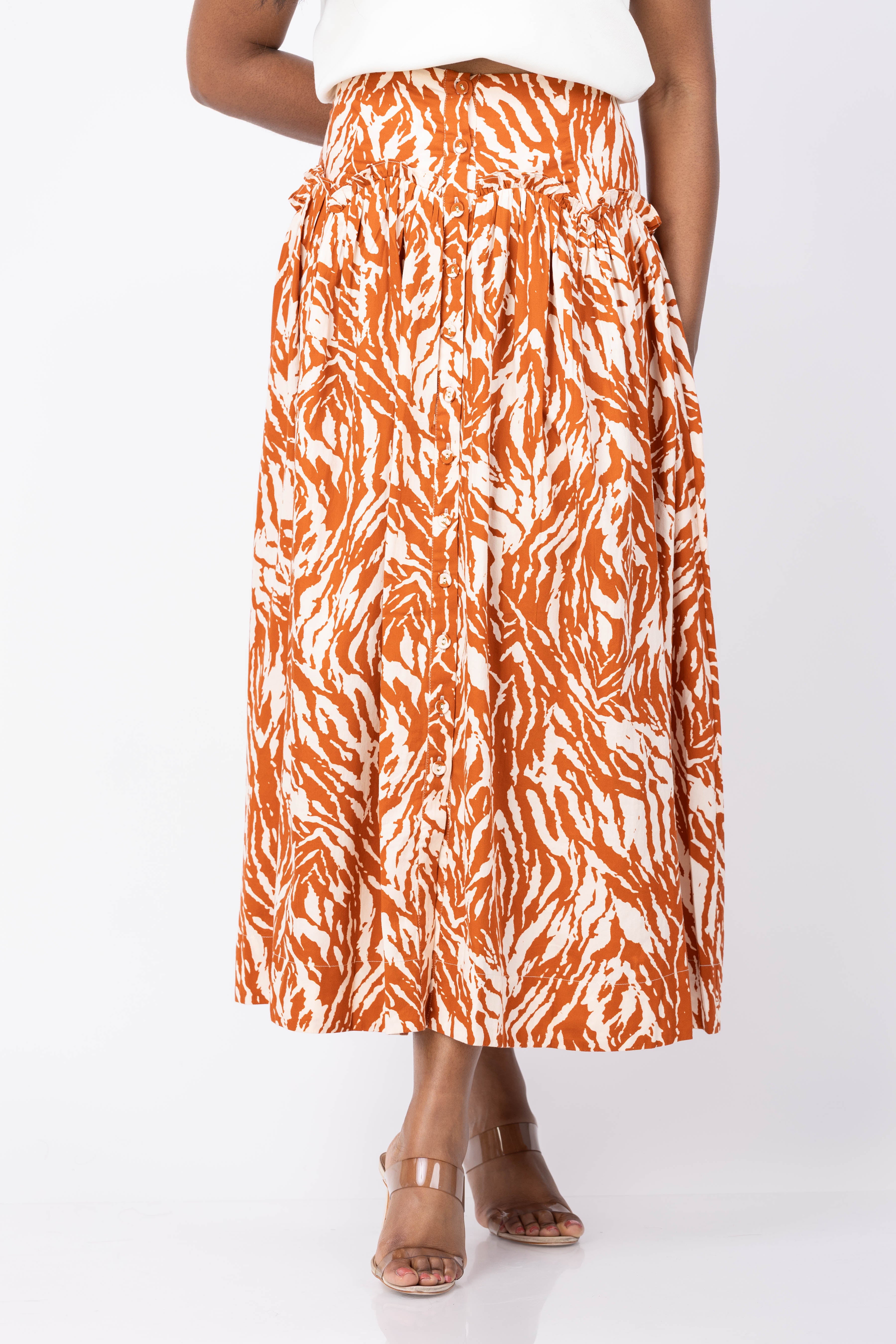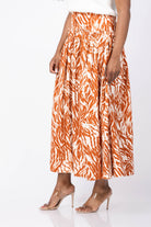 The Love The Label Crystal Skirt in Terracotta Zebra Print showcases a striking abstract animal pattern that adds vibrant personality to your wardrobe. Its flattering scallop silhouette enhances your figure, while fabric-covered buttons down the front provide a refined, stylish detail. Perfect for making a statement, this skirt combines bold design with elegant tailoring to elevate your everyday and special occasion looks.