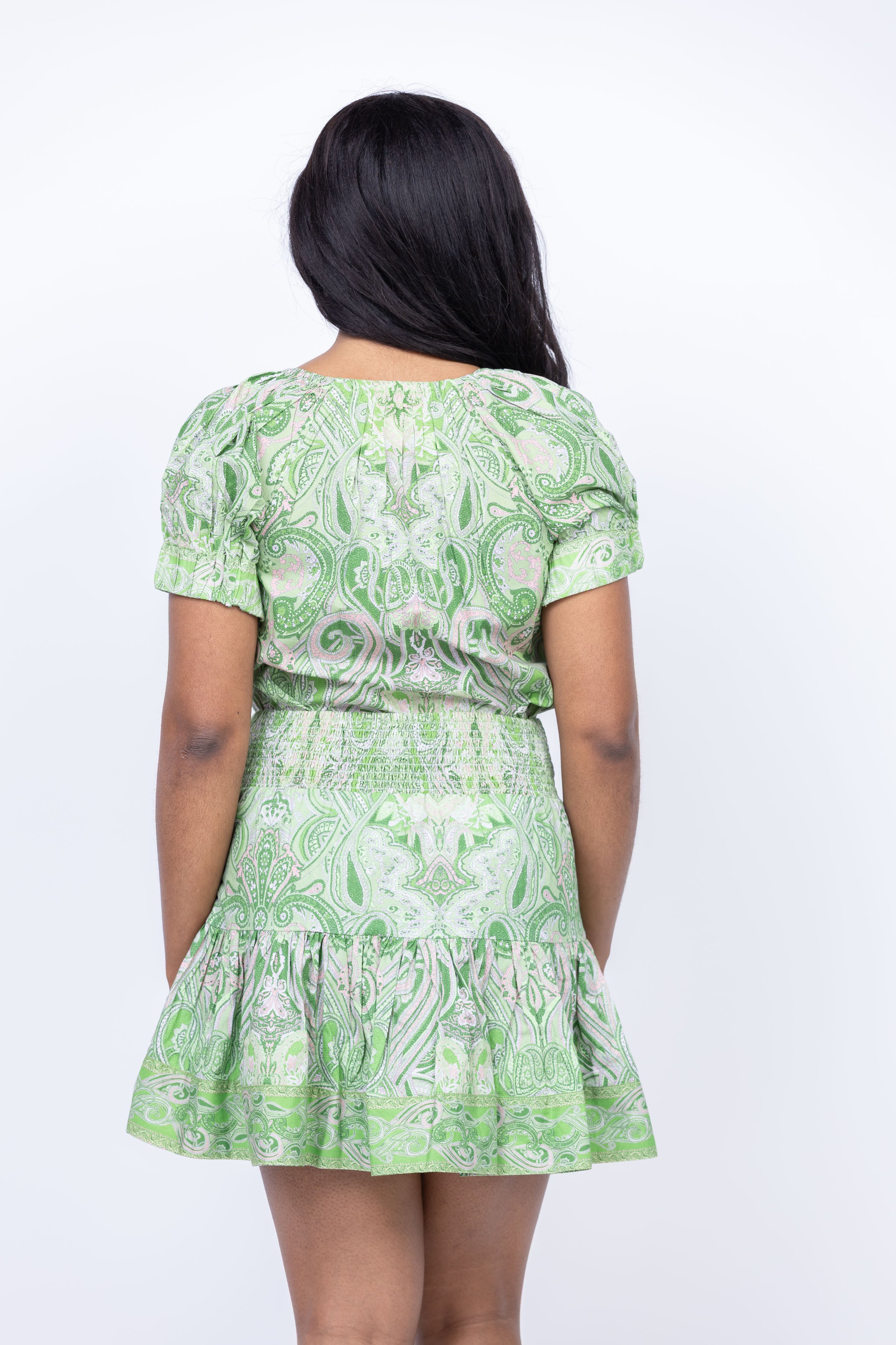 Elevate your wardrobe with the Love The Label Dawson Top in Mason Paisley Green. With its classic design and encased elastic at the sleeve bottom, this versatile top adds a touch of elegance to any outfit. Wear it tucked into denim or paired with the Ruby Skirt for a complete set.