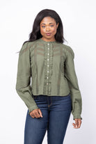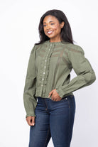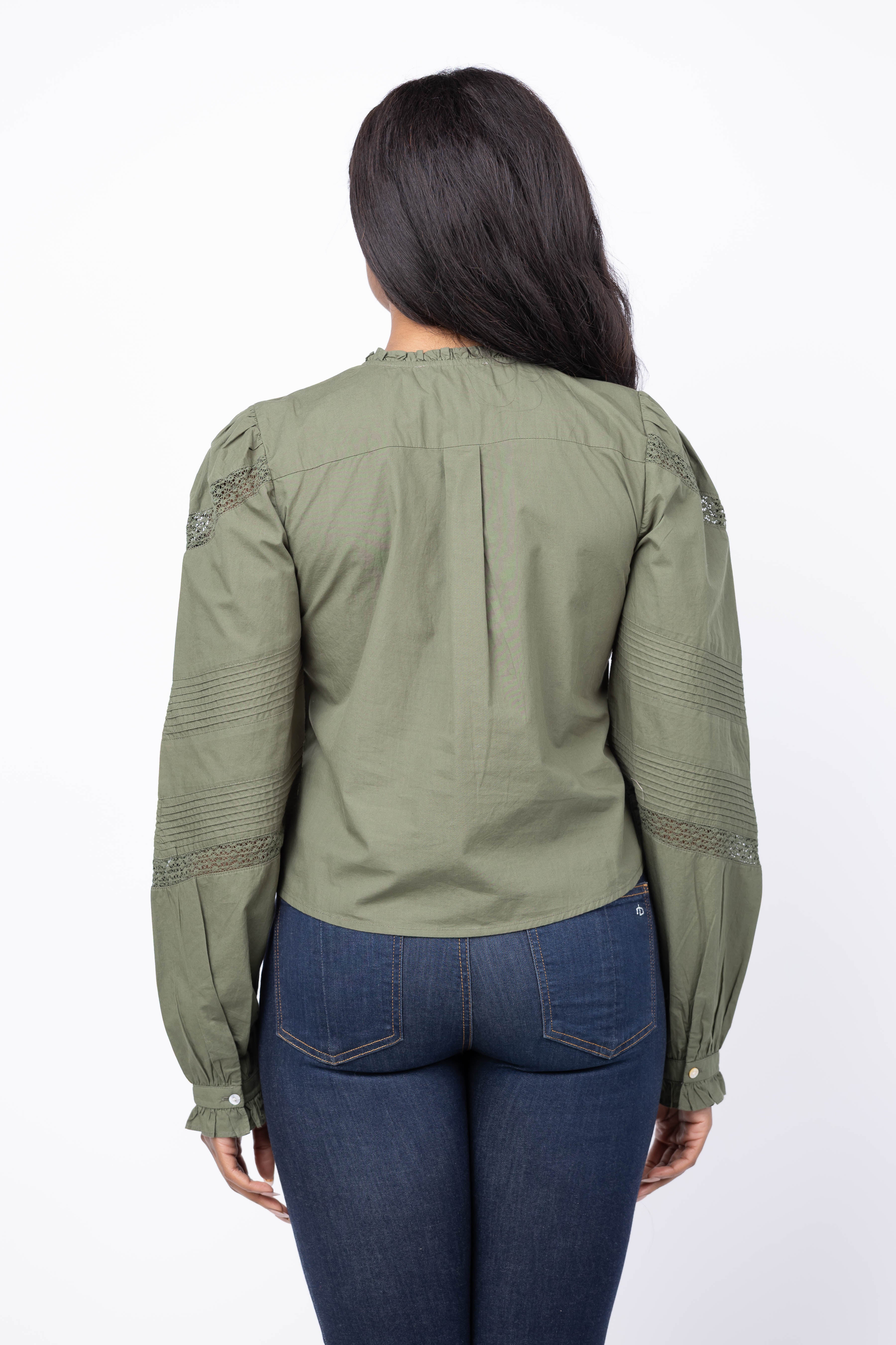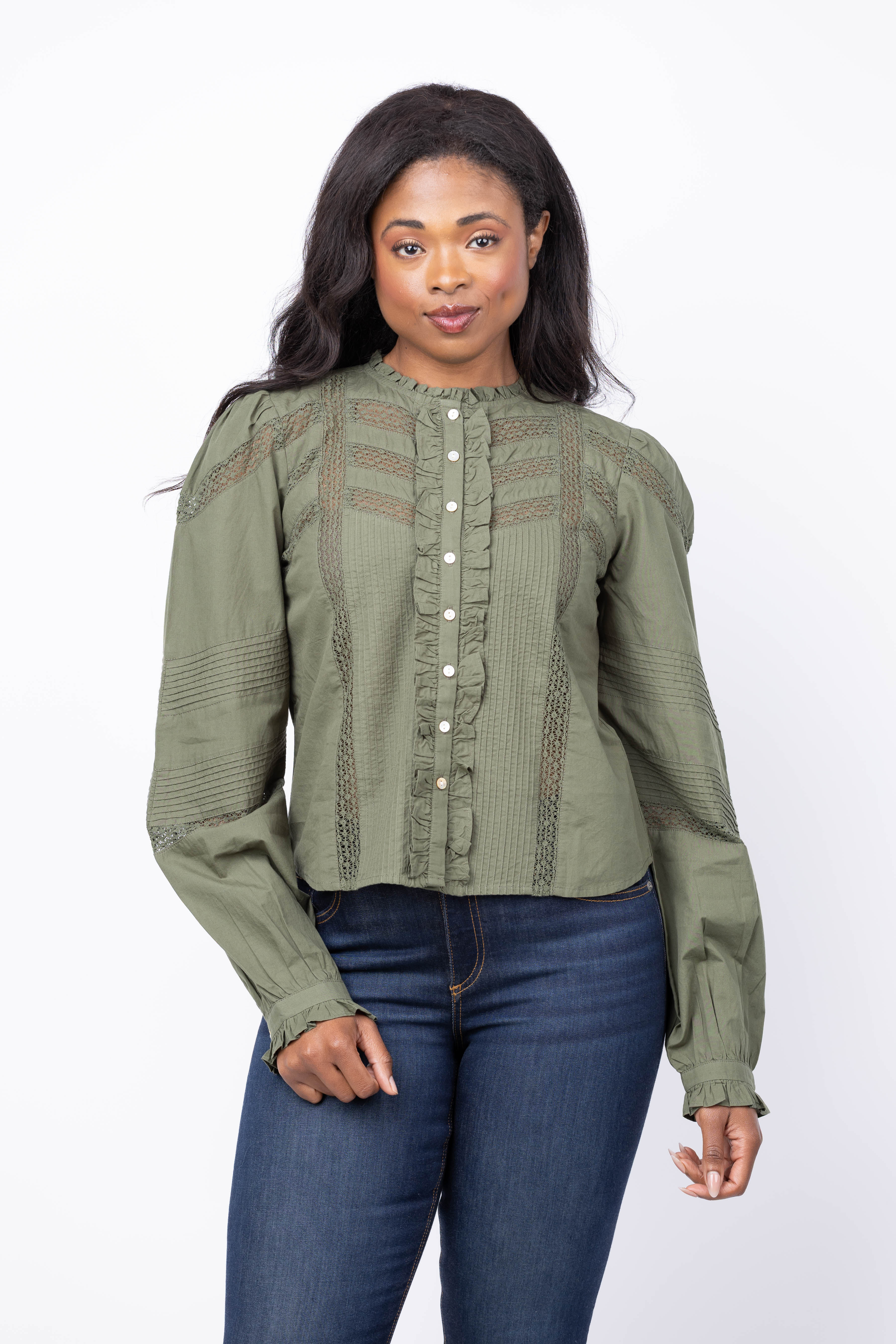 The Love The Label Delia Top in green combines delicate lace insets with elegant pintuck details, creating a sophisticated and feminine look. Its puff sleeves add a charming touch, making this top perfect for both daytime outings and special occasions. Embrace effortless style and grace with this beautifully crafted piece.