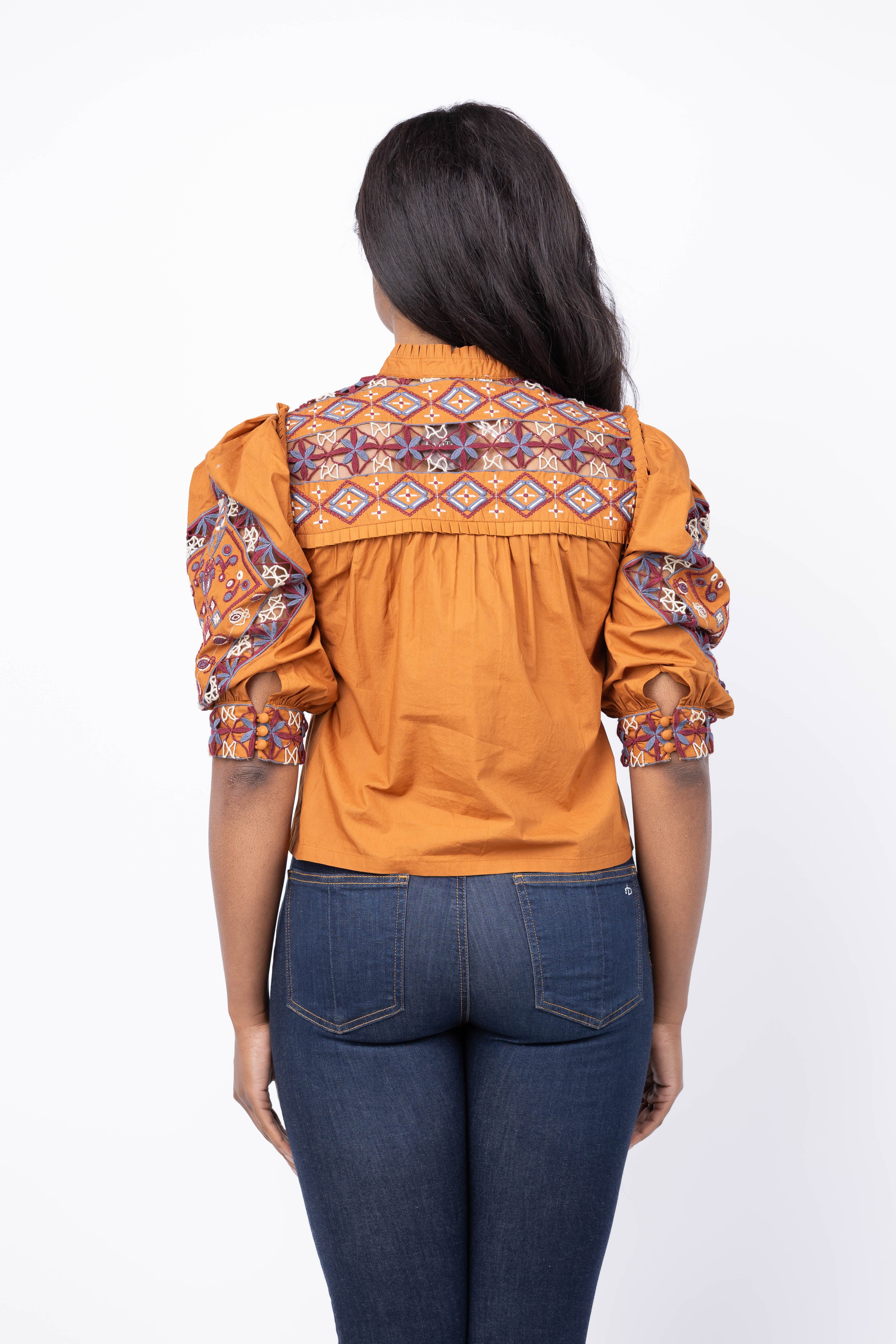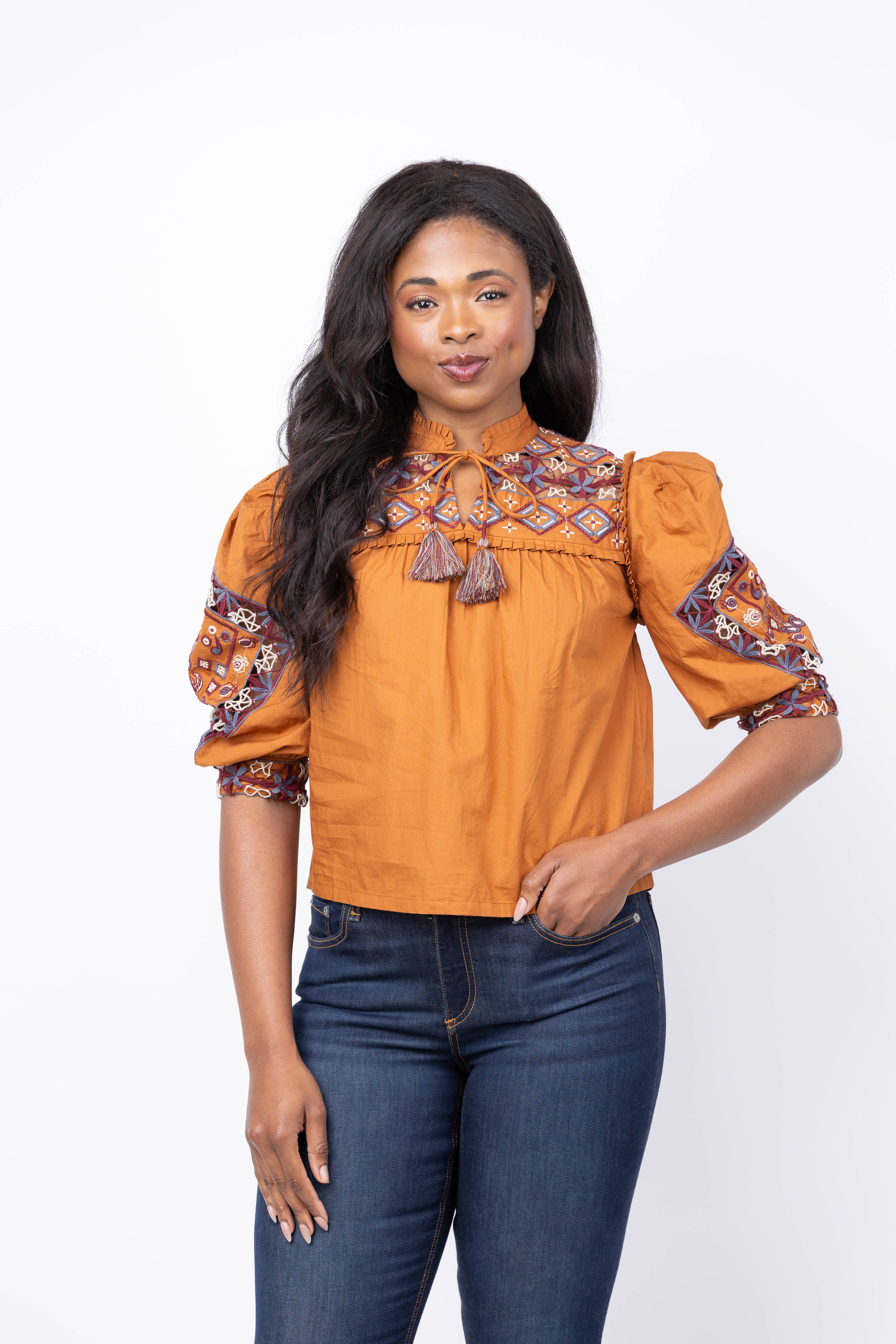 The Diella Top in Caramel combines elegant embroidery with playful puff sleeves, creating a unique bohemian-inspired look. Its rich caramel color adds warmth to any outfit, while tassel ties provide a charming finishing touch. Perfect for elevating your style with effortless detail and feminine flair.