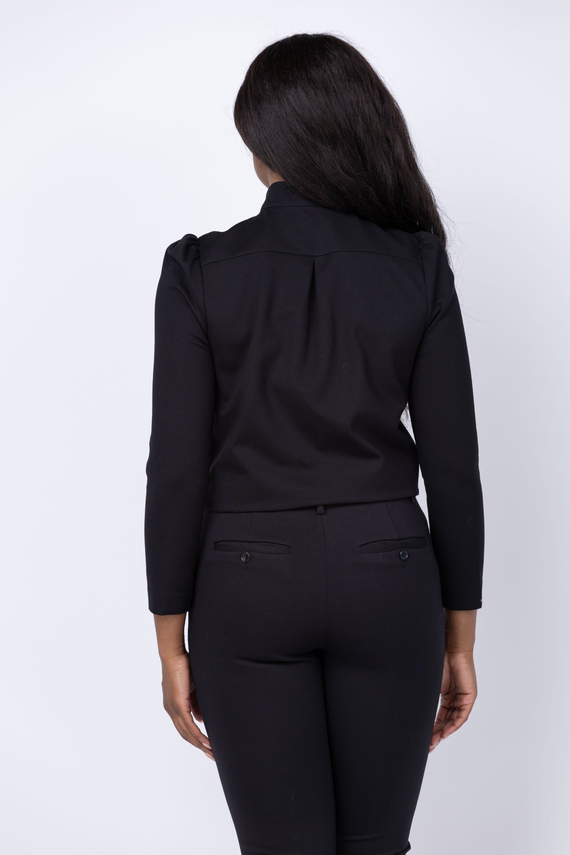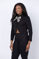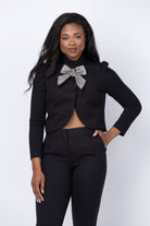 Get ready to make a statement with the Love The Label Regina Jacket in Black! This stunning jacket features a structured silhouette that is sure to turn heads. Complete with an oversized detachable crystal-embellished bow, this jacket adds instant glamour to any look. Perfect for evening events or festive occasions.