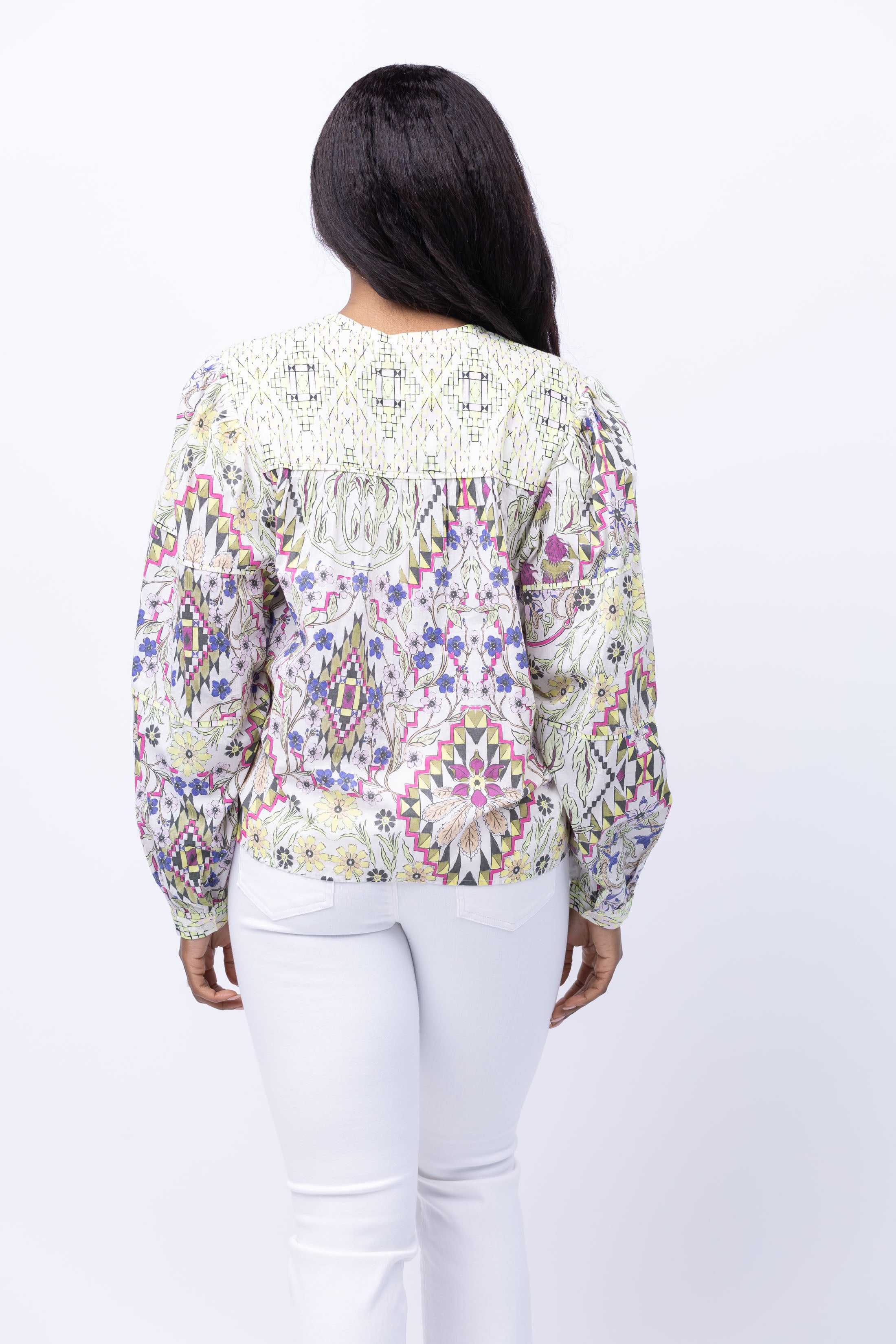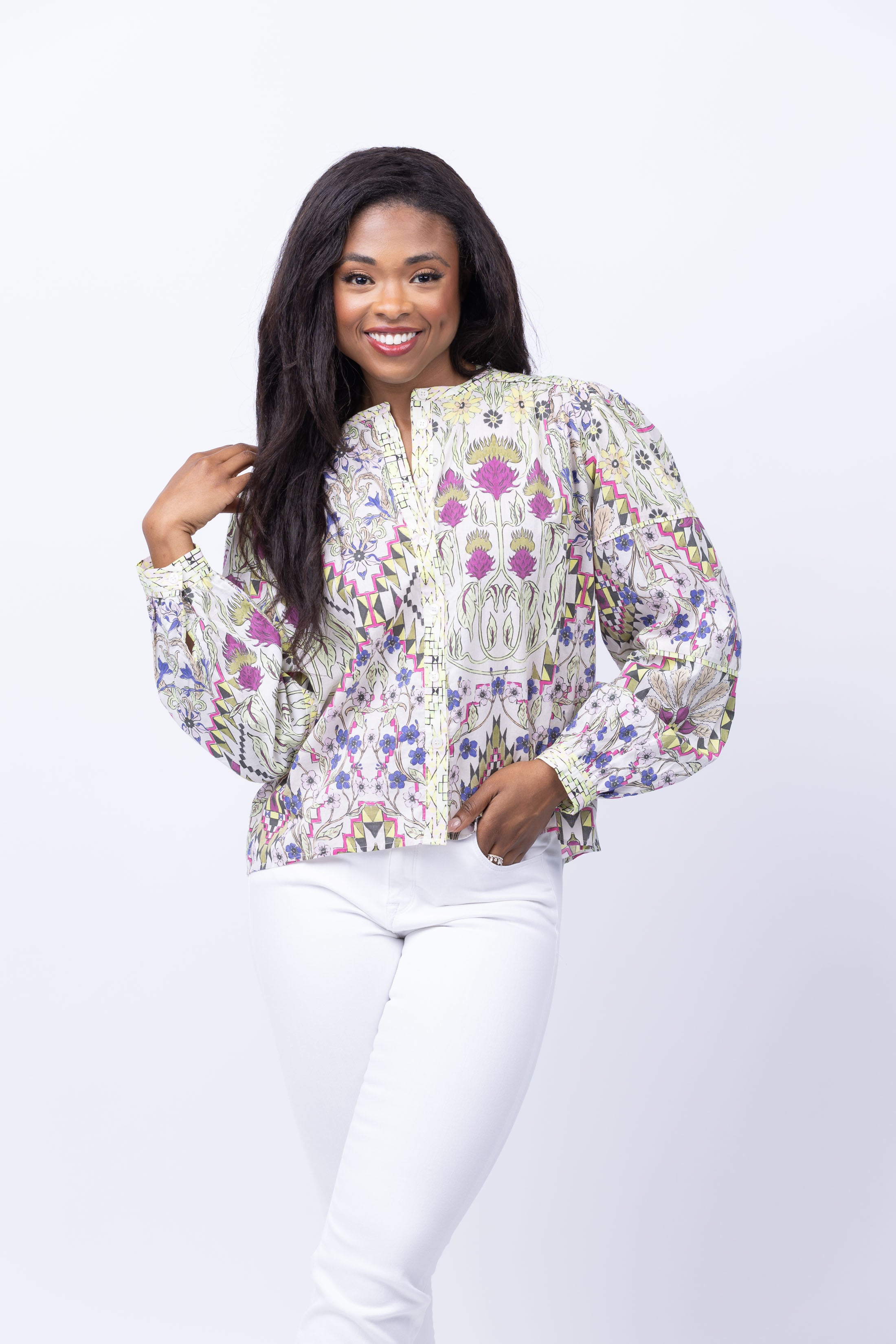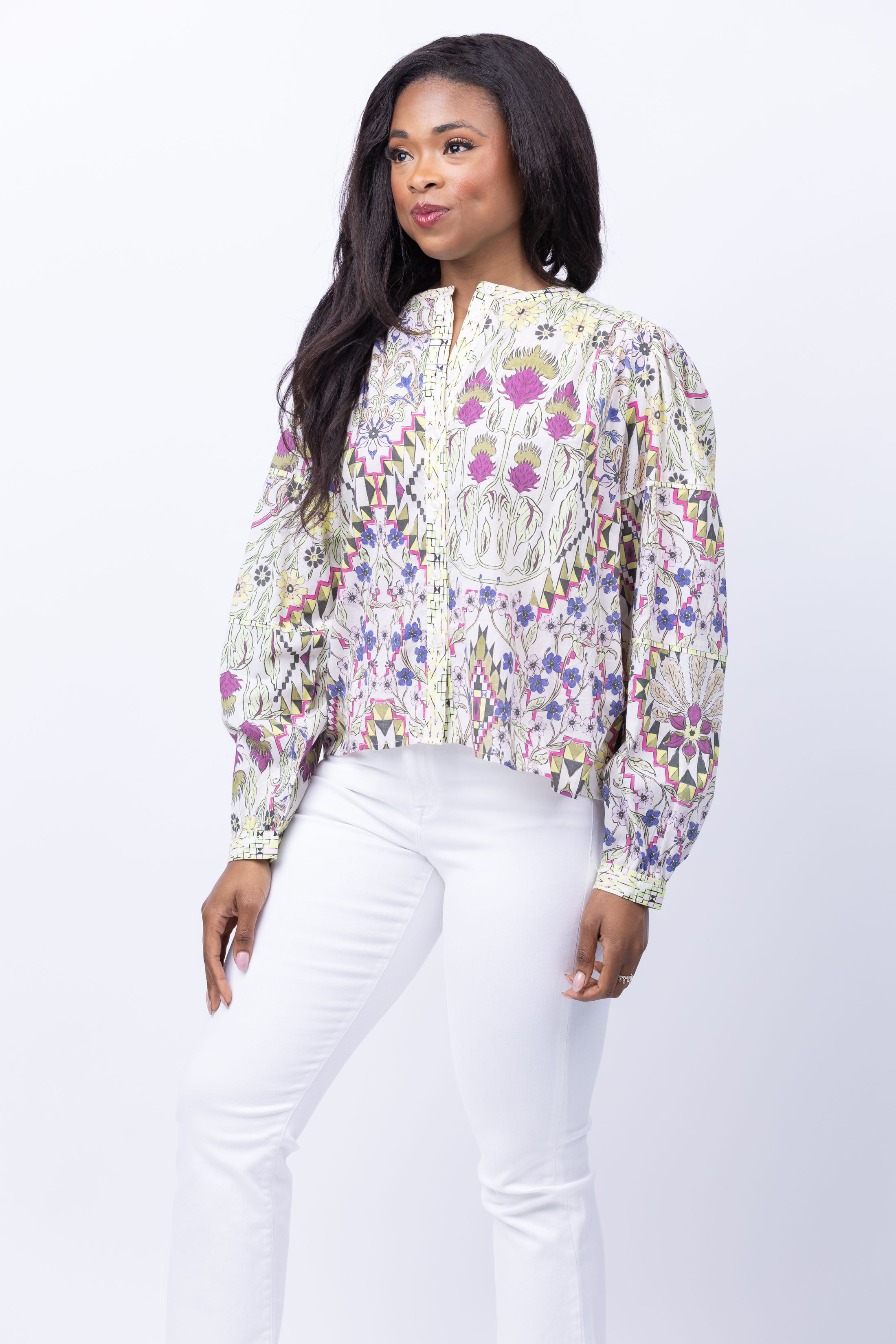 Introducing the Maria Cher Esquel Keisy Blouse in Mix 1 - effortlessly stylish and lightweight, this beautiful printed blouse is the perfect combination of comfort and style. With a button-up design and a range of perfect colors to choose from, elevate your wardrobe with this must-have long sleeve blouse!
