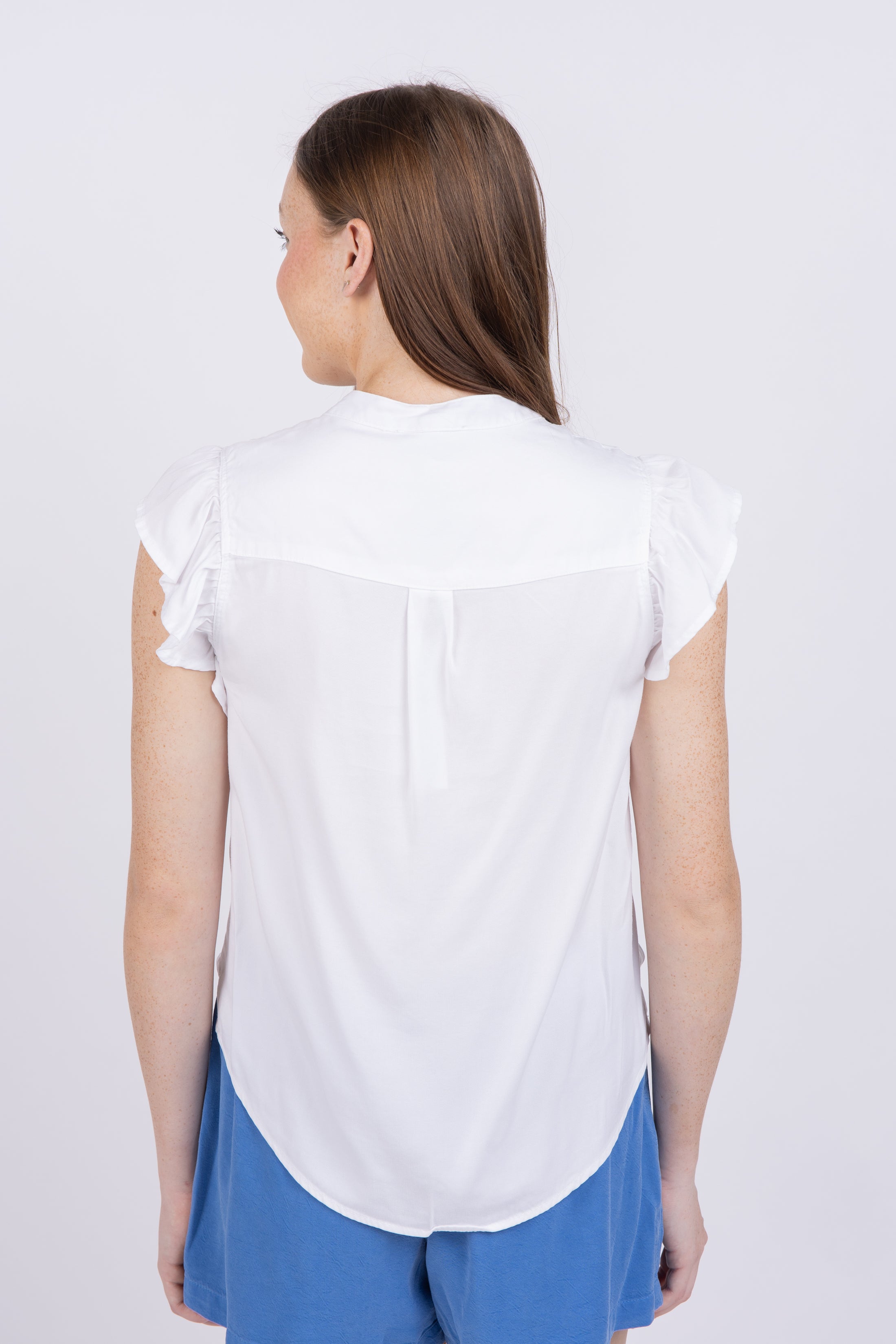Wear timeless sophistication with Maven West’s Ruffle Short Sleeve Button Down. Completely crafted in white for a classic look, it’s the perfect touch of class for those timeless moments in life. Elevate your wardrobe with timeless elegance.